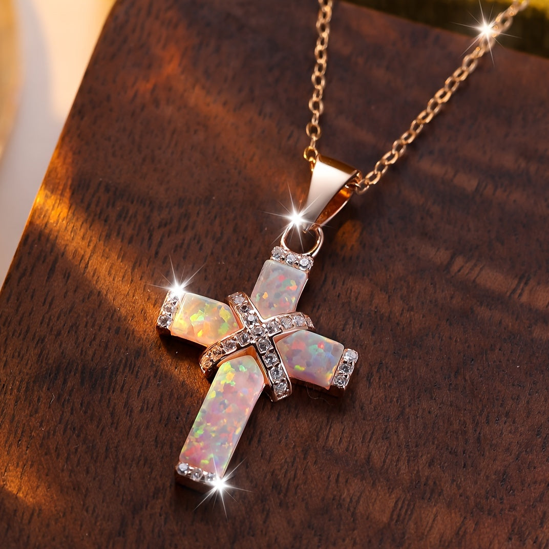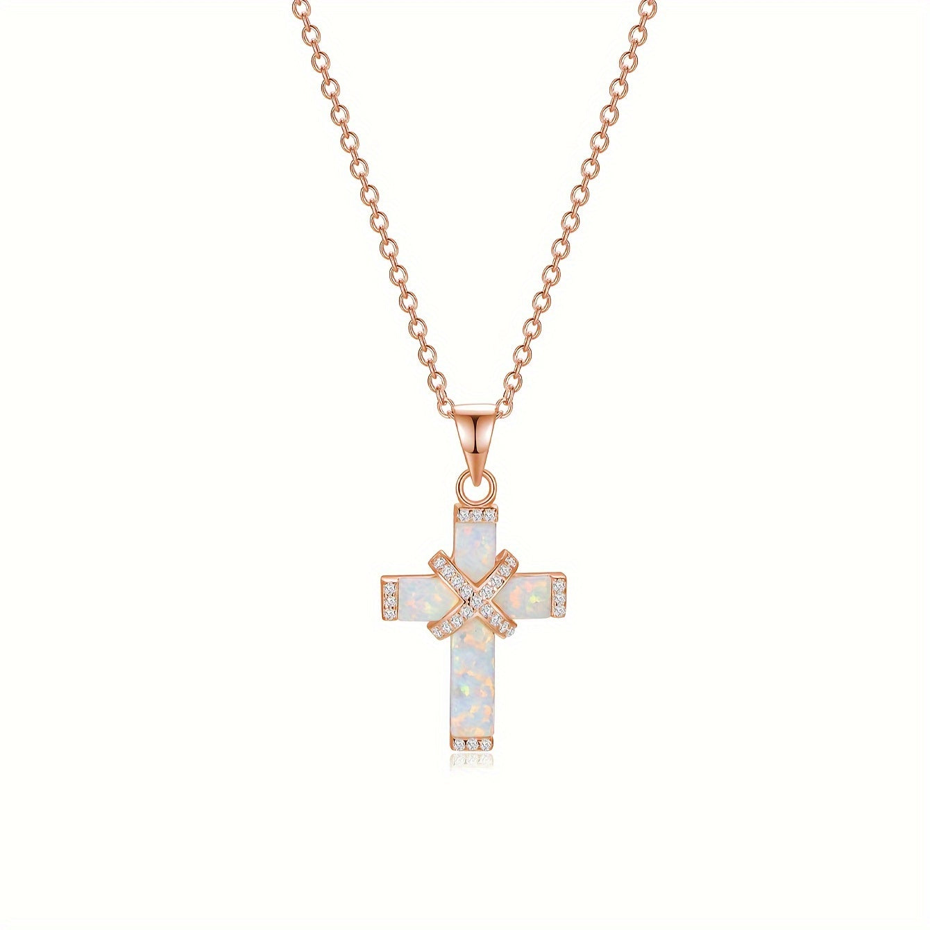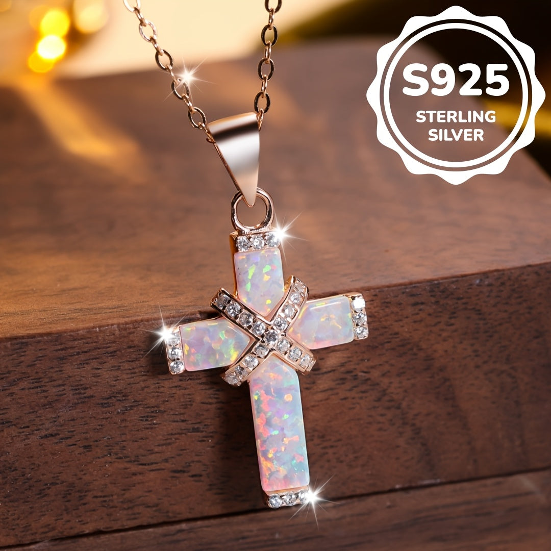 This stunning cross necklace features a synthetic Australian opal set in pure 925 sterling silver. A beautiful accessory for everyday wear or special occasions.