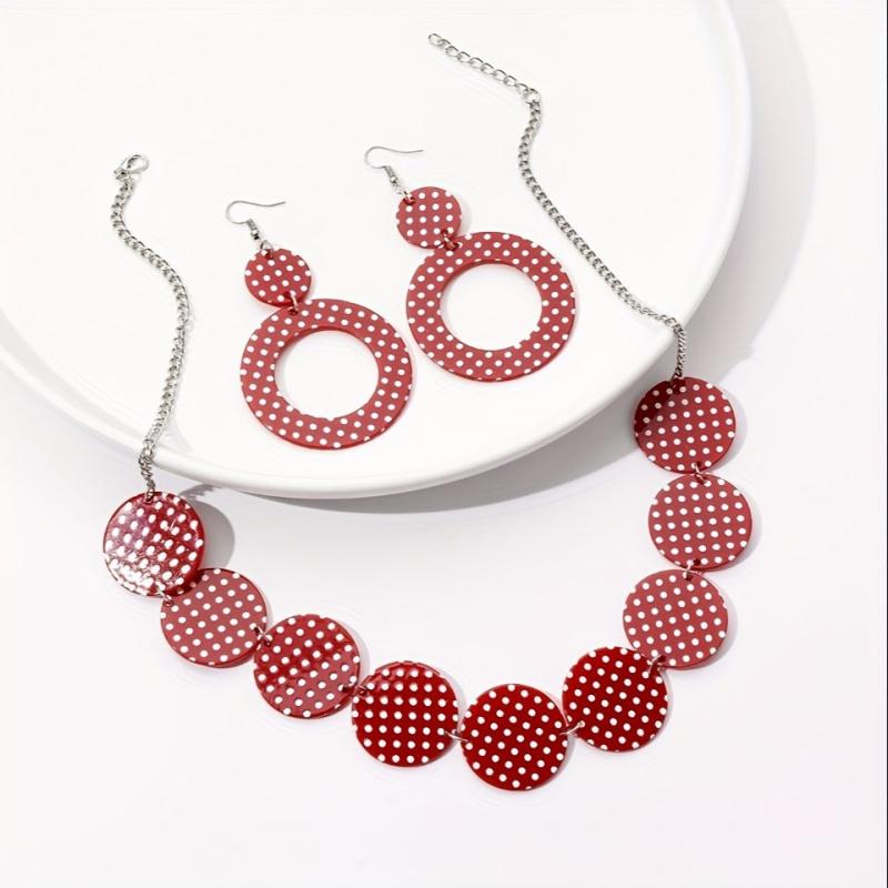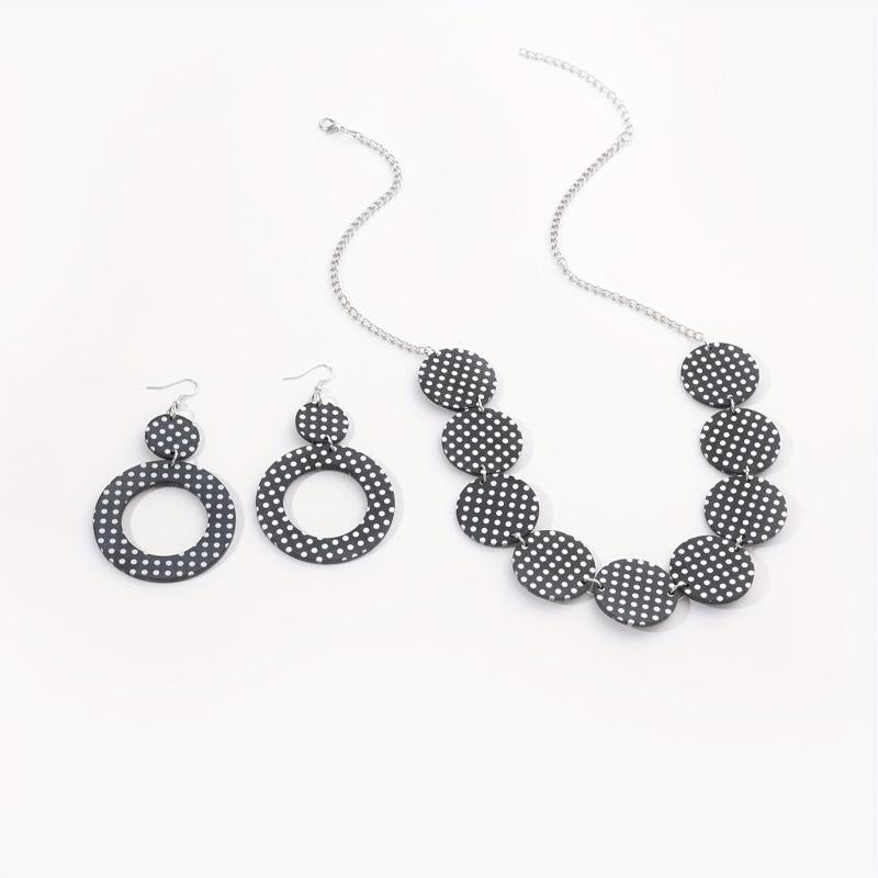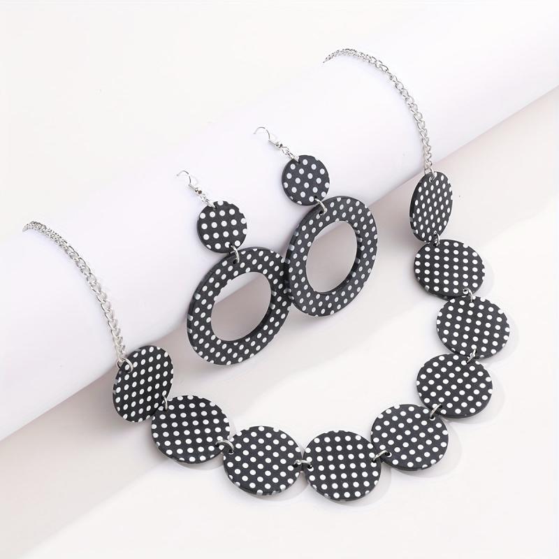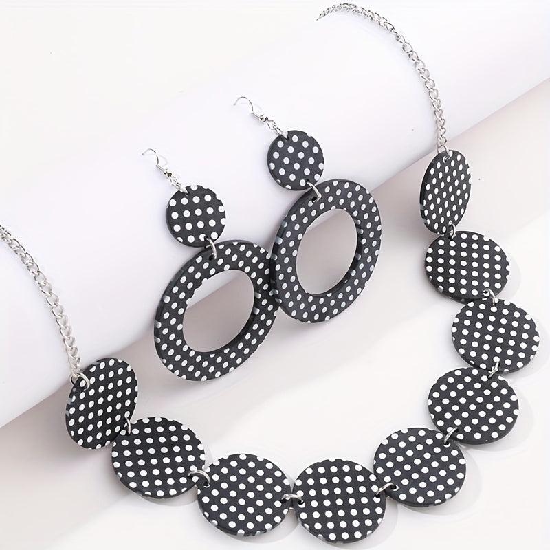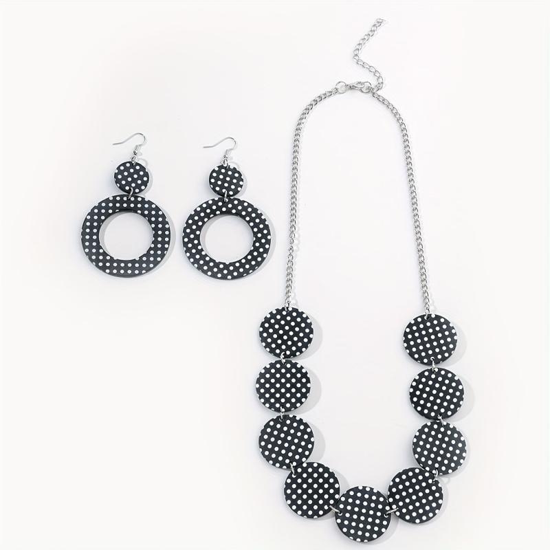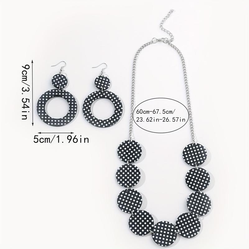 Add a touch of retro charm with this set featuring polka dot geometric round earrings and a matching necklace.