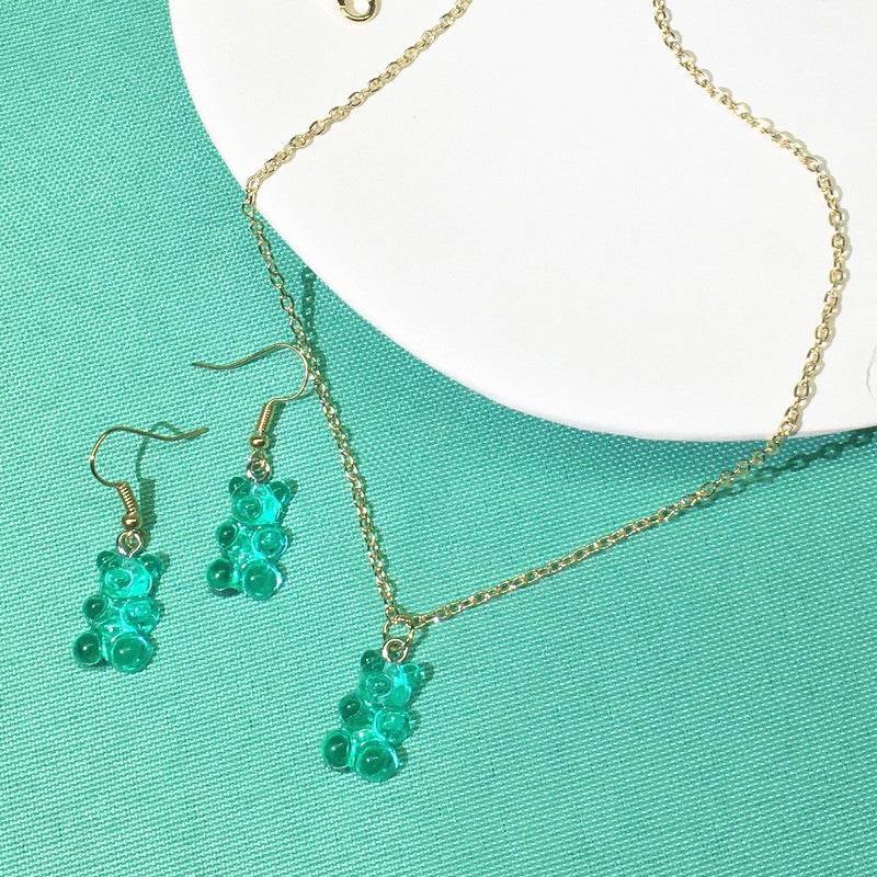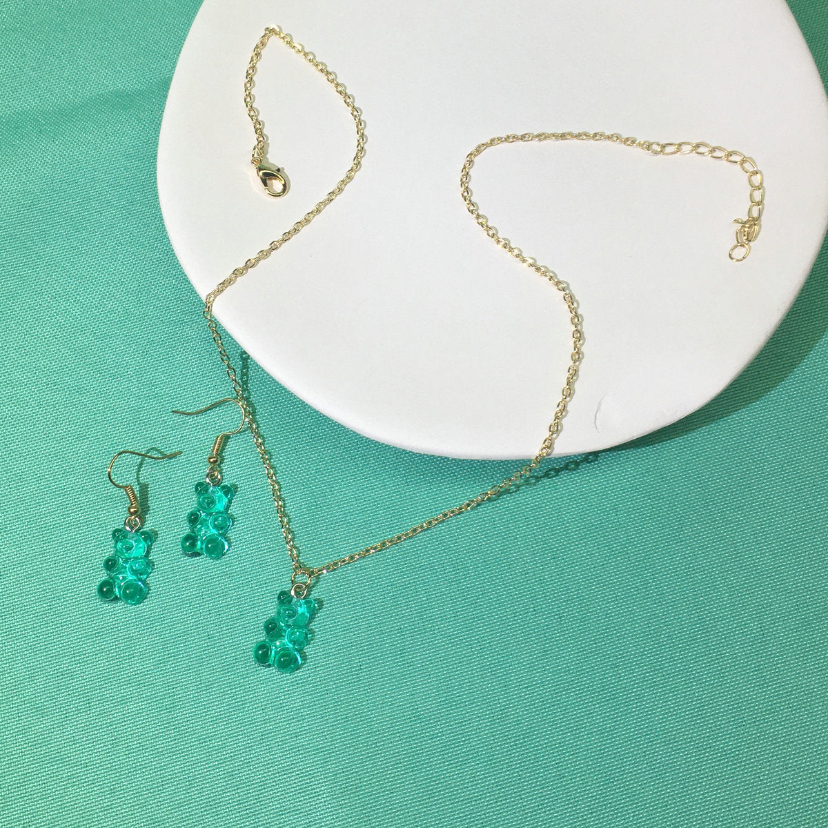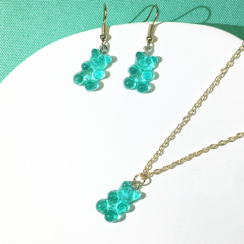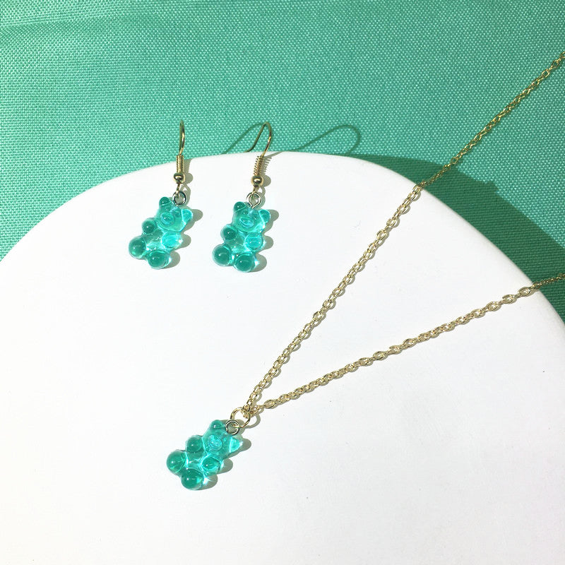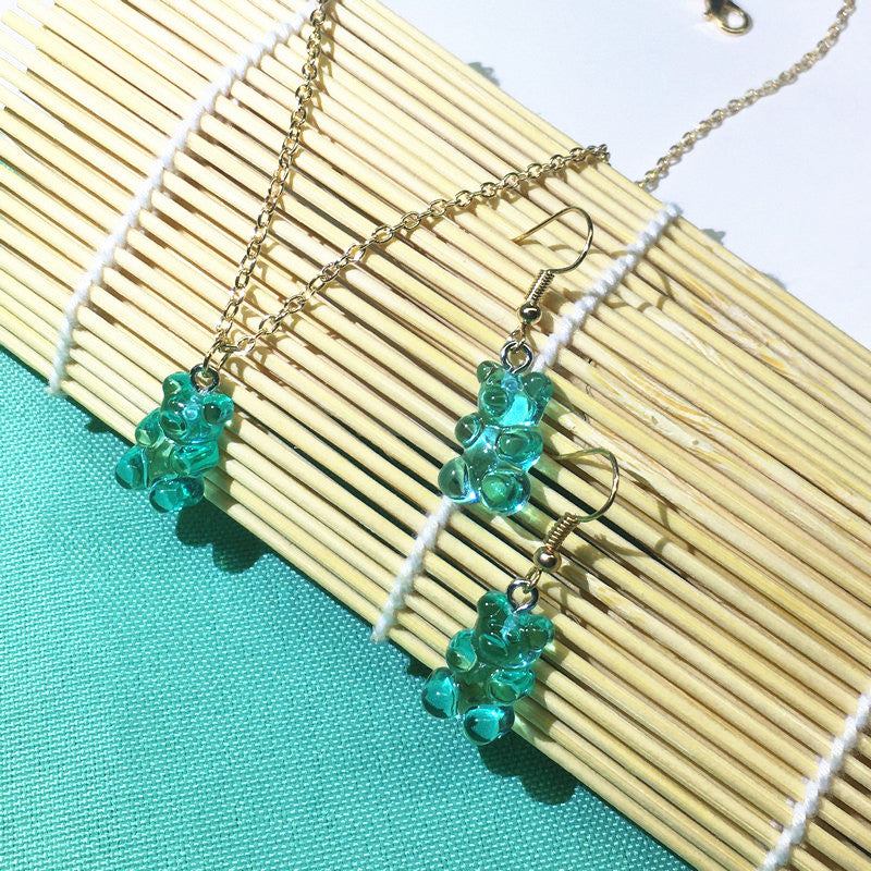 This adorable bear pendant necklace and drop earrings set features a cartoon bear design. Perfect for animal lovers and those who appreciate cute jewelry. Makes a great gift for any occasion.