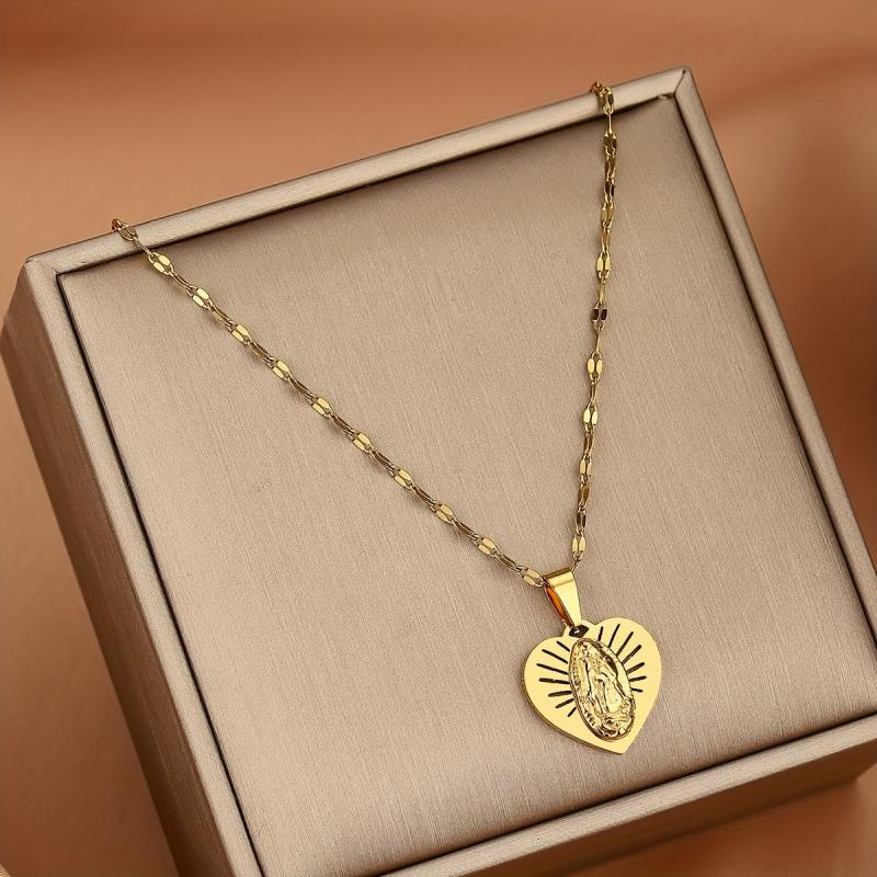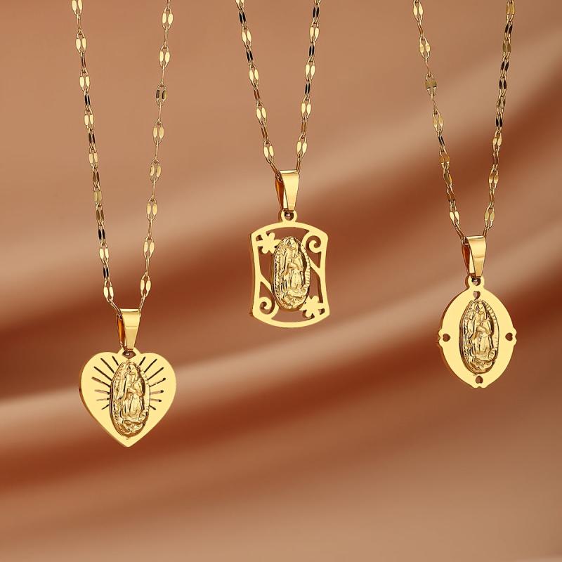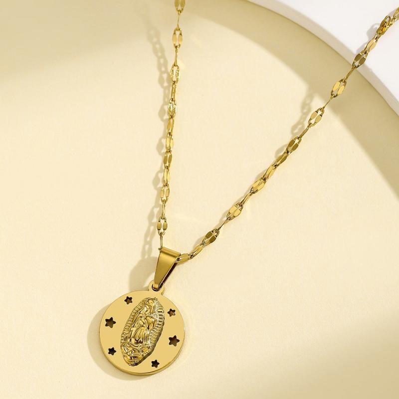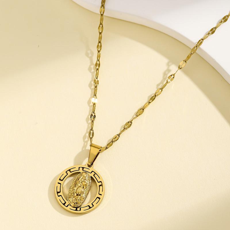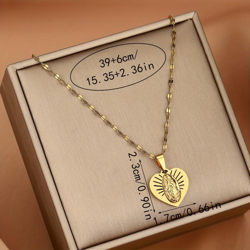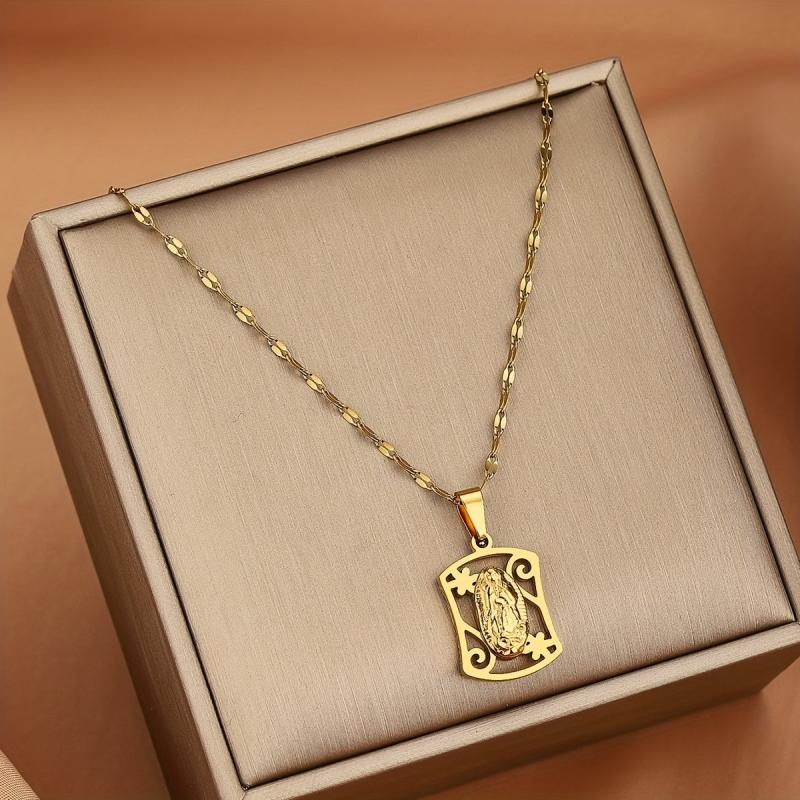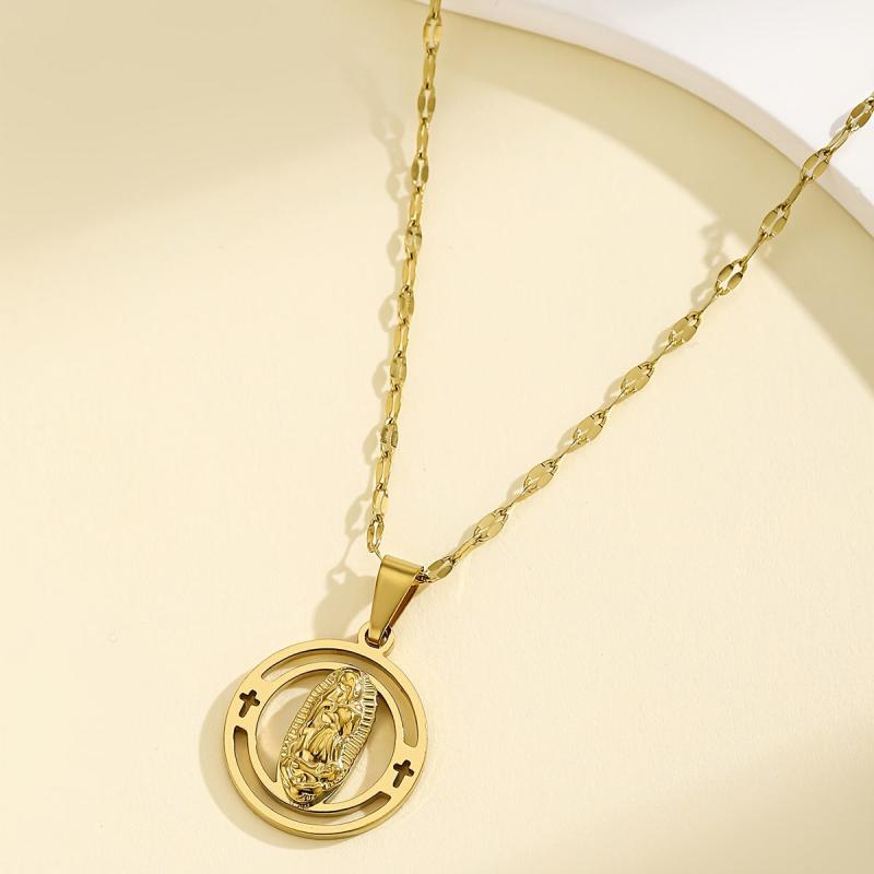 Vintage golden tone stainless steel necklace featuring a double layer design with a Virgin Mary pendant. Ideal for everyday wear or special occasions like Easter. Makes a thoughtful gift for women.