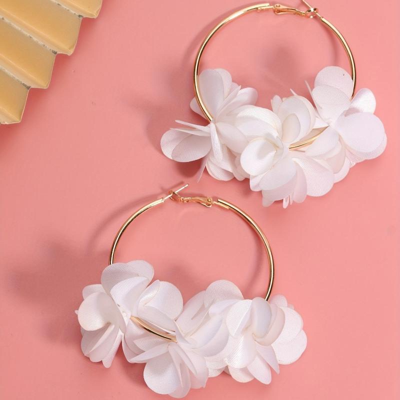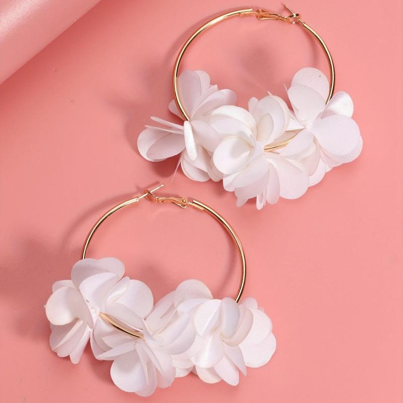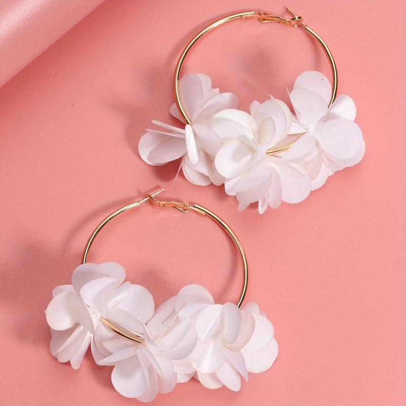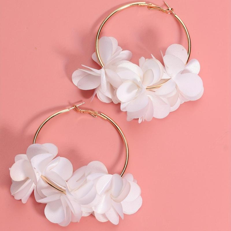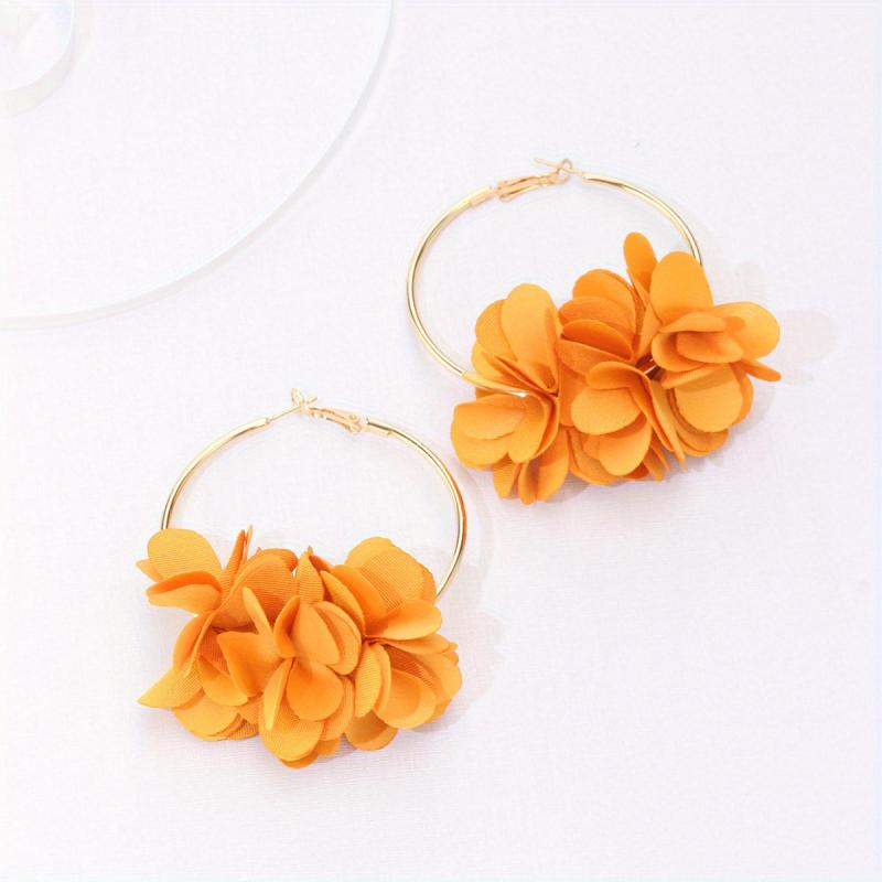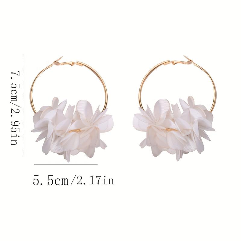 These unique hoop earrings feature fabric flowers for a bohemian look. They make a perfect gift for any female, and are ideal for weddings and special occasions.