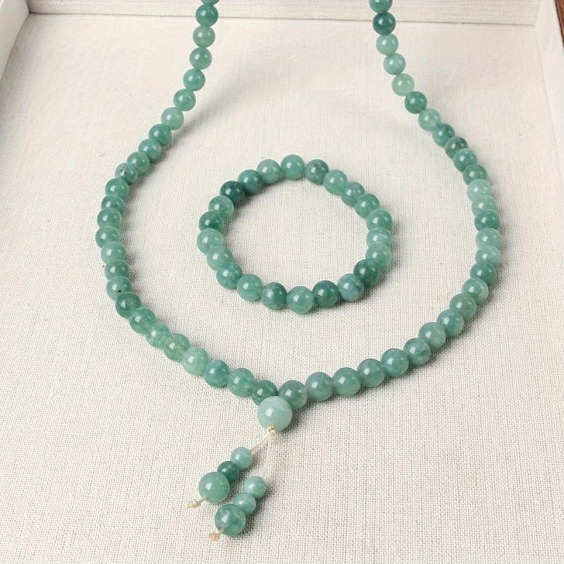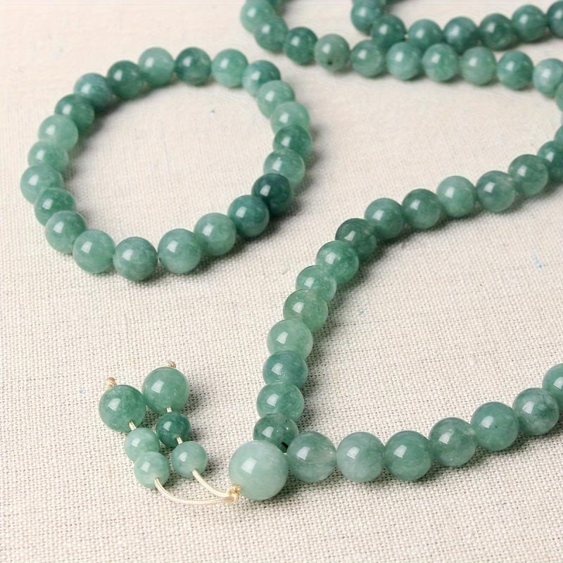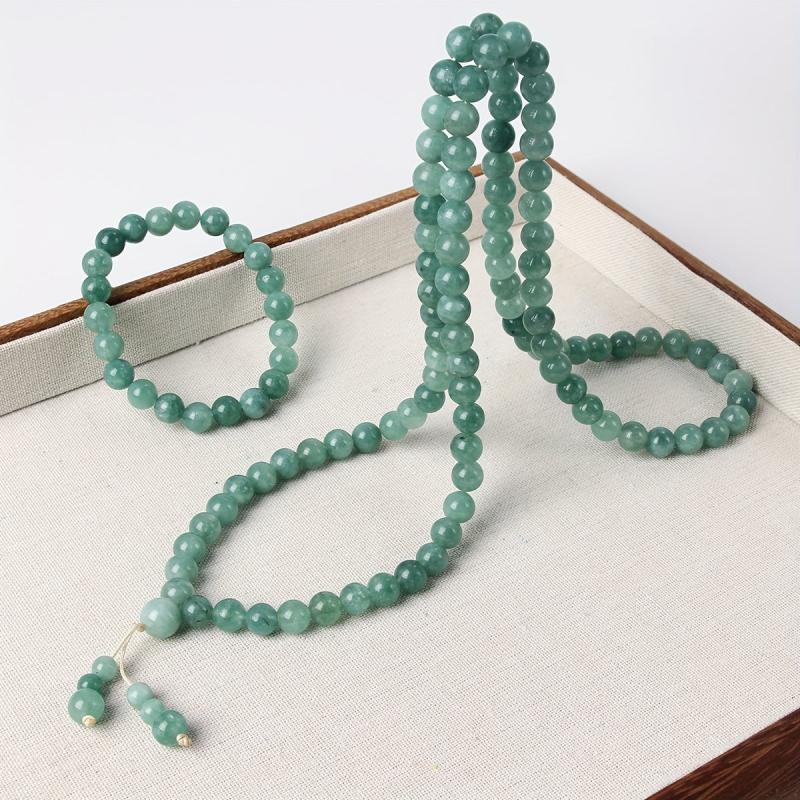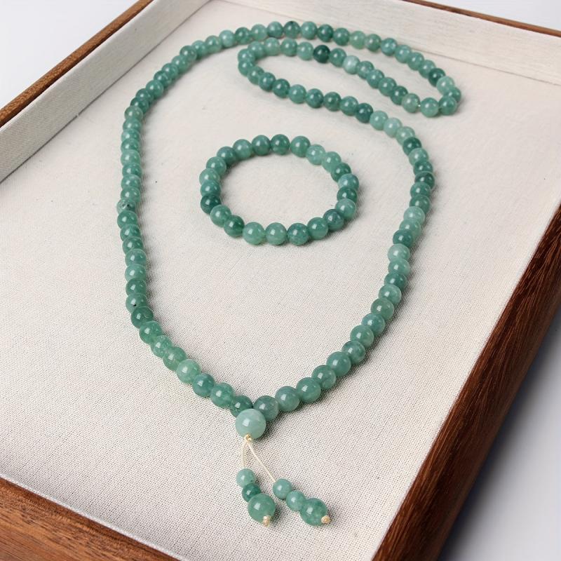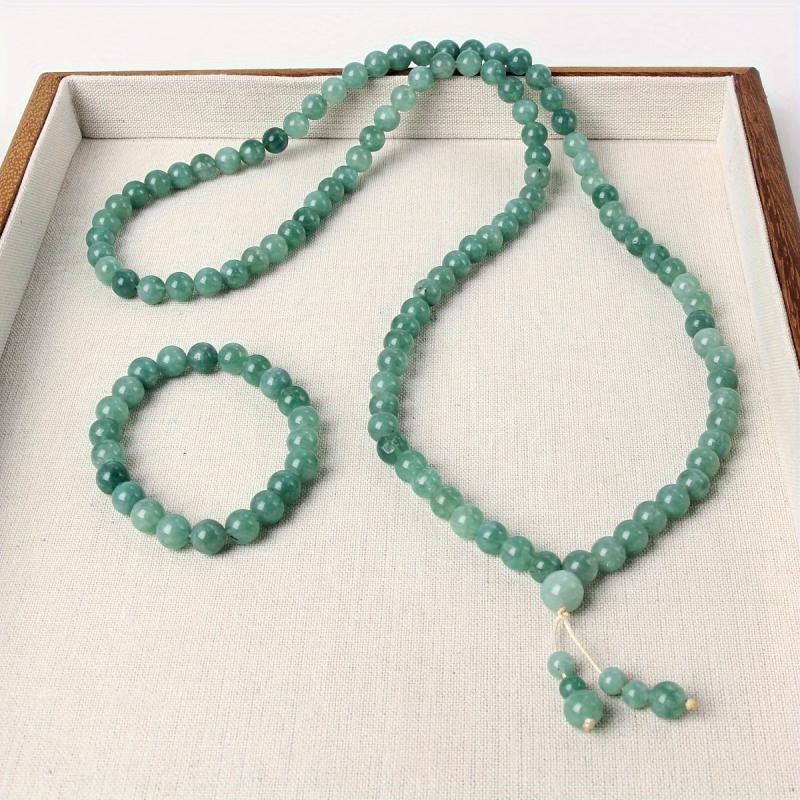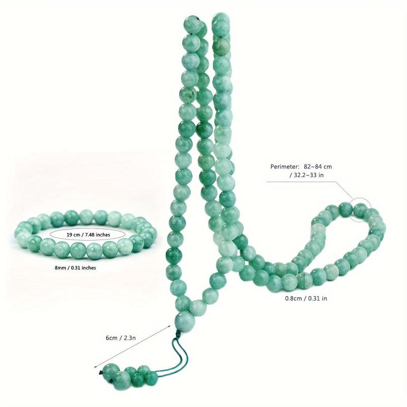 Elevate your style with this set of 99 green natural stone beads including a long necklace and a bracelet. Perfect for daily gatherings.
