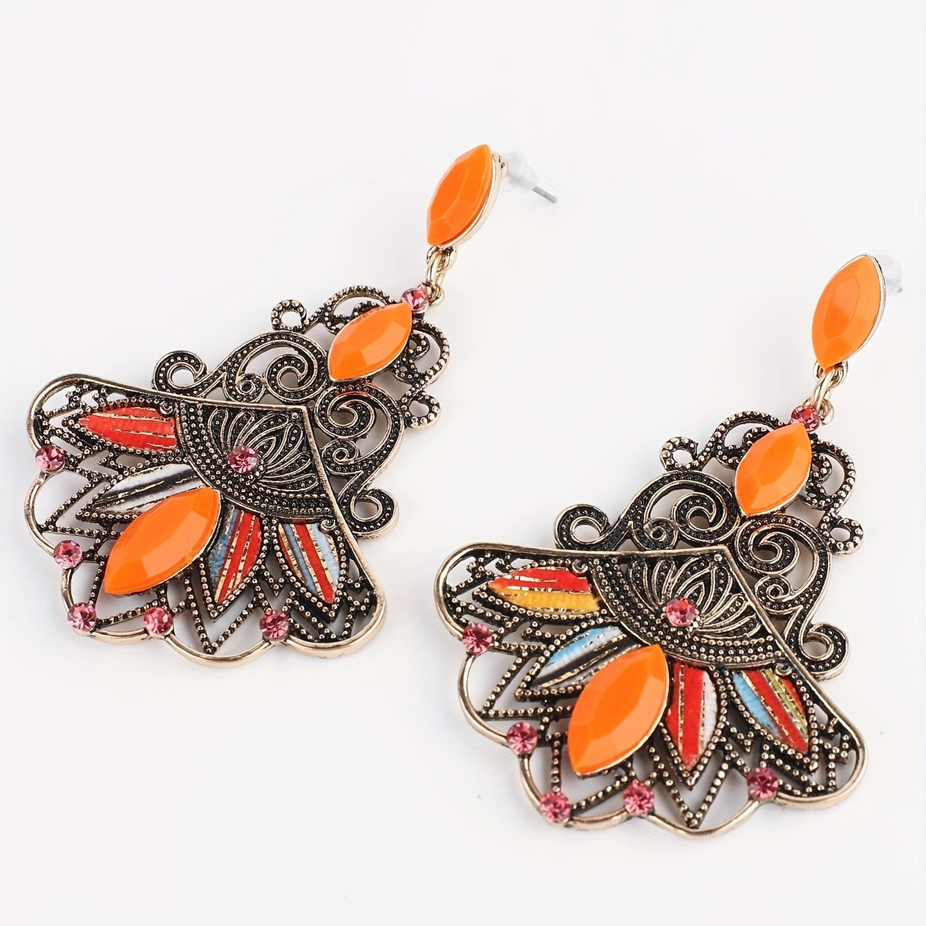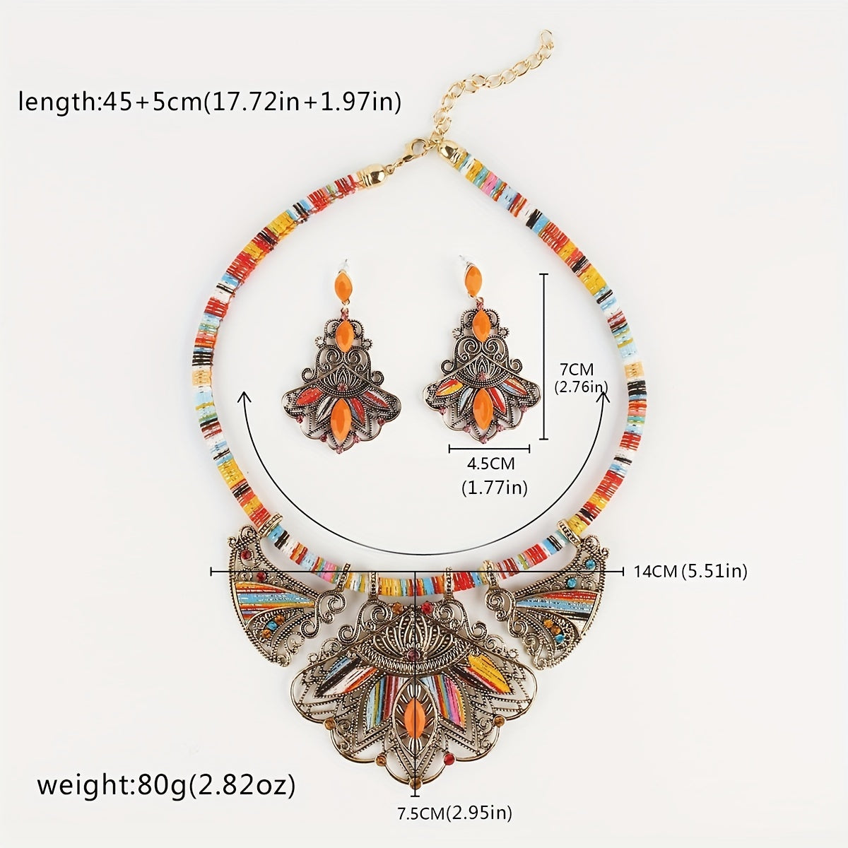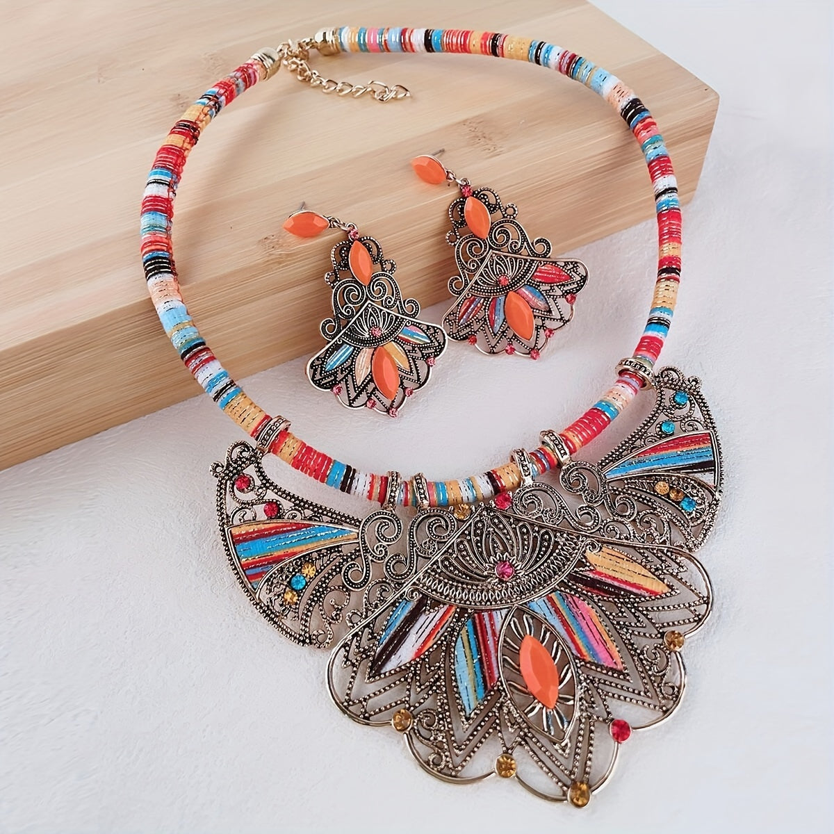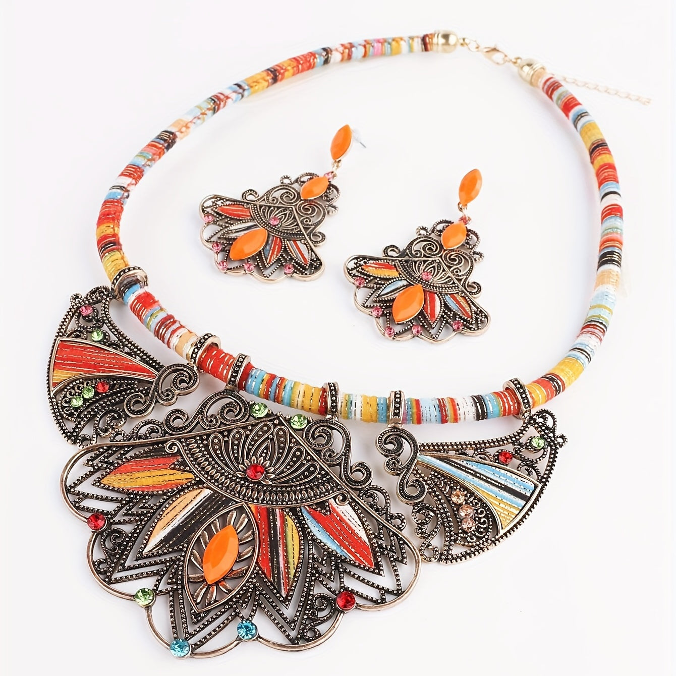 Embrace bohemian style with this colorful gemstone set. The necklace and dangle earrings feature vibrant hues and a vintage statement design, making them the perfect addition to your jewelry collection or a unique gift for someone special.