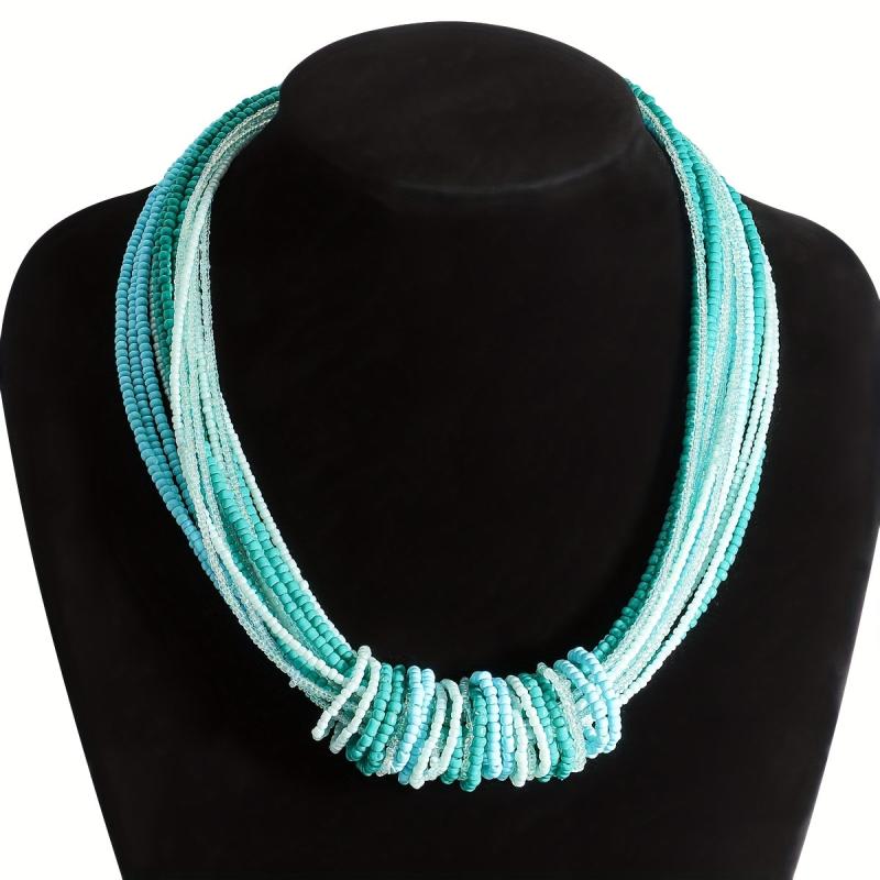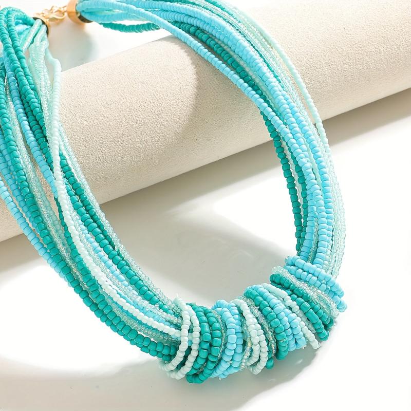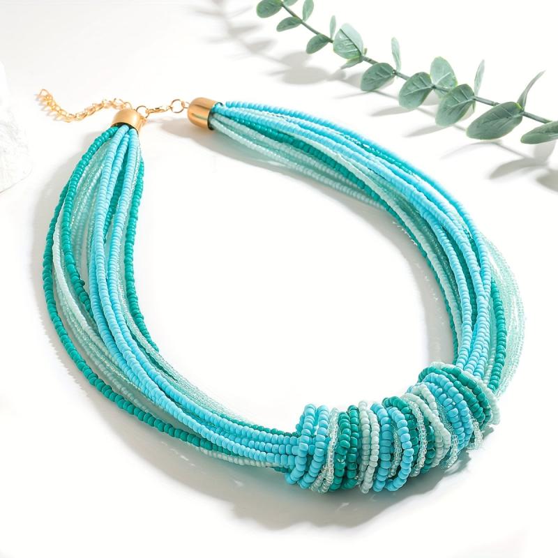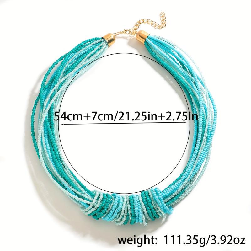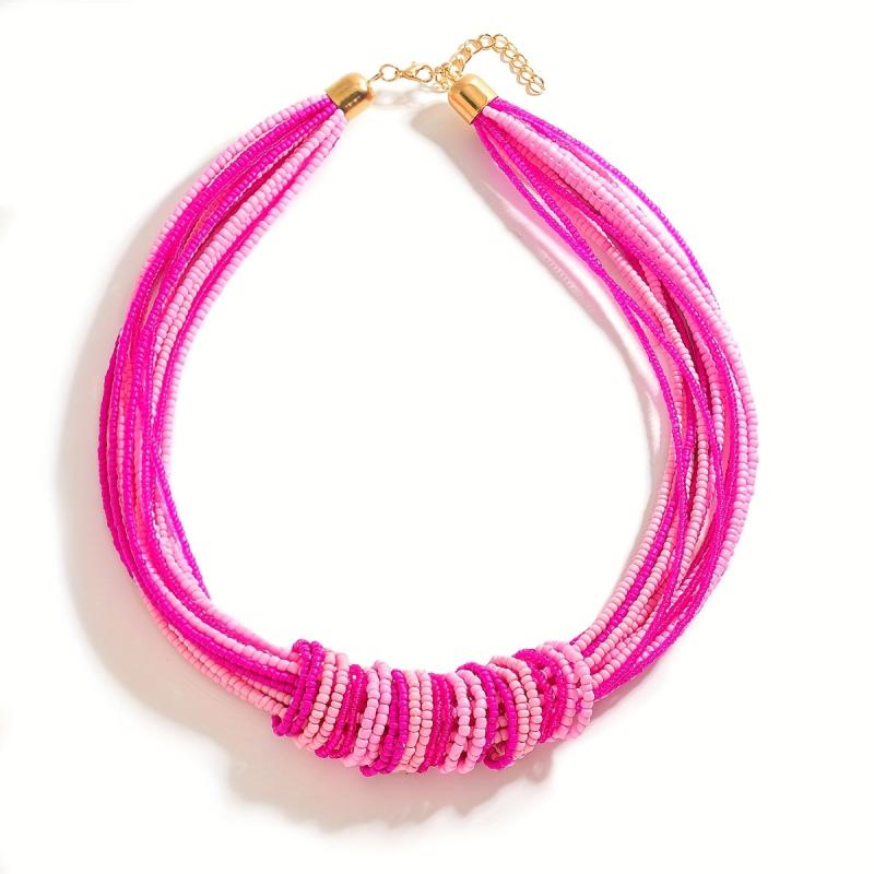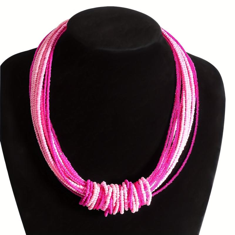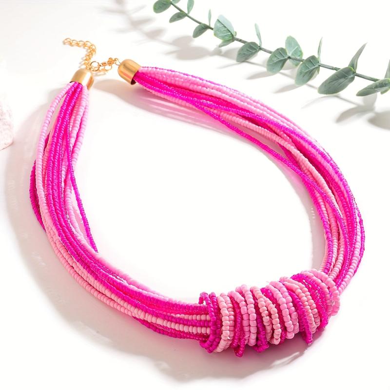 Elevate your beach and summer look with this boho-inspired layer beaded necklace featuring pink tassels. It's perfect for holiday parties and makes an ideal gift for women who enjoy beach accessories.
