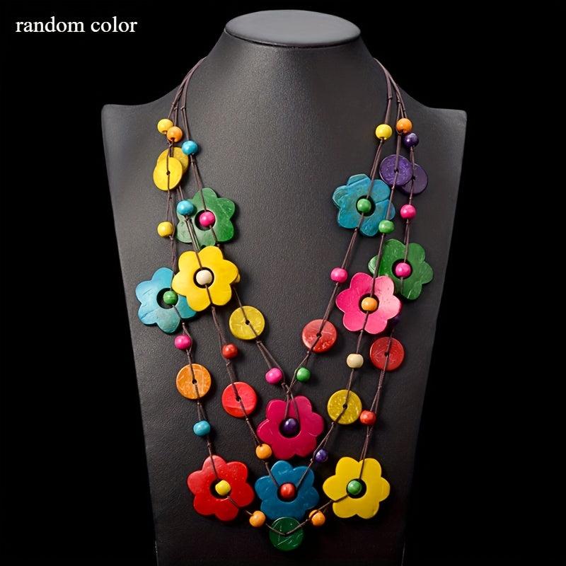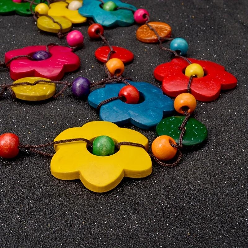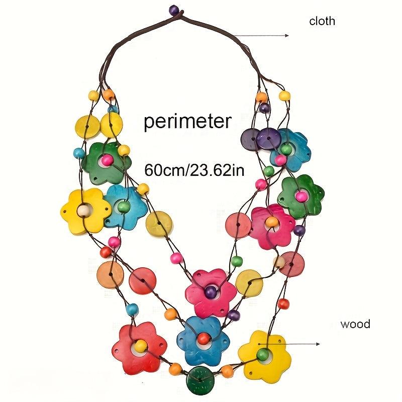 Elevate your style with this vibrant floral necklace that adds a touch of bohemian charm. Made with lightweight wooden beads, this colorful accessory is perfect for festivals and all seasons.