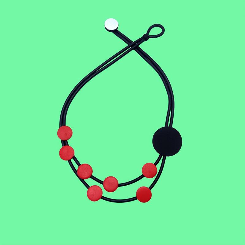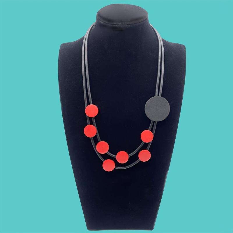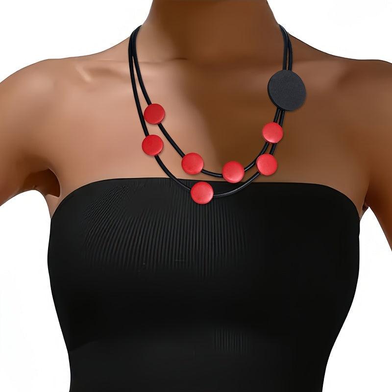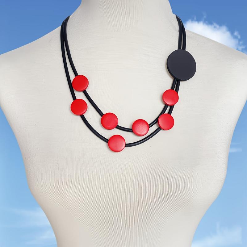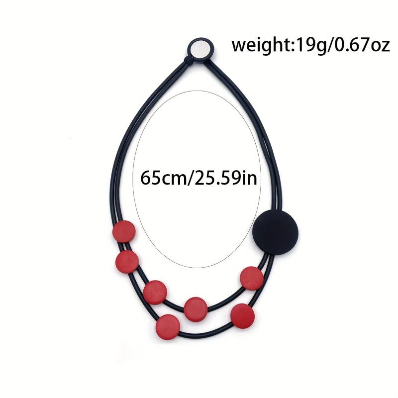 Elevate your look with this lightweight and durable bohemian necklace made of recycled wood beads and rubber cord. Perfect for parties, holidays, or casual attire.