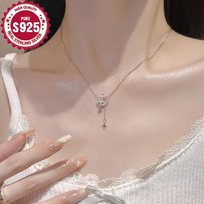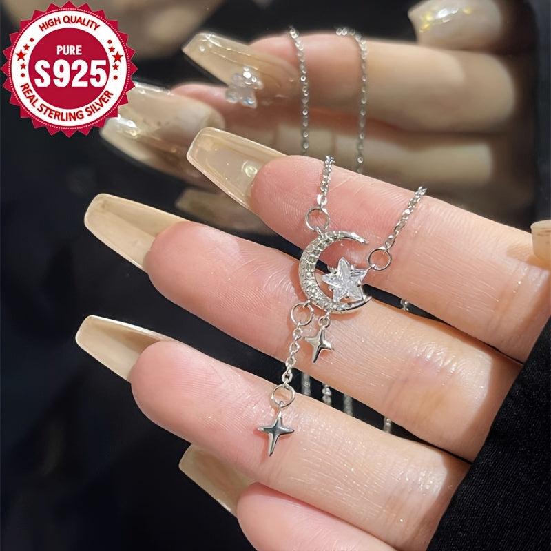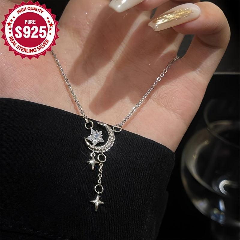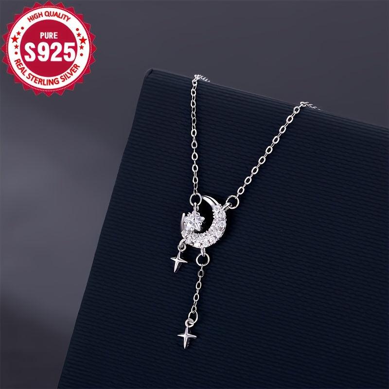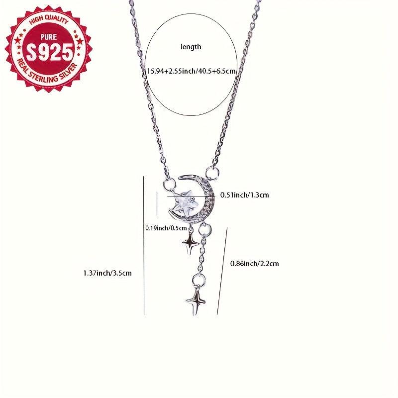 Add a touch of celestial beauty to your look with this 925 silver necklace featuring a star and moon pendant adorned with sparkling rhinestones. Perfect for boho chic style.