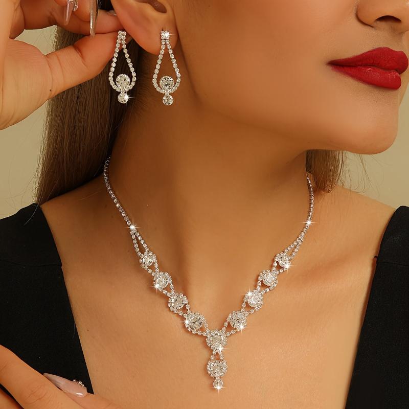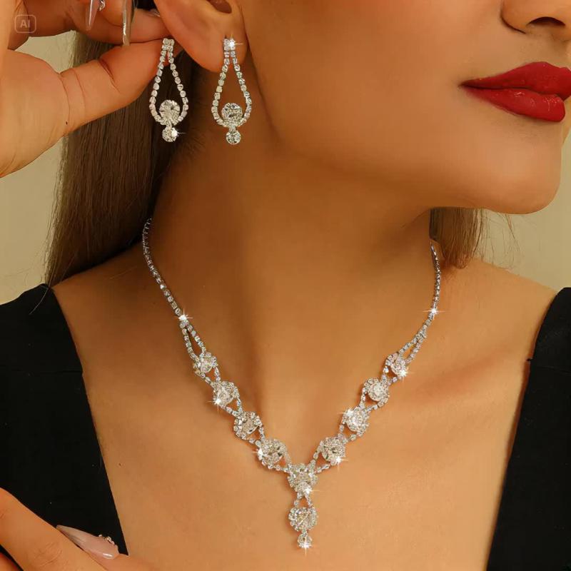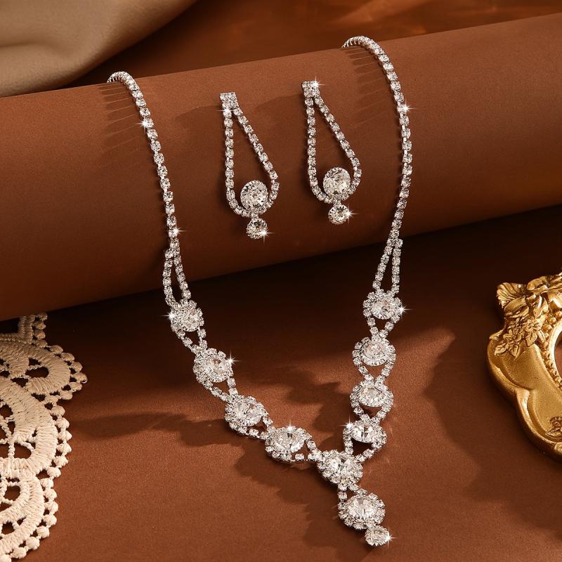 Elegant and fashionable jewelry set made of copper with rhinestone studding. Perfect for daily wear, weddings, parties, and banquets. Includes necklace and earrings.