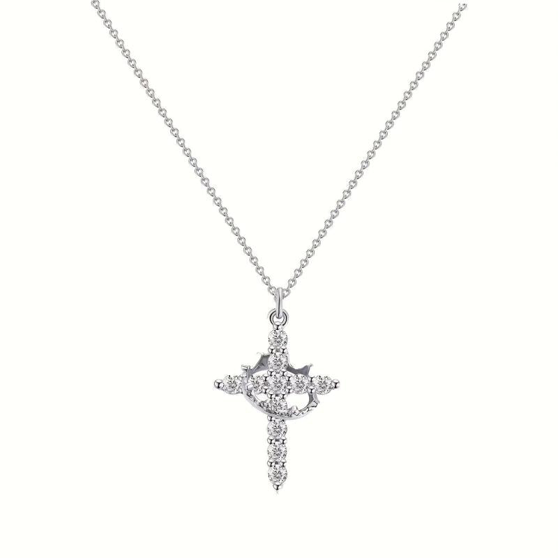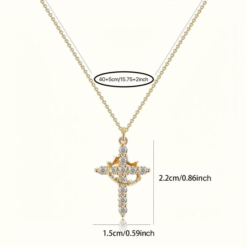 This delicate necklace features a cross with a rotating crown design, making it a lovely accessory. It is adorned with rings for added charm.