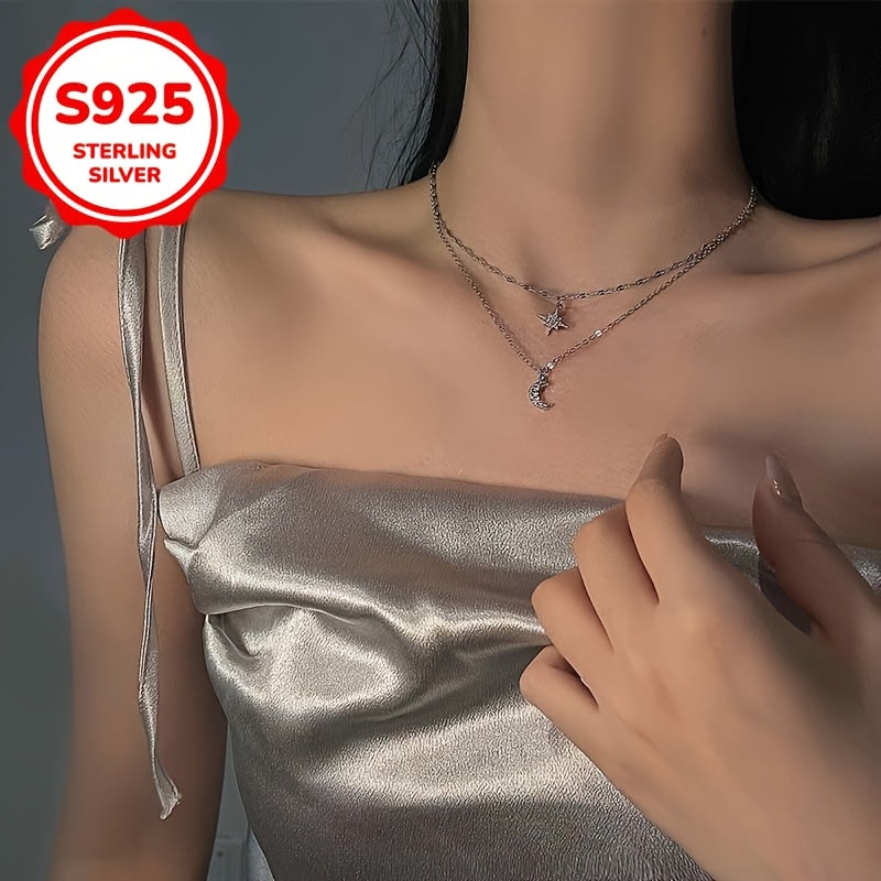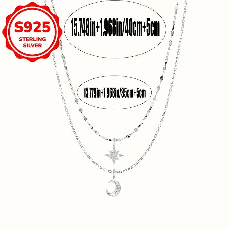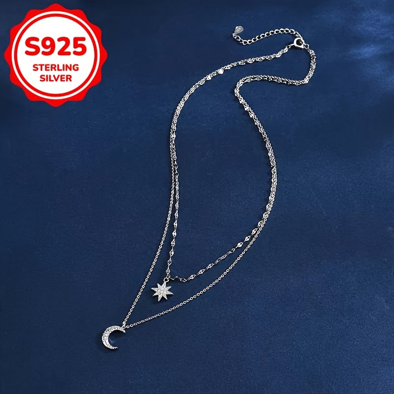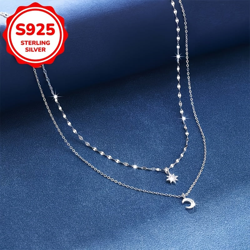 This stylish chain necklace features a moon and star double layer design with a fashionable star and moon pendant. Made of 5.3 grams of S925 silver.