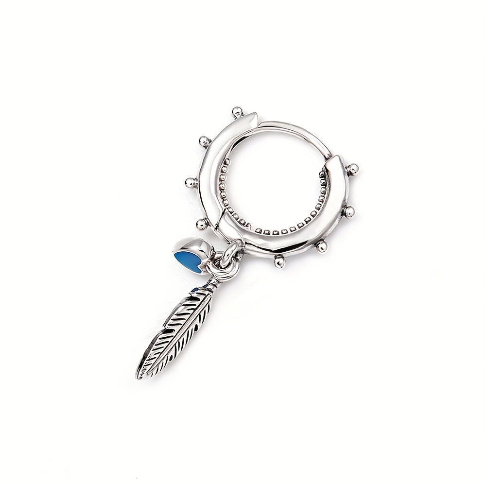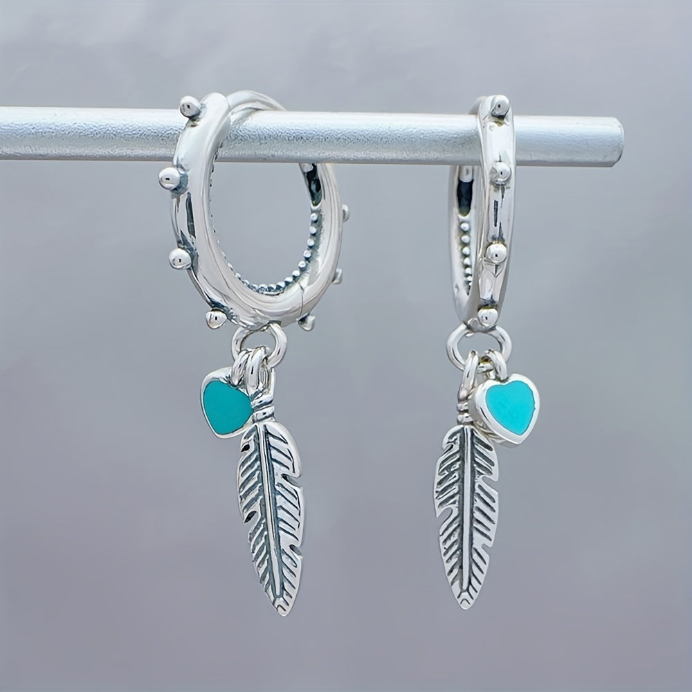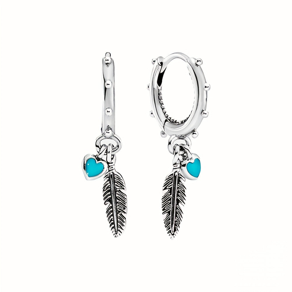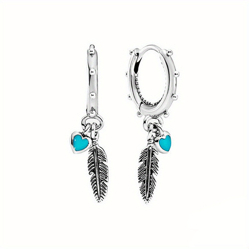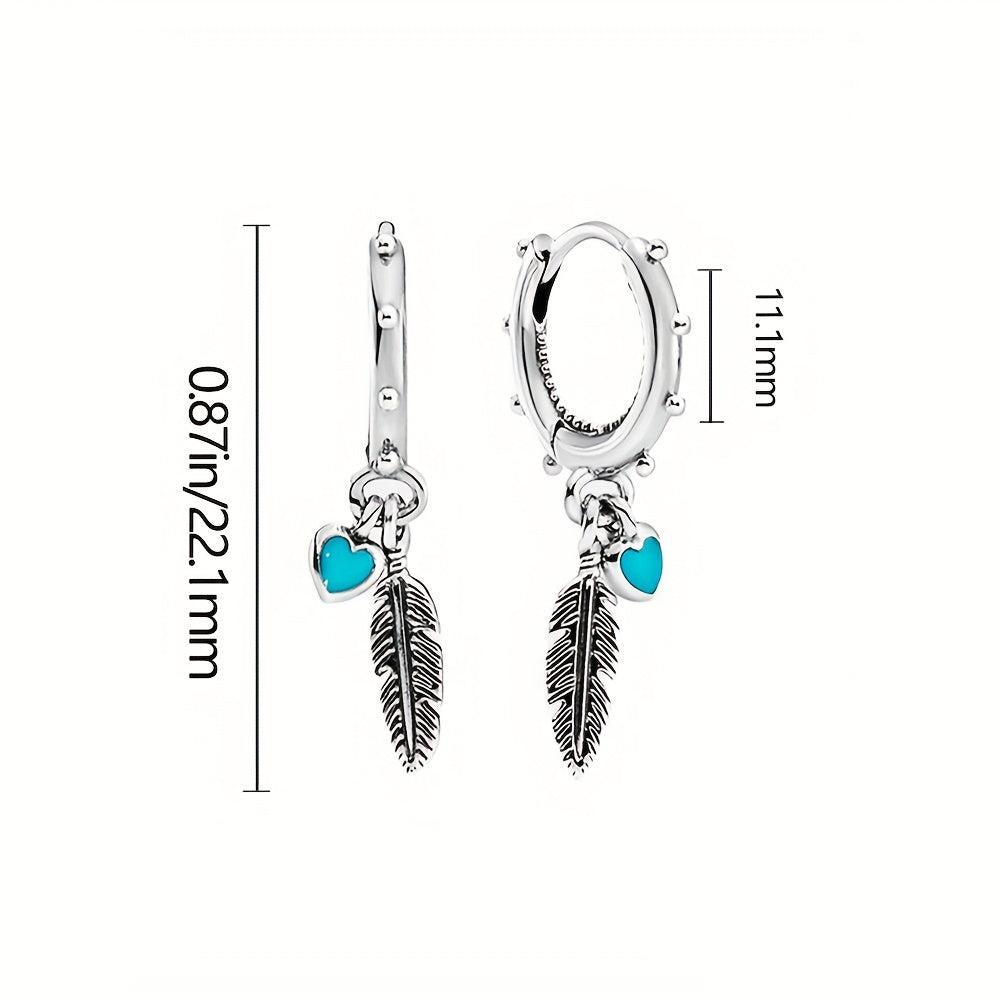 Feather Heart Turquoise Hoop Earrings 925 Silver Jewelry