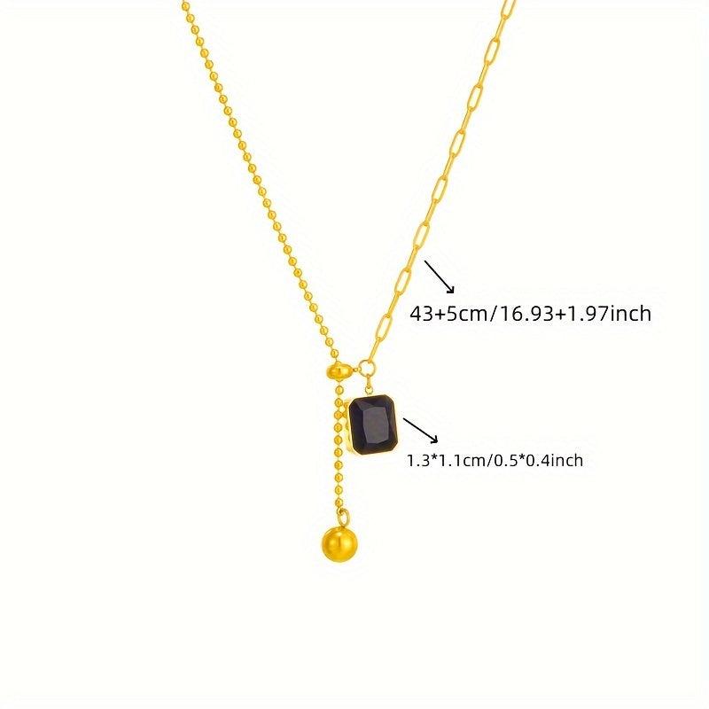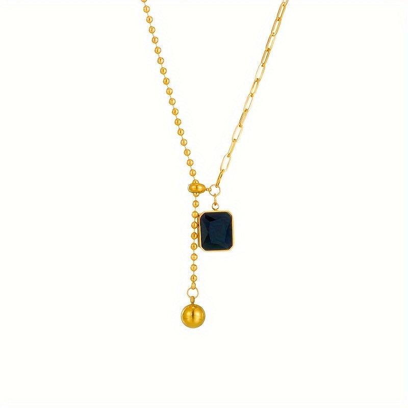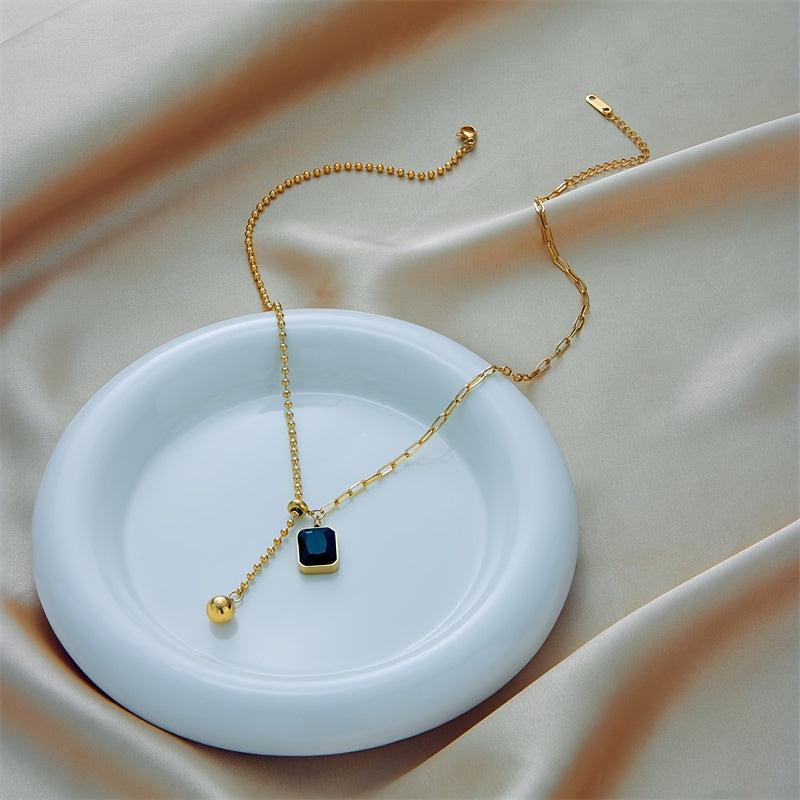 This stunning necklace features a round ball and square glass pendant on a stainless steel chain, adding an elegant touch to any outfit.