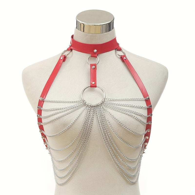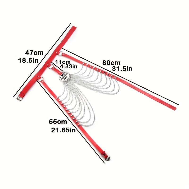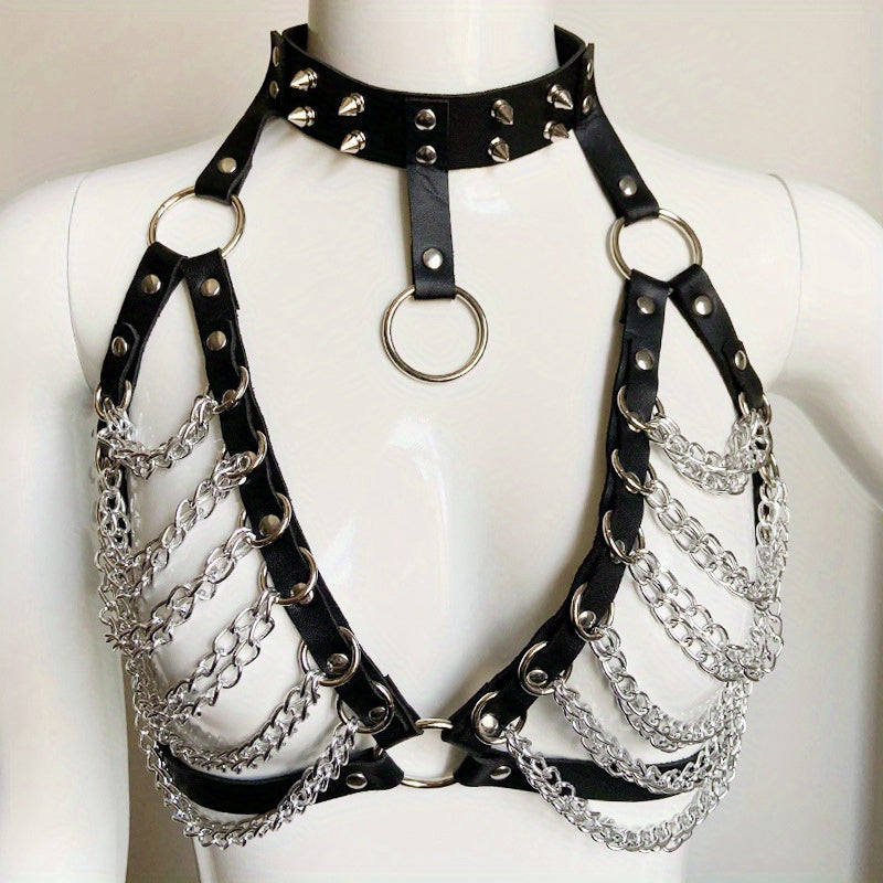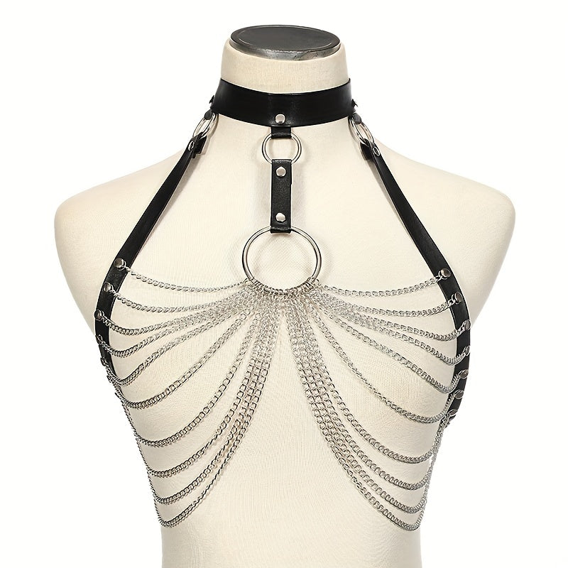 Elevate your look with this sexy Gothic body chain harness made of high-quality PU leather. Perfect for adding a touch of edgy style to any outfit.