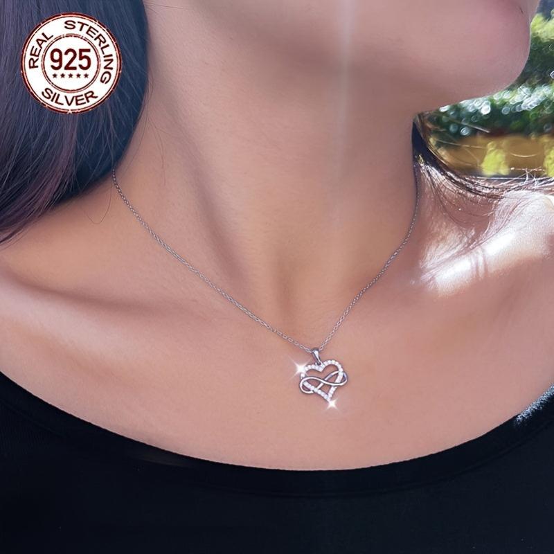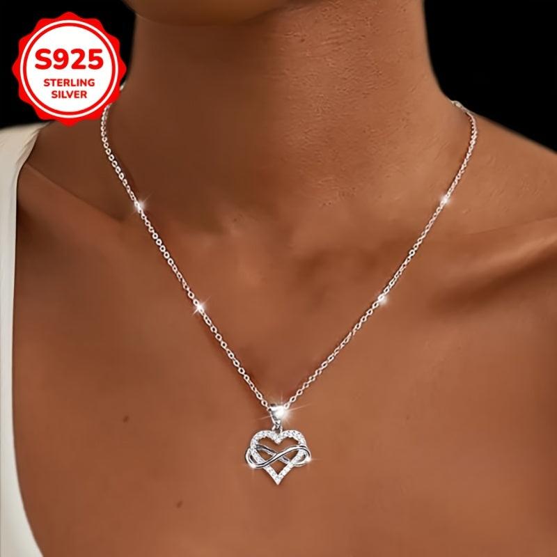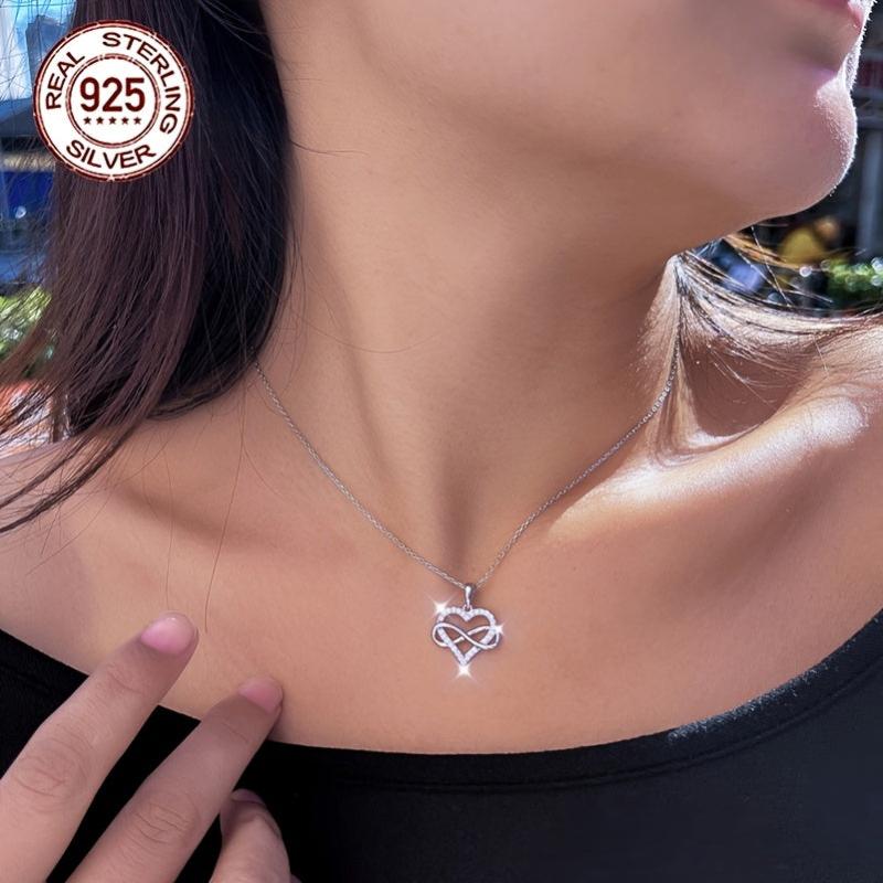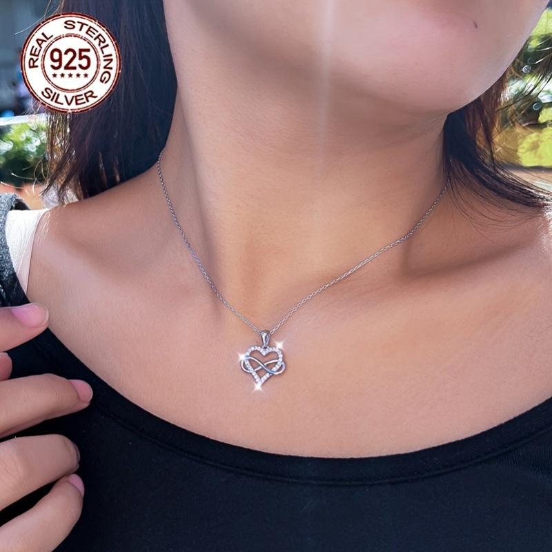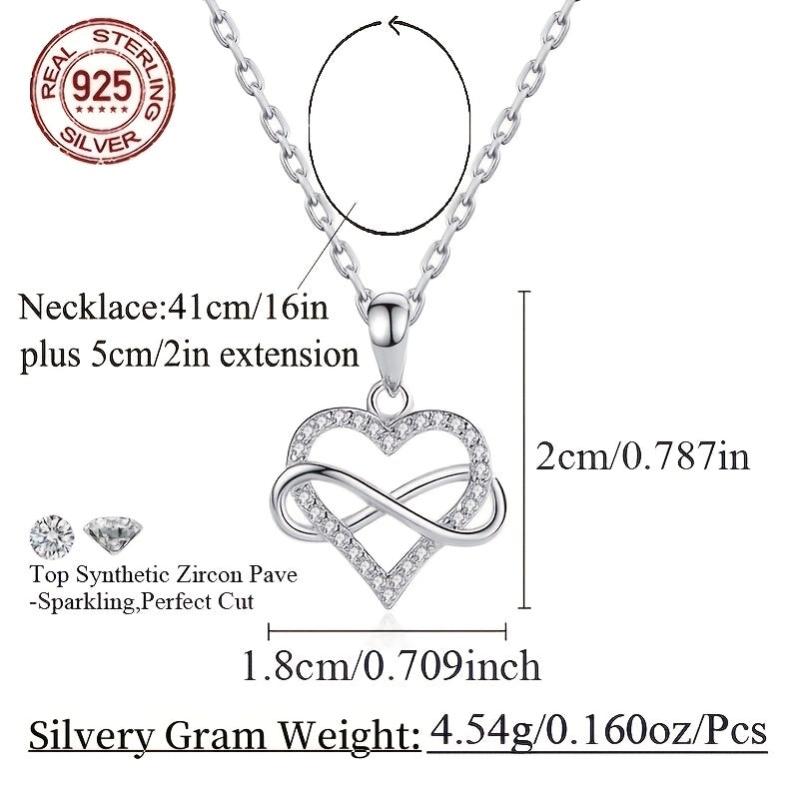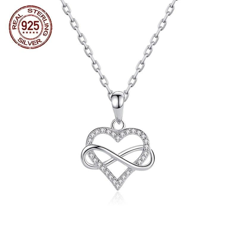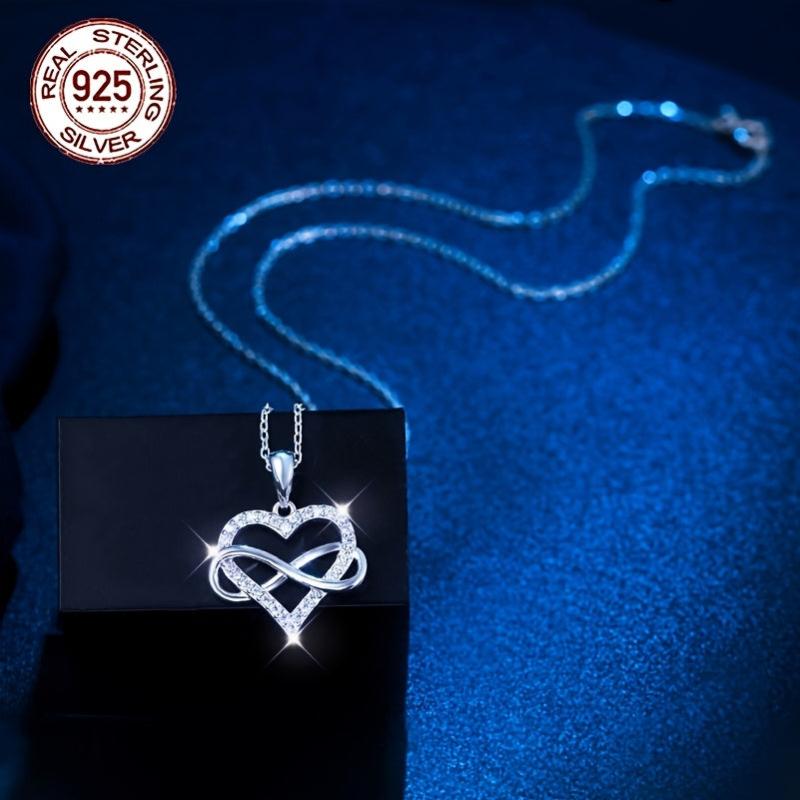 Elegant and timeless pendant necklace made of 925 sterling silver. Features a heart and infinity cross design with sparkling zirconia inlay. Perfect for parties or everyday wear.