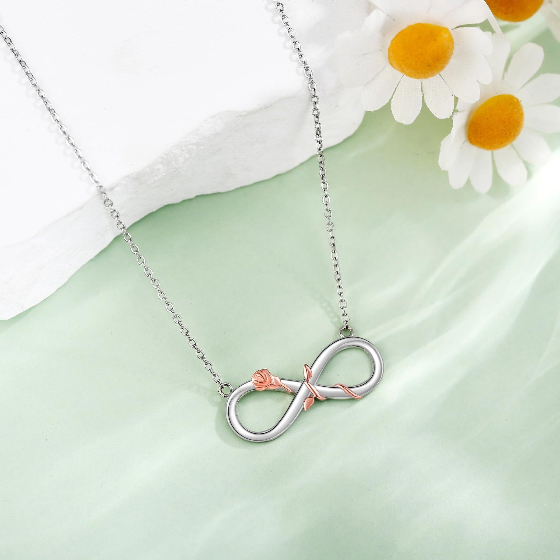 This elegant necklace features an infinite symbol pendant plated in silvery and rose gold, making it a perfect gift for ladies.