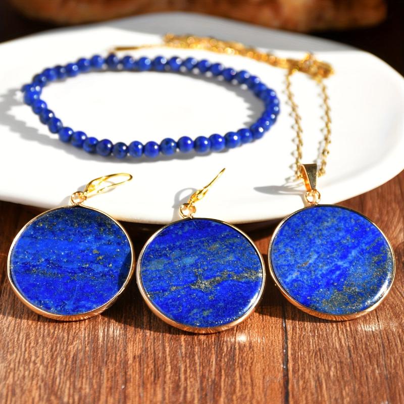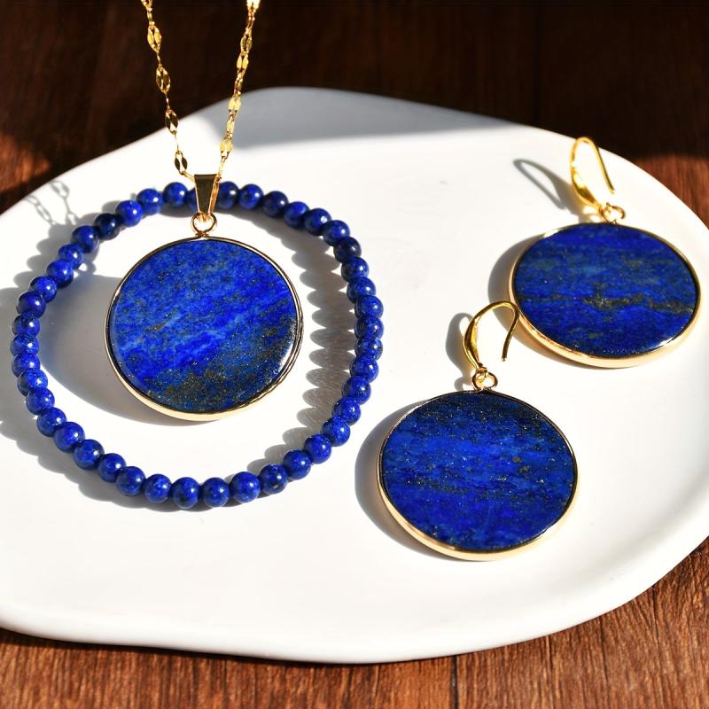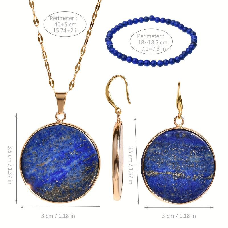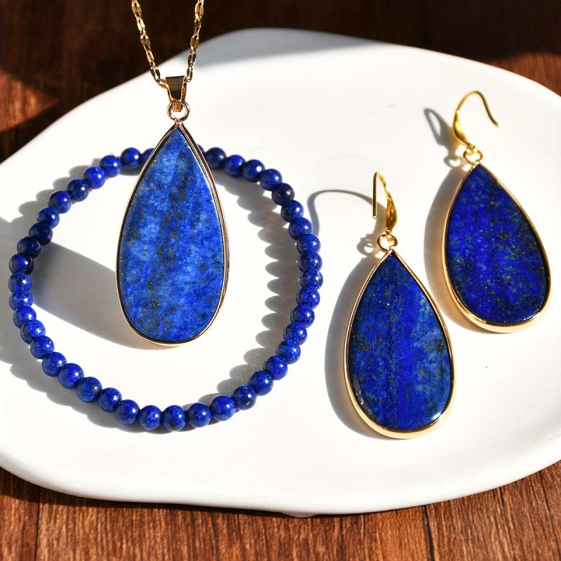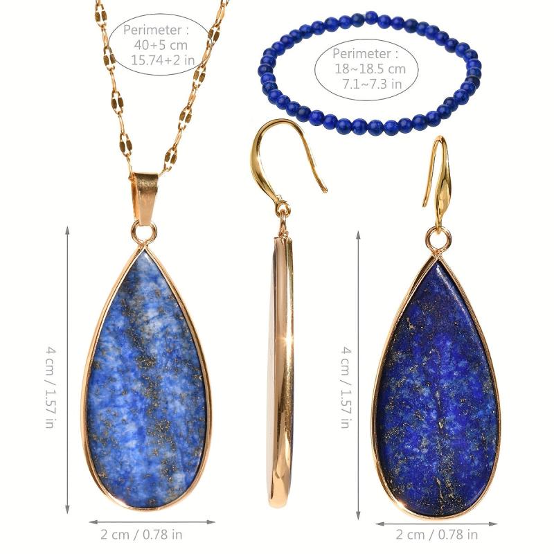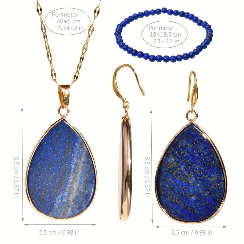 This set includes 4pcs of lapis lazuli dangle earrings and necklace, featuring teardrop crystals with a golden tone. Perfect for daily wear, parties, and makes an ideal gift for Mother's Day.
