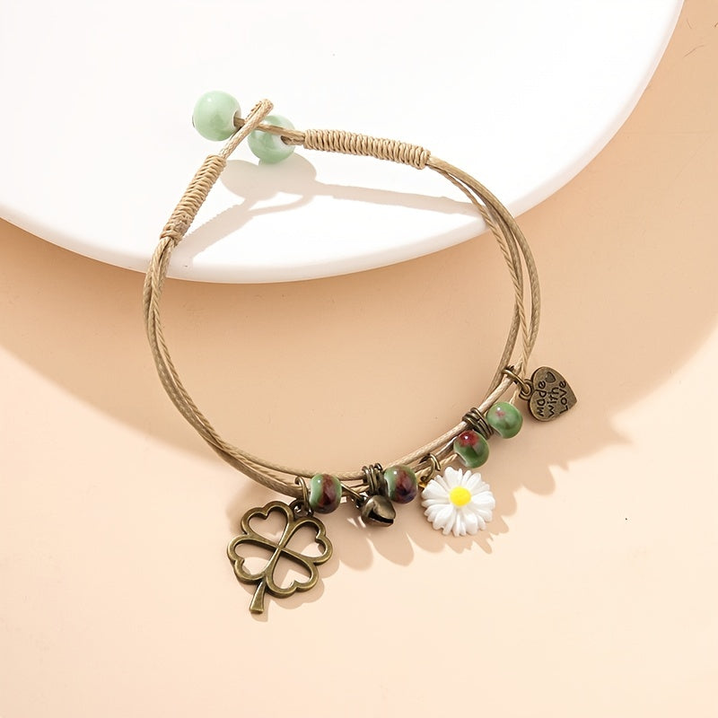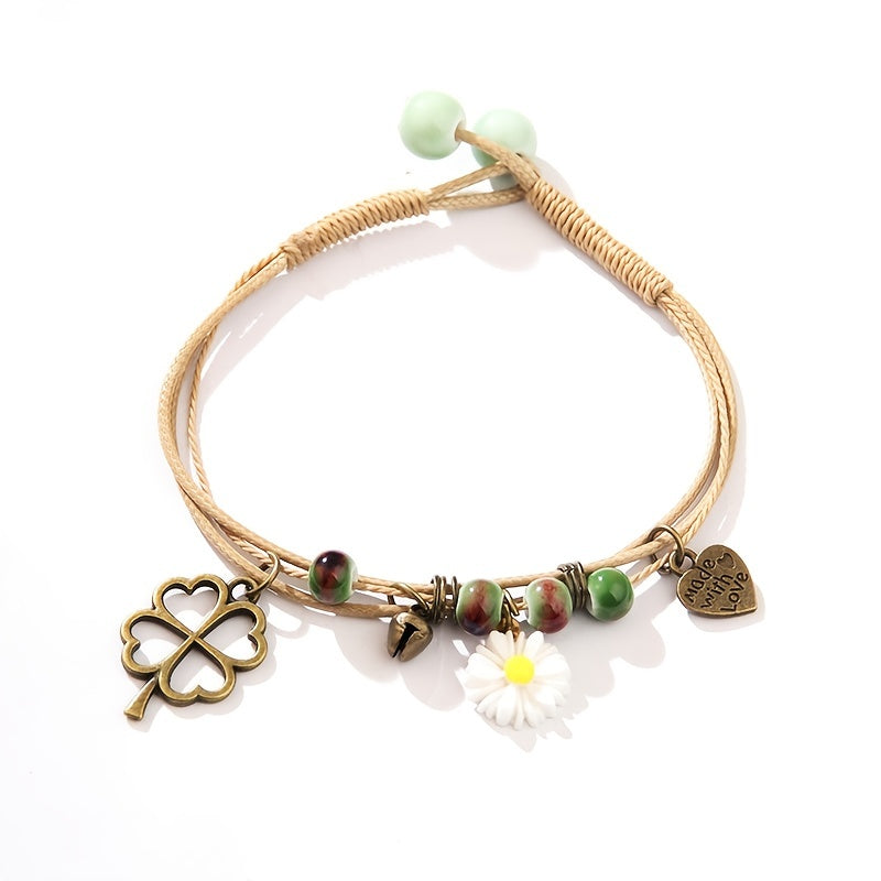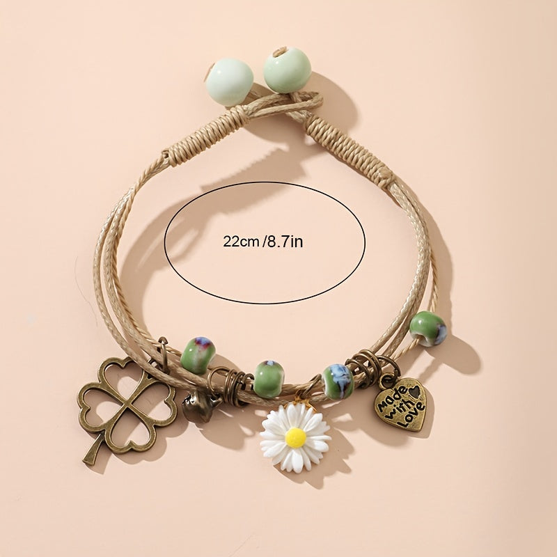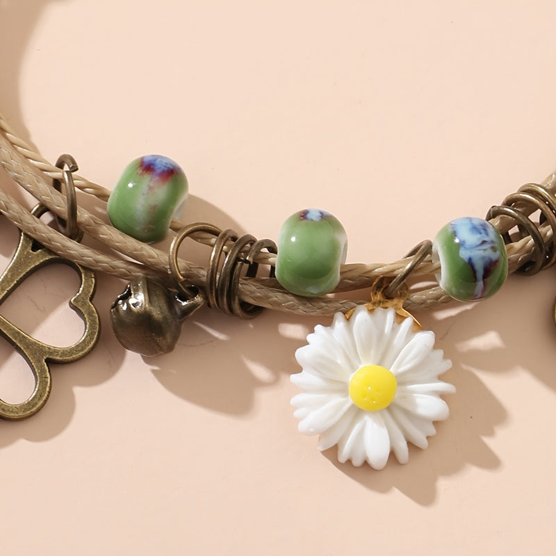Layered Rope Bracelet Heart & Daisy Pendant Hand Chain for Women
