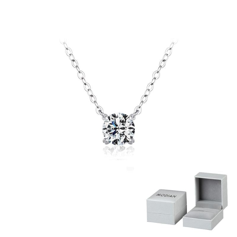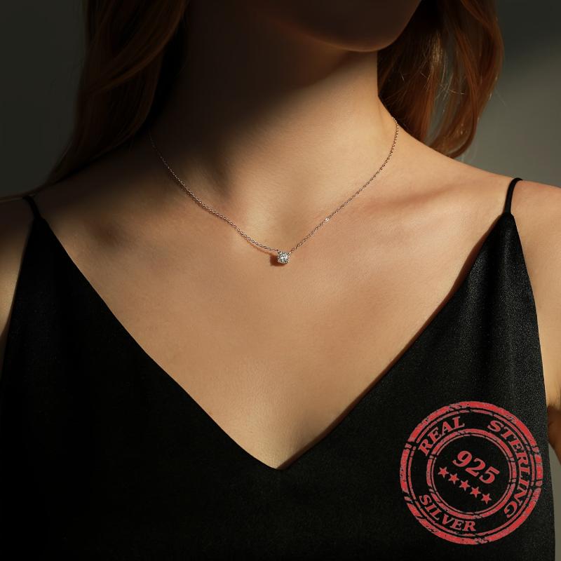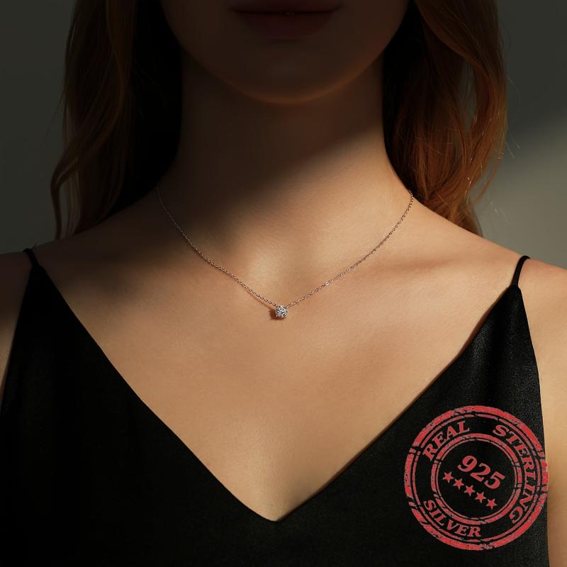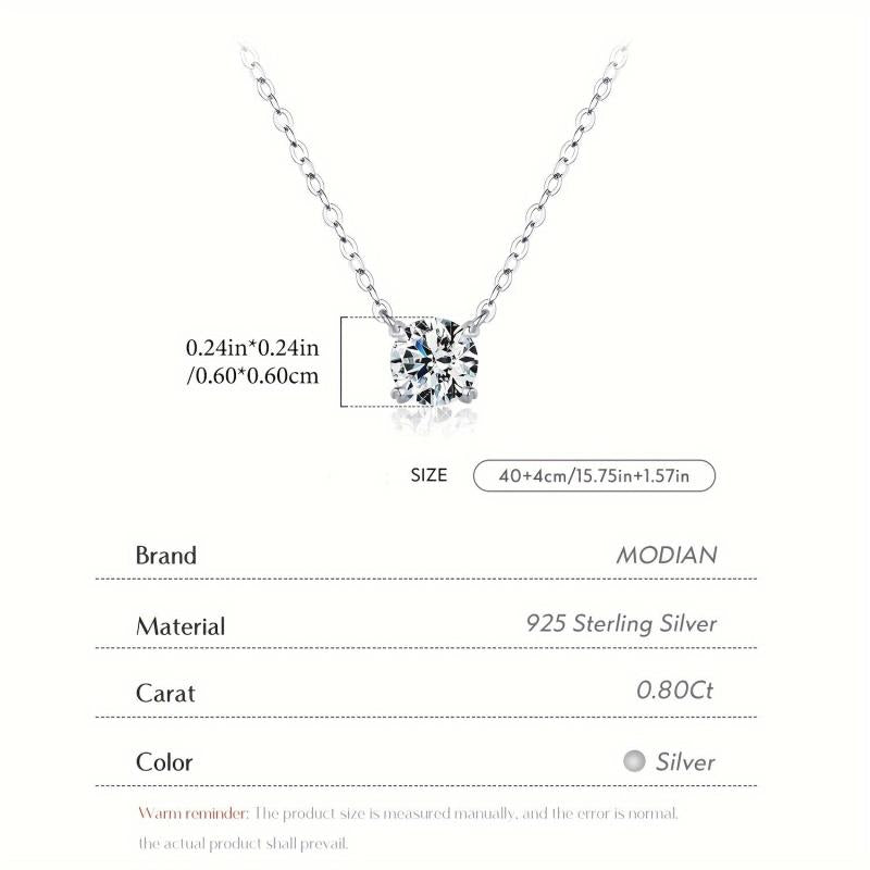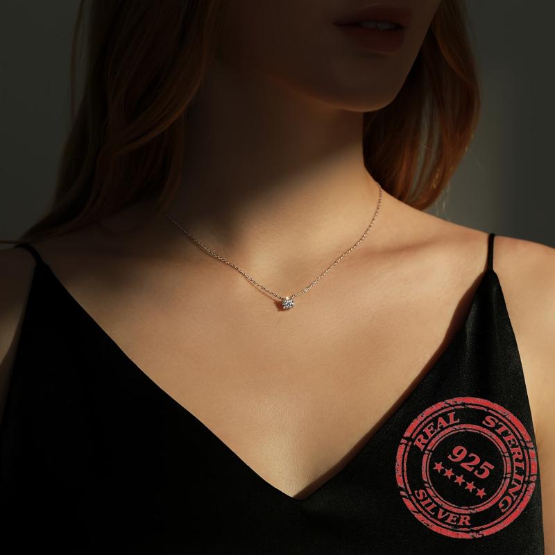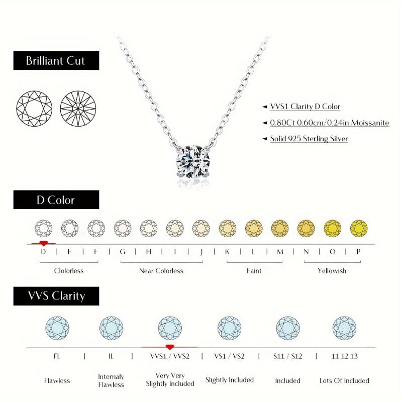 This classic style pendant necklace features a 0.8CT D Moissanite set in a 925 sterling silver setting. Perfect for everyday wear or special occasions.
