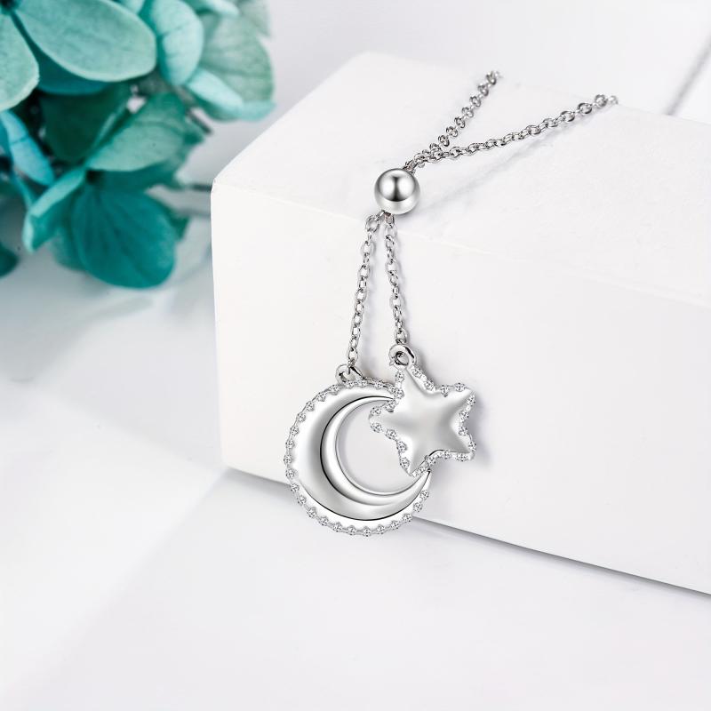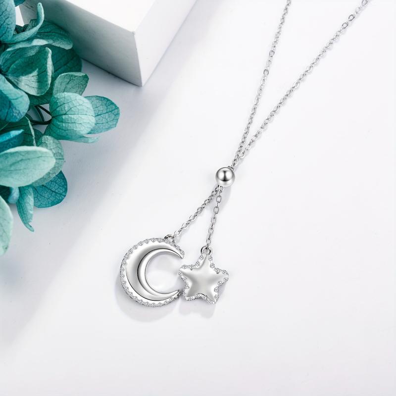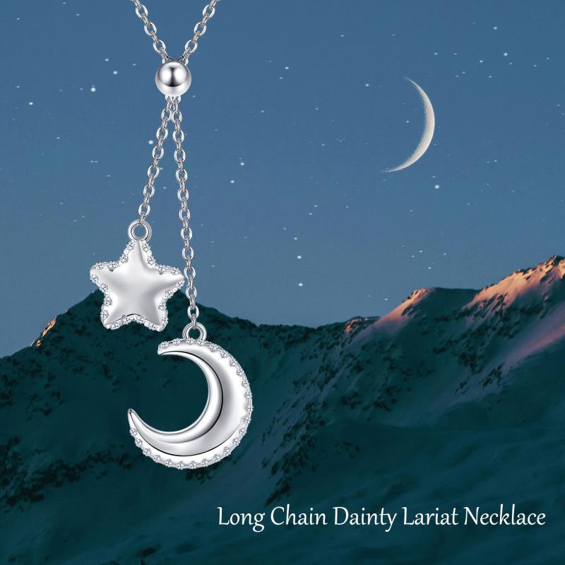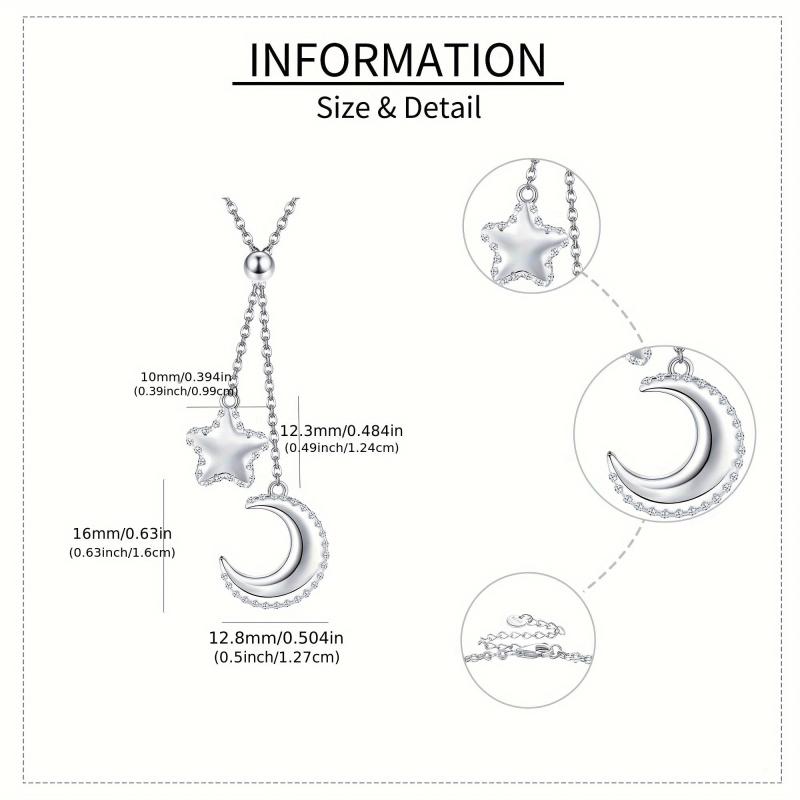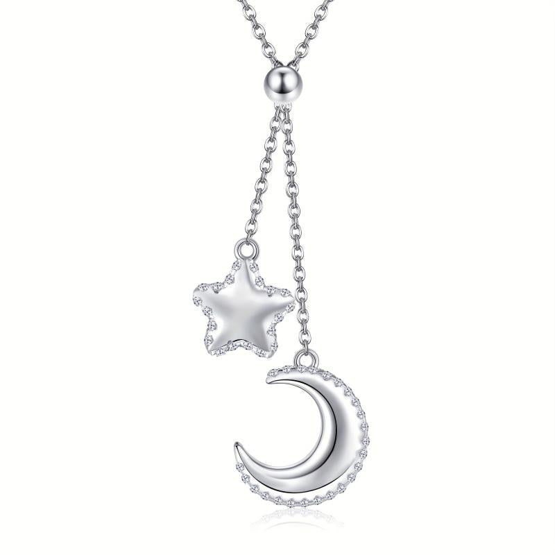 Elegant long necklace featuring moon and star design in S925 sterling silver. Perfect for women who love celestial jewelry. Adjustable chain for a personalized fit.