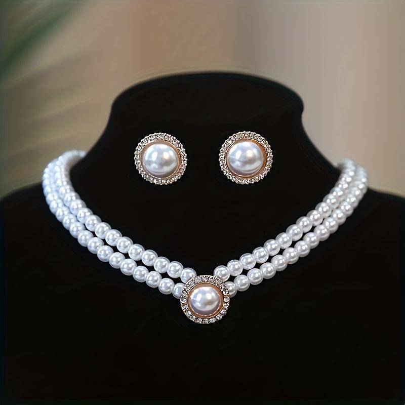 Elegant women's faux pearl jewelry set featuring a double layer necklace and matching earrings with rhinestone accents. Perfect for formal occasions or adding a touch of glamour to any outfit.