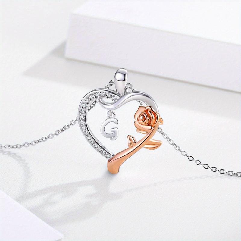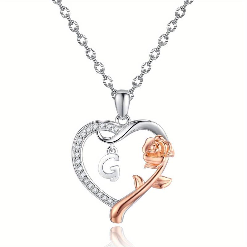 This beautiful initial necklace features a roseflower heart design with a letter pendant. Made of sterling silver, it's a perfect personalised jewellery gift for women.