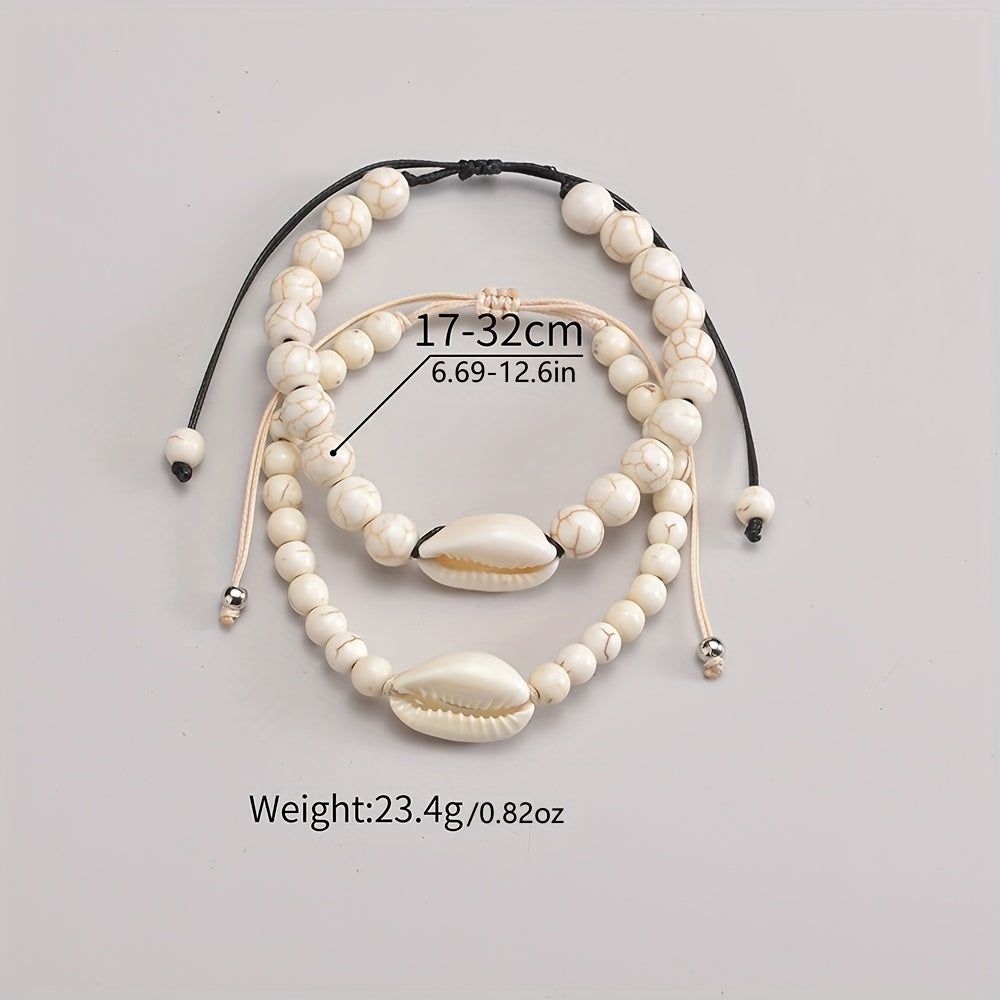 Perfect accessory for women during summer beach holidays. This adjustable double layer bracelet set features beautiful shell beads.
