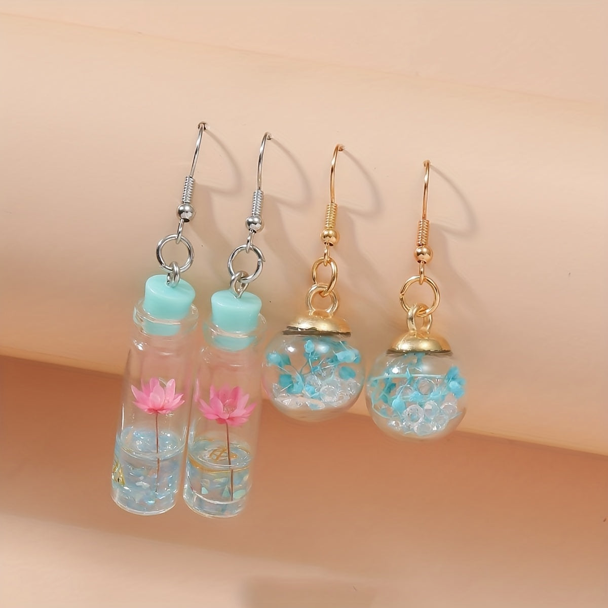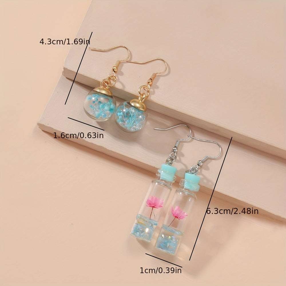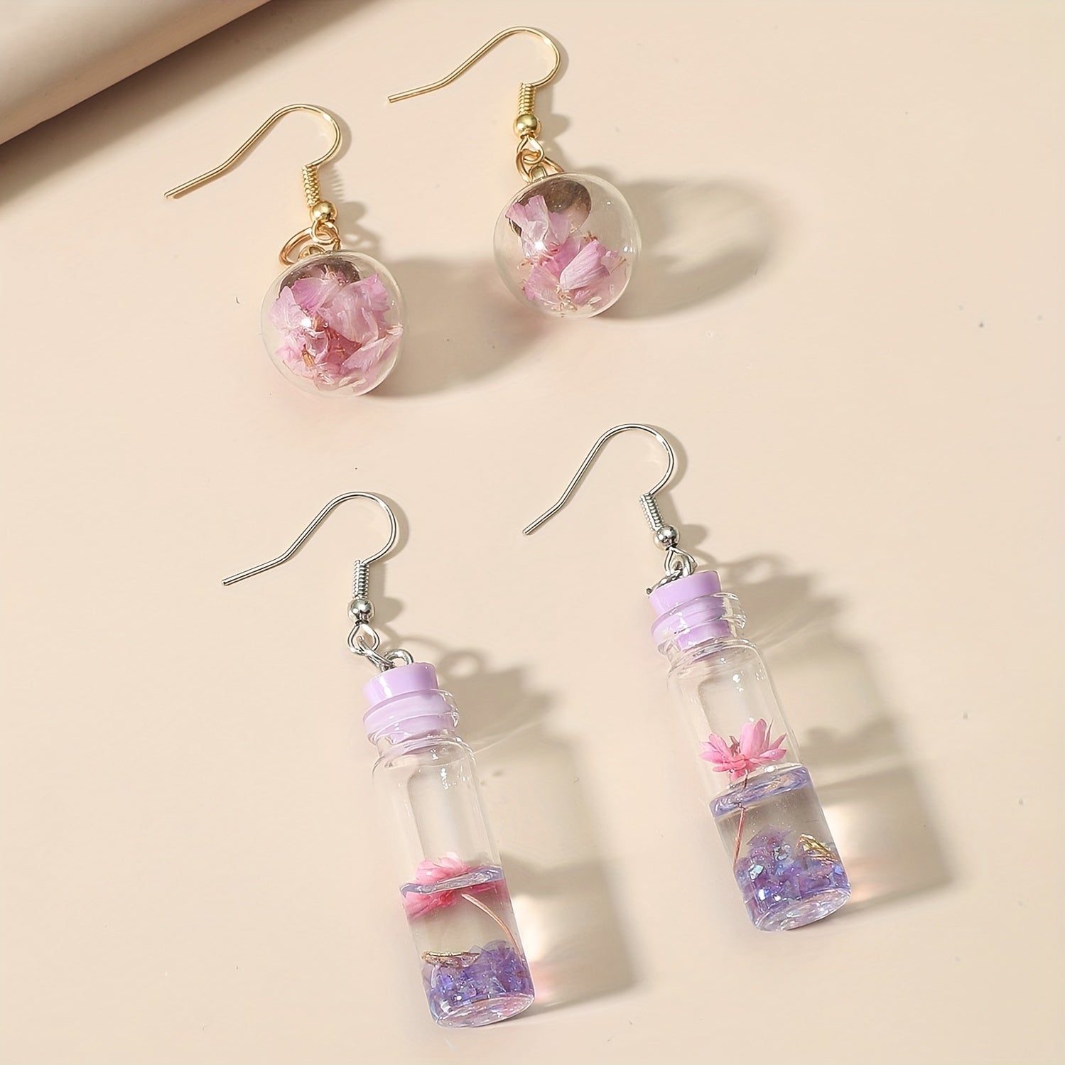 Real Flower Glass Bottle Dangle Earrings 2 Pairs Set