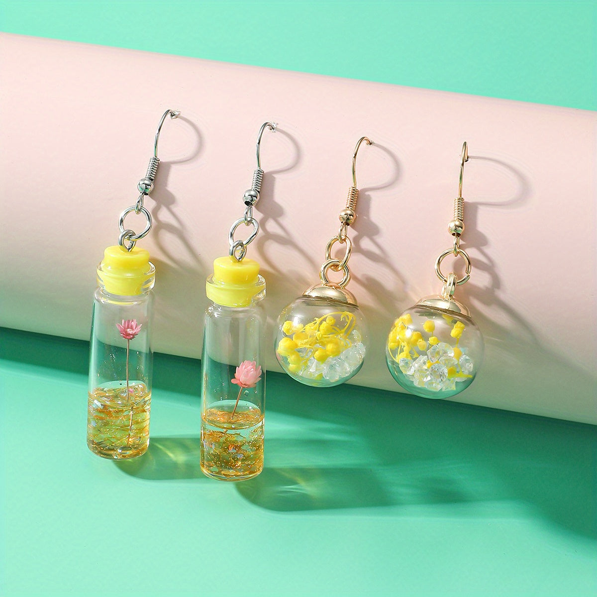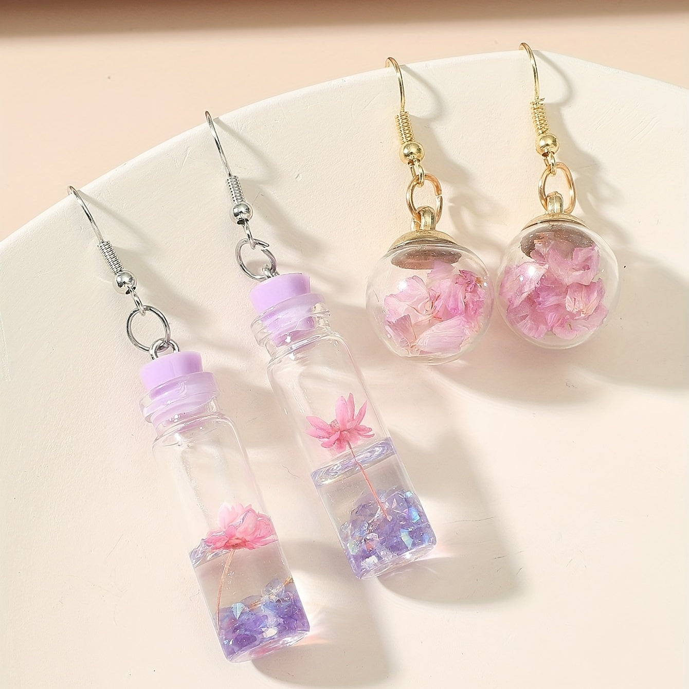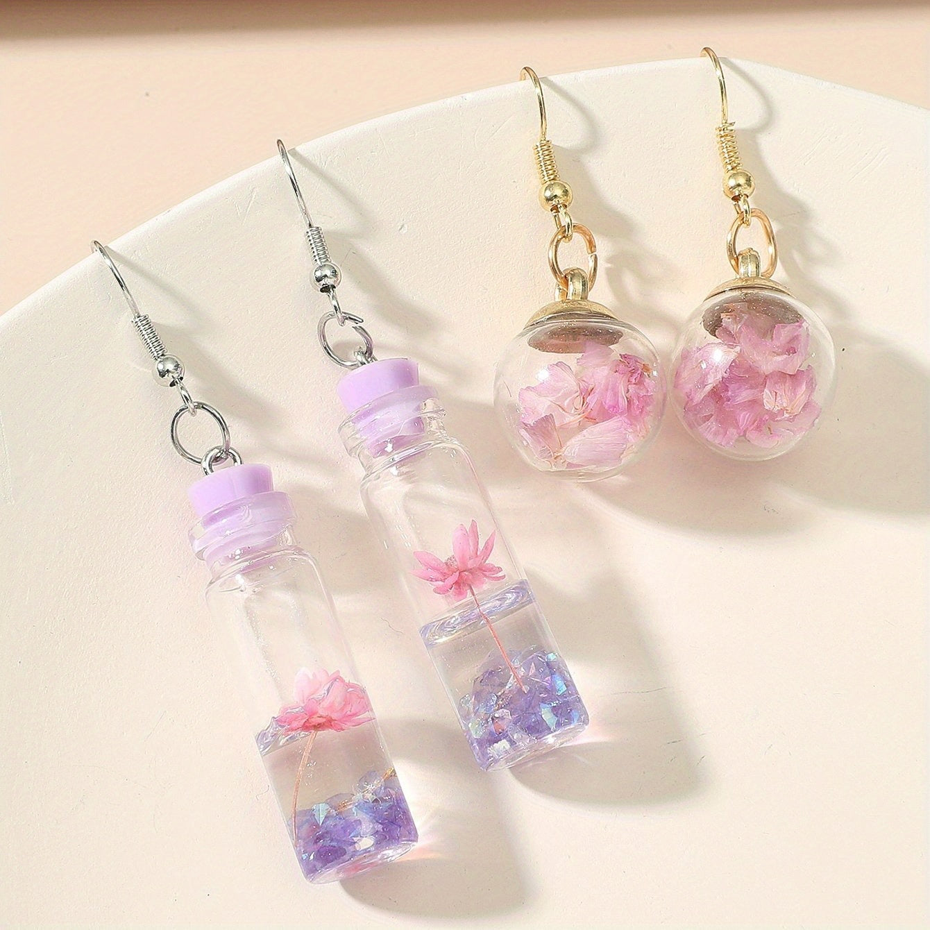 Embrace a leisure style with these unique earrings featuring real dried flowers encased in glass bottles. This creative gift set is perfect for adding a touch of personality to any outfit.