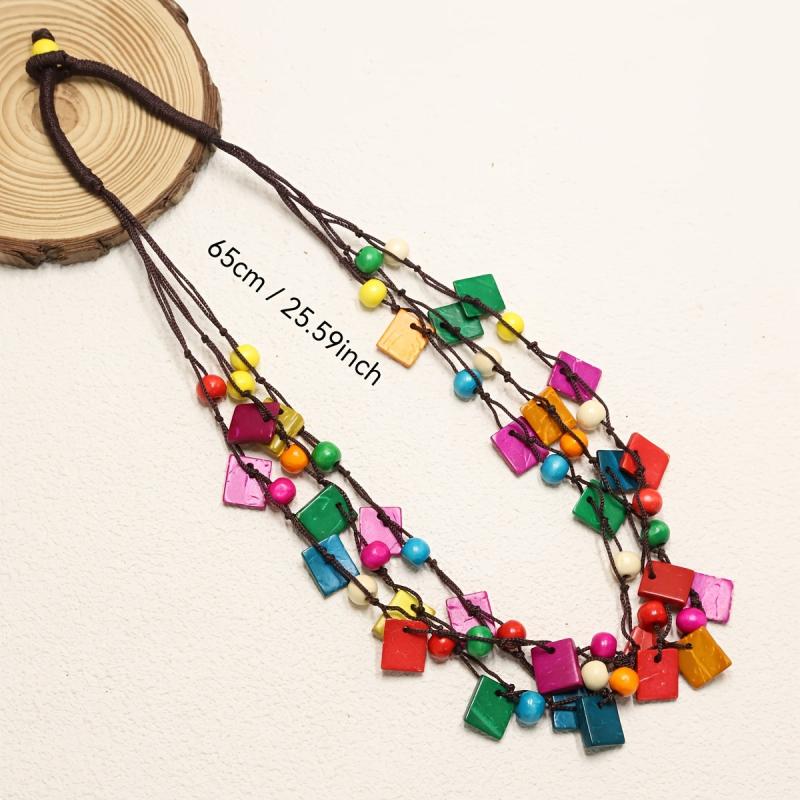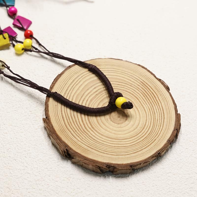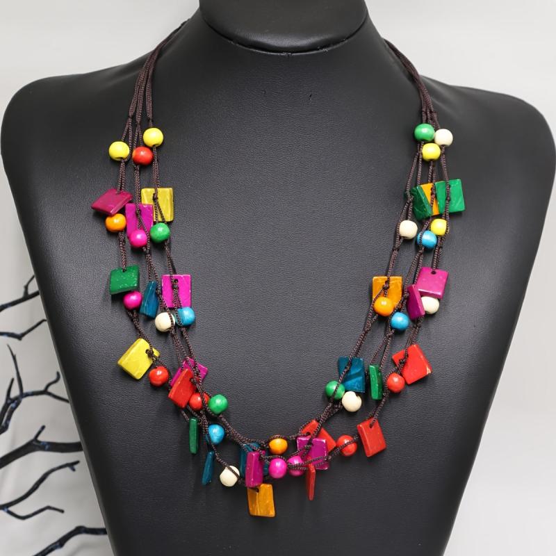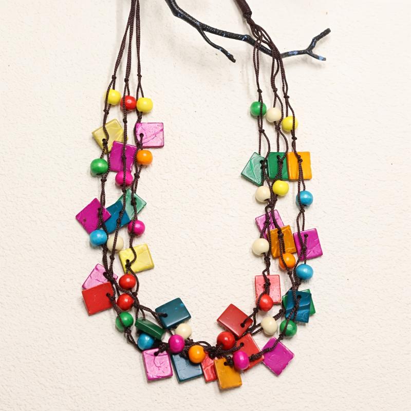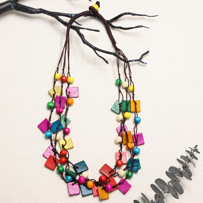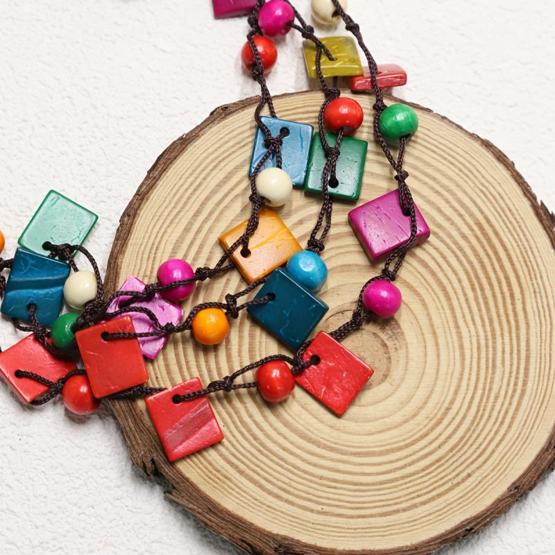 Eco-friendly bohemian necklace with a square pendant, made from recycled wood beads in vibrant colors.