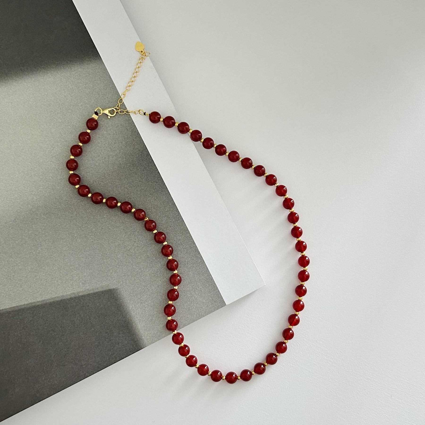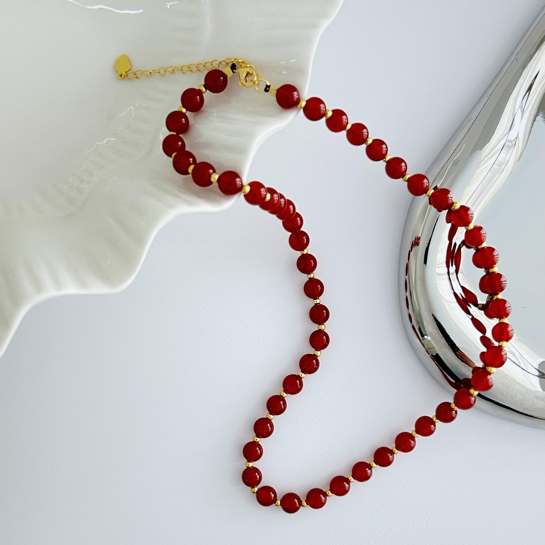 French romantic beaded necklace with red agate, S925 sterling silver, and golden beads. Perfect for festivals, birthdays, parties, and Christmas.