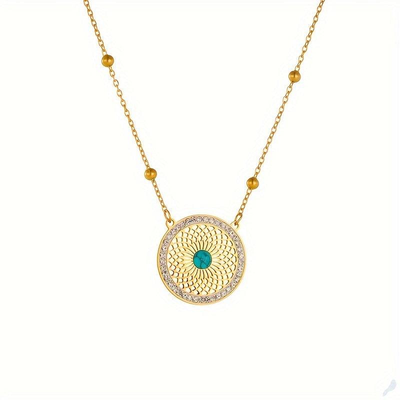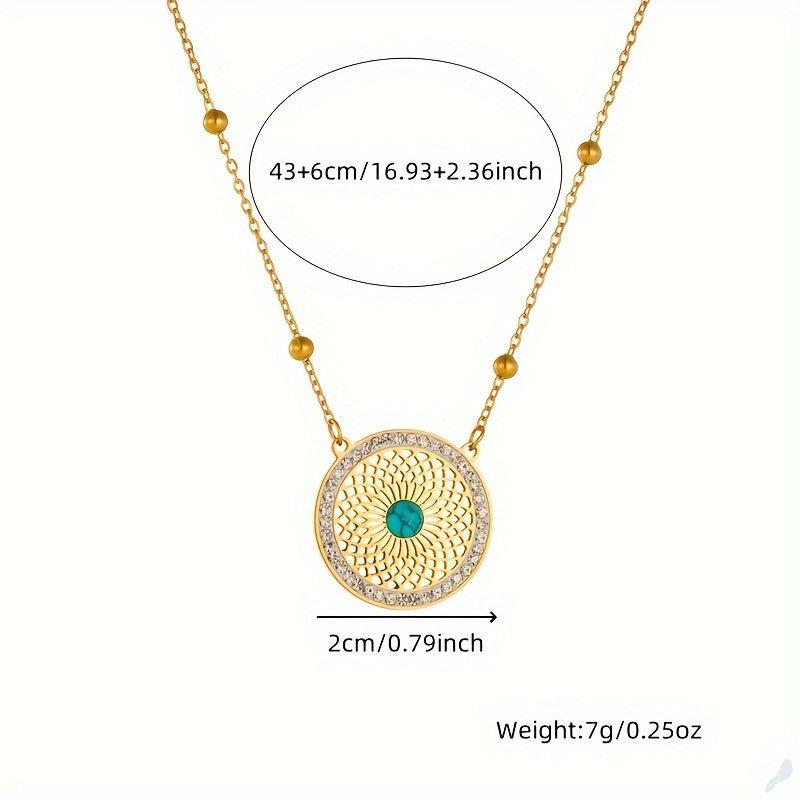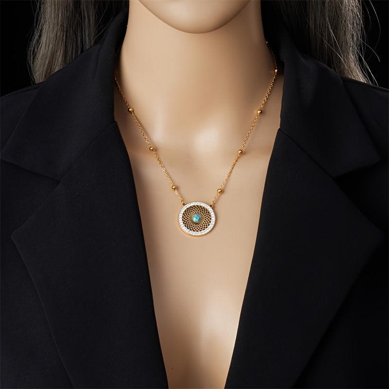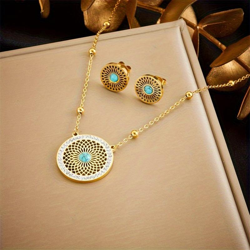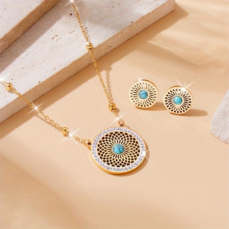 This set features a retro ethnic design with a hollow pattern inlaid with turquoise. The earrings and necklace are made of stainless steel, giving them a durable and stylish look.