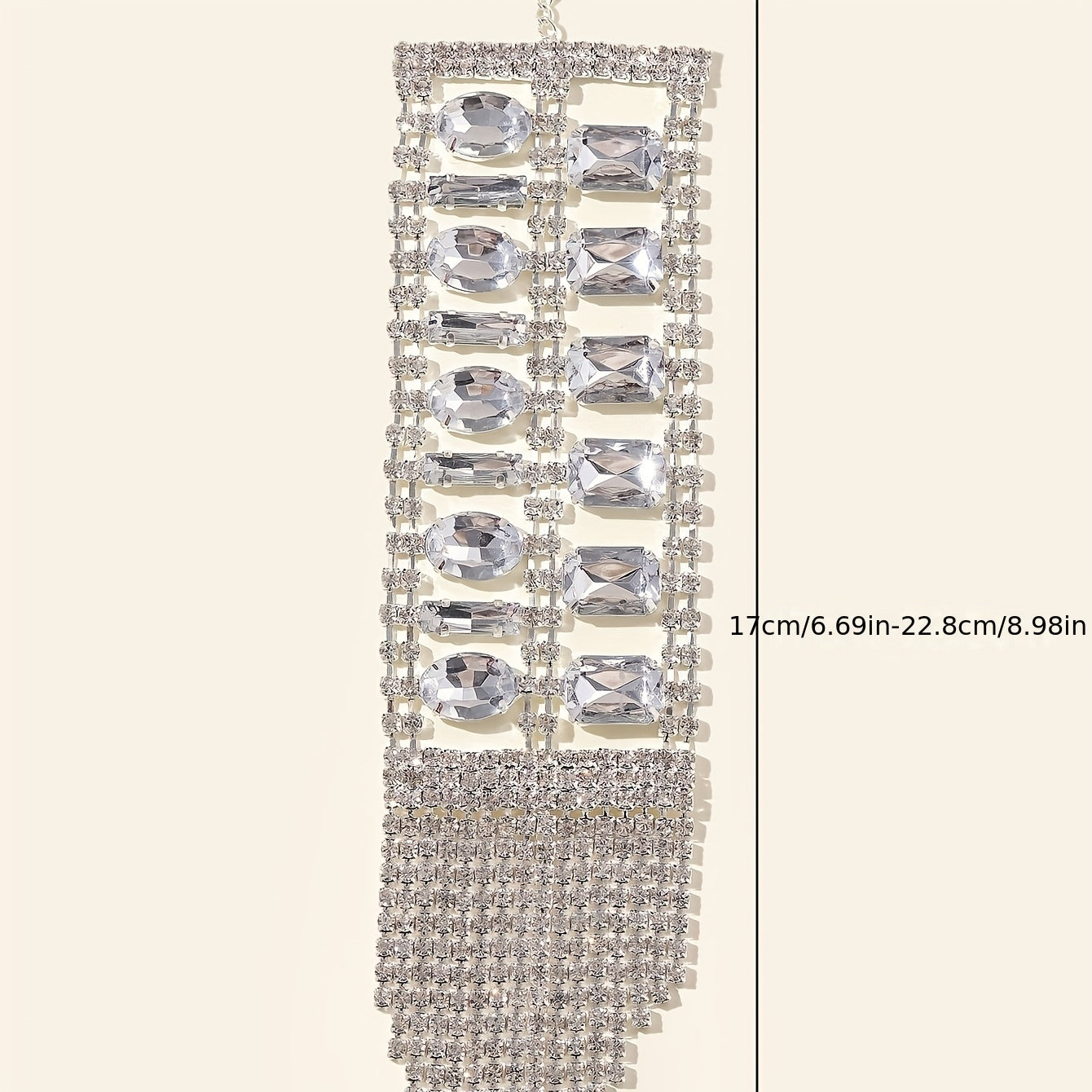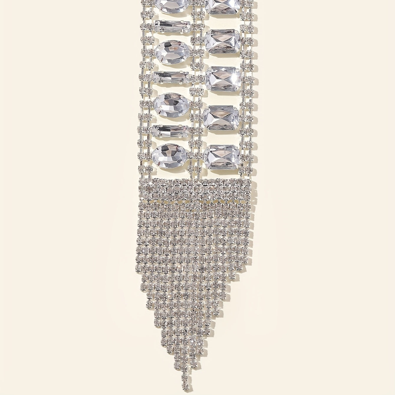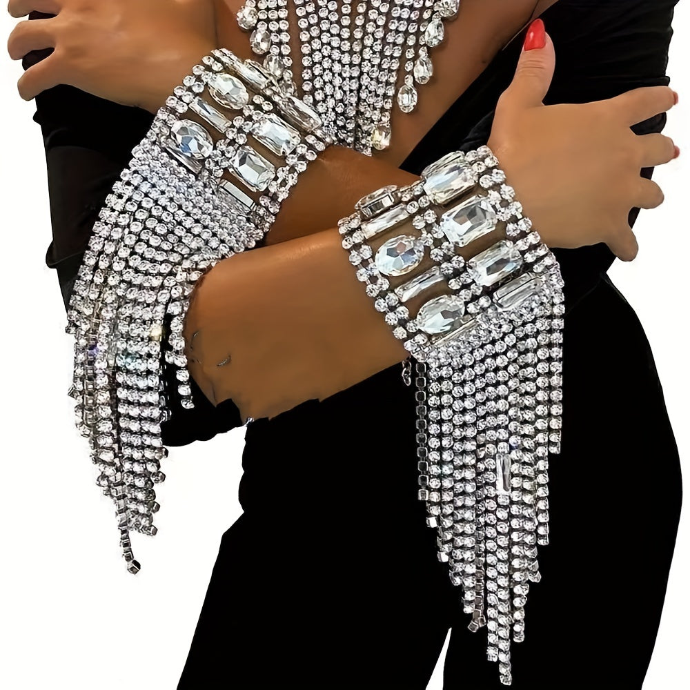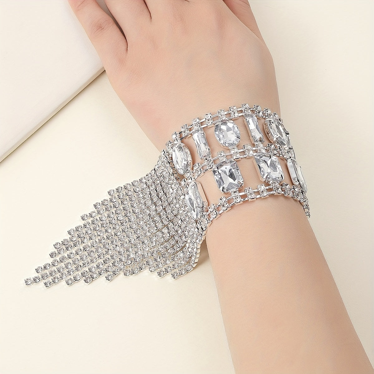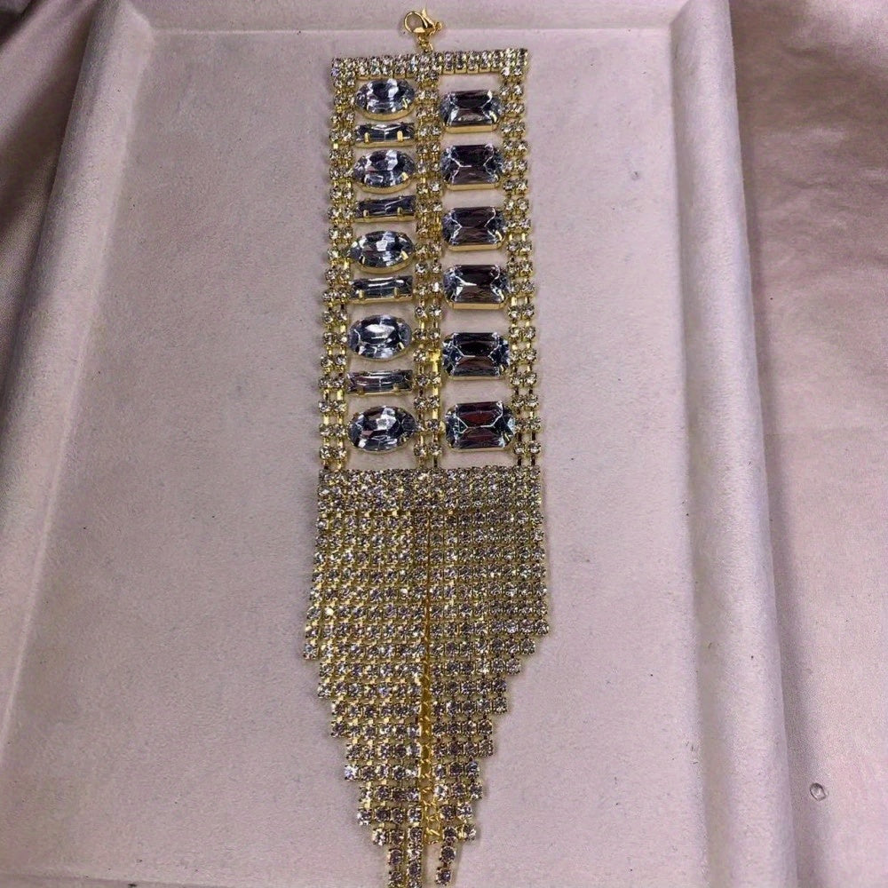 Elegant rhinestone hand bracelet with long fringes, perfect for weddings and special occasions.