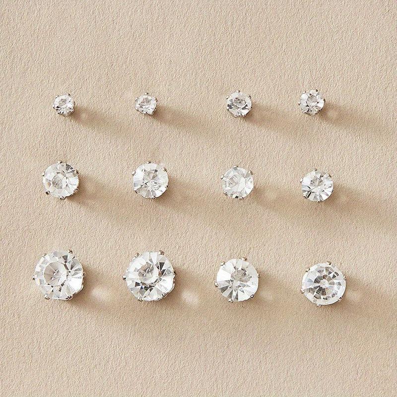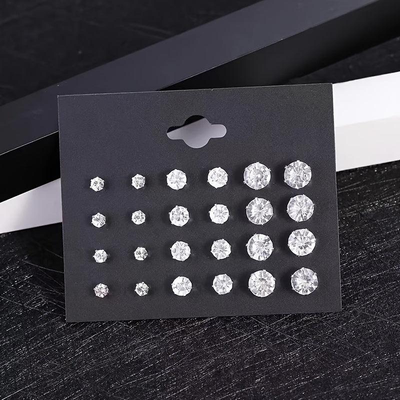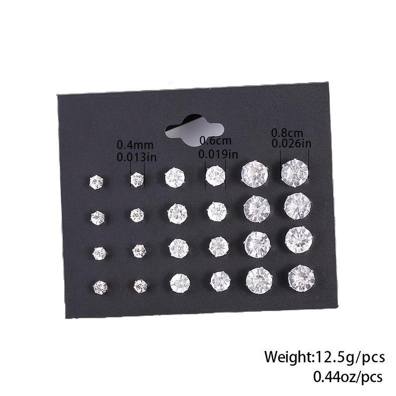 Enhance your style with this pack of 12 pairs of silver-plated Zircon inlaid earrings featuring a round design with 6 claws for a trendy look.