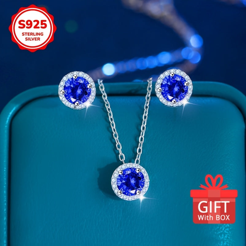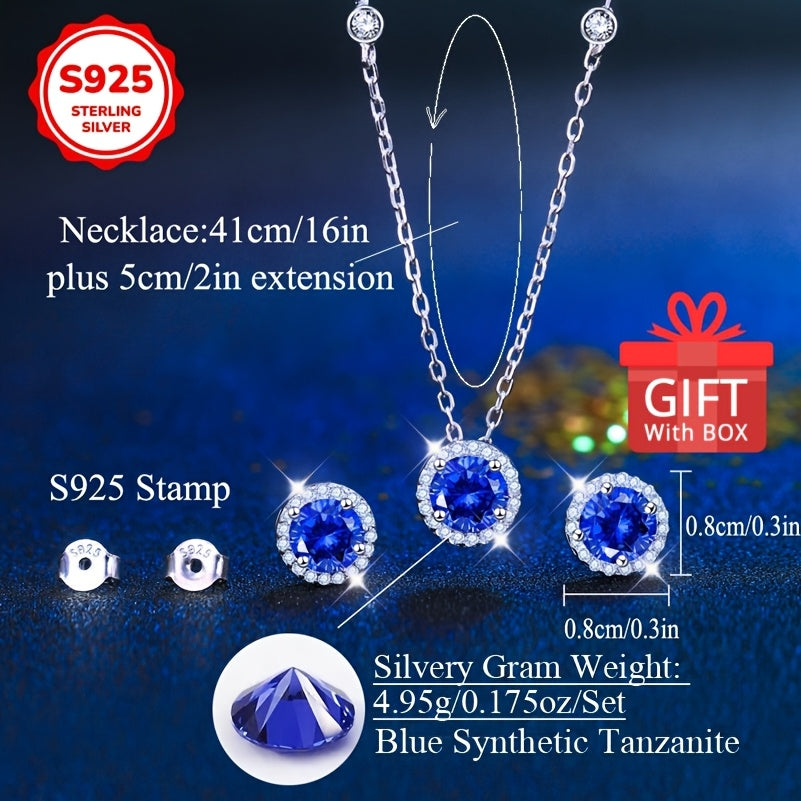 This elegant jewelry set includes 3 earrings and a necklace, all inlaid with synthetic Tanzanite. Perfect for evening parties, this set is made of high-quality 925 sterling silver.
