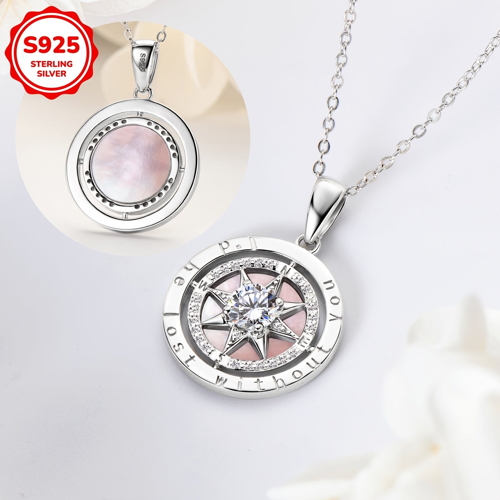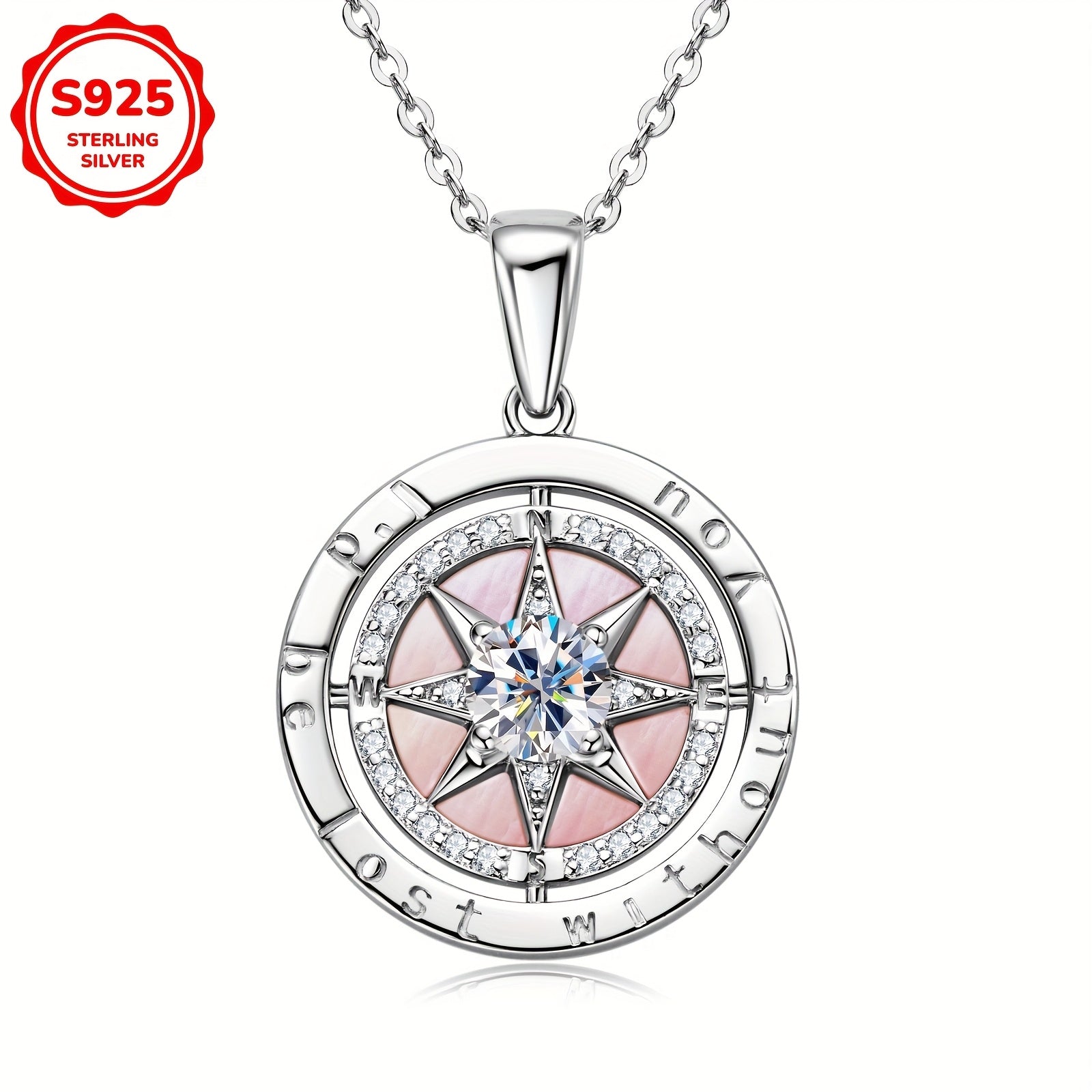 This elegant 5 gram compass pendant necklace is crafted from S925 silver and features a beautiful combination of cubic zirconia and pink mother of pearl. Perfect for gifting to relatives, friends, girlfriends, or as a graduation present.