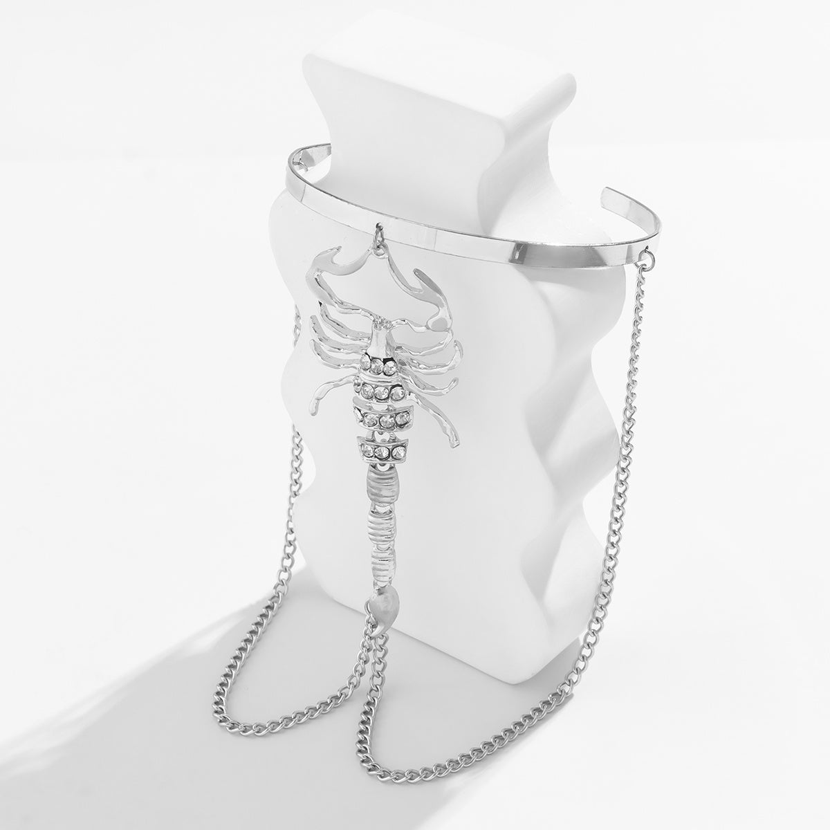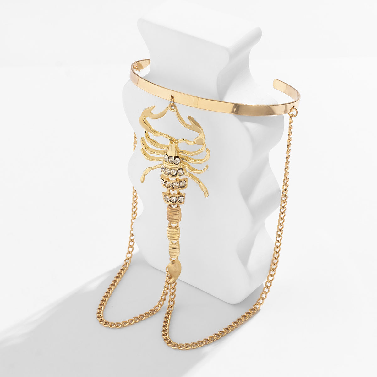 Add a touch of edgy glamour to your outfit with this scorpion and chain rhinestone arm cuff. Perfect for special occasions or a night out.