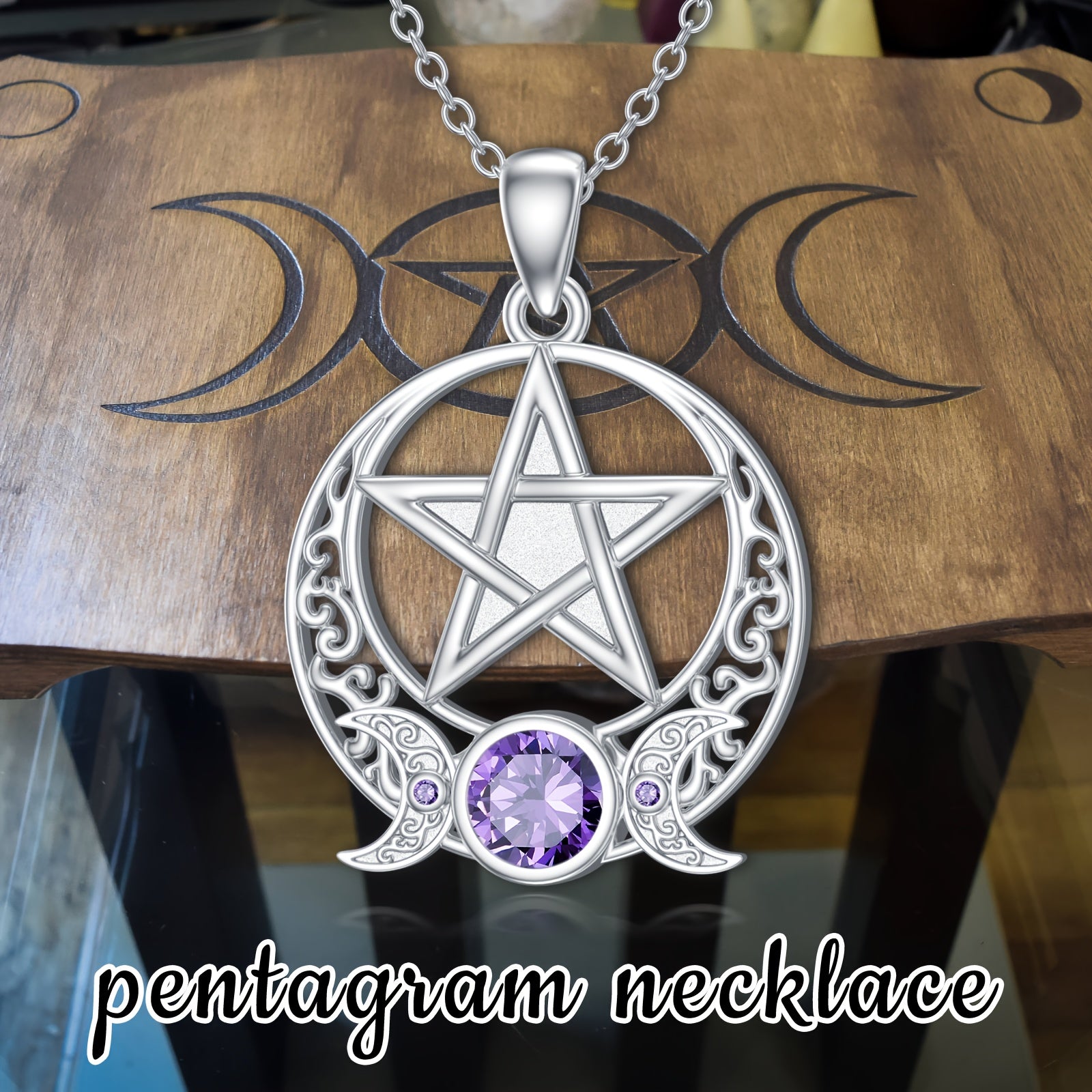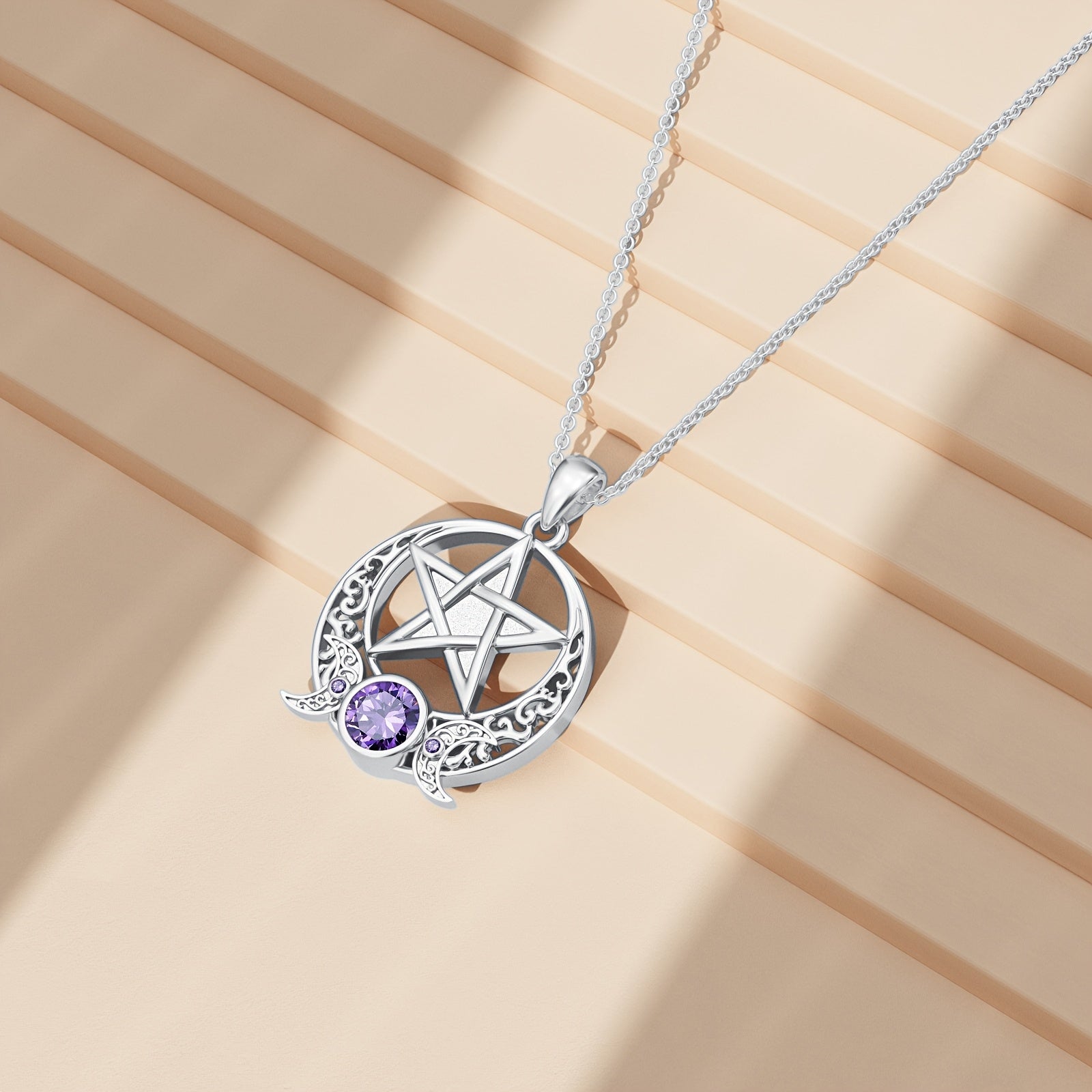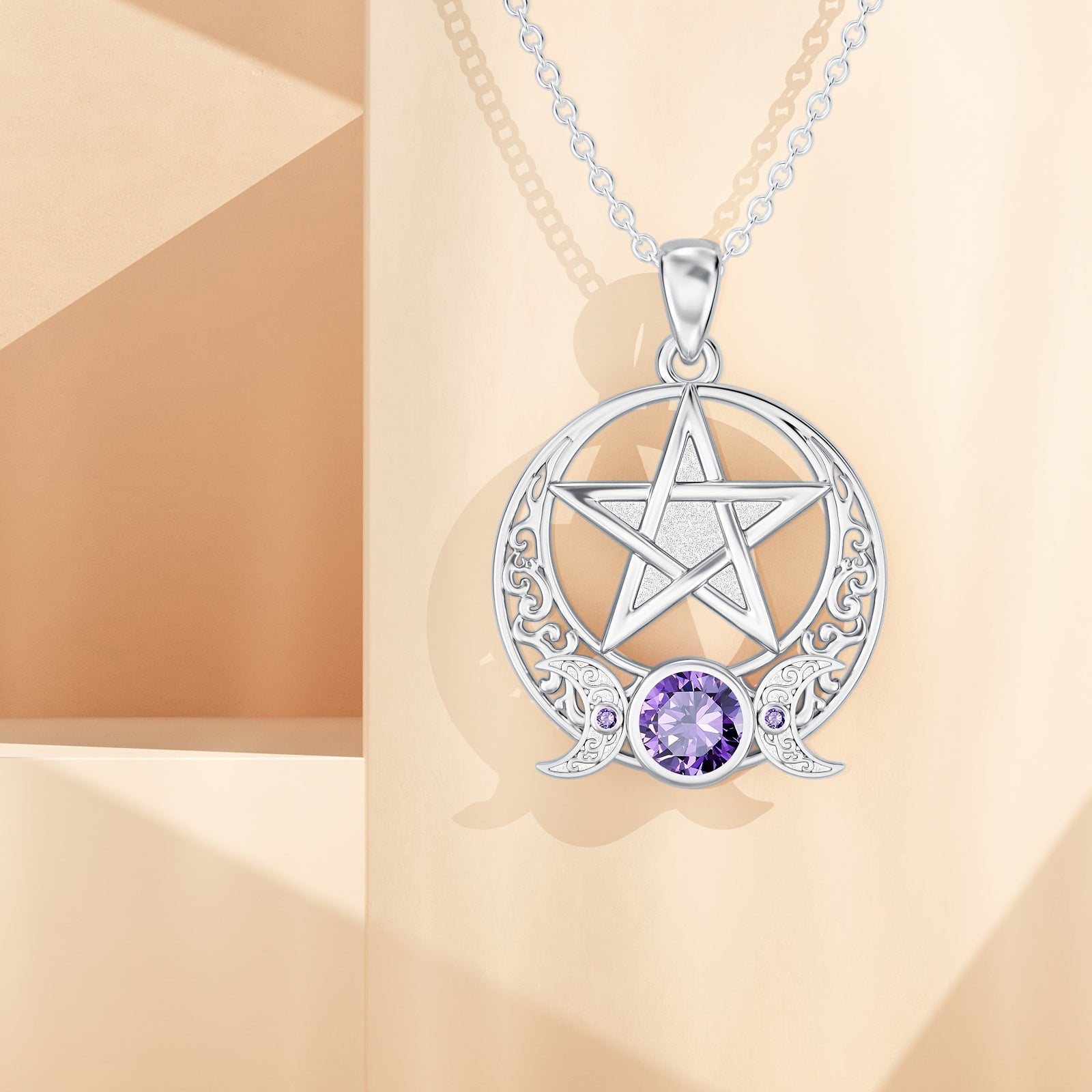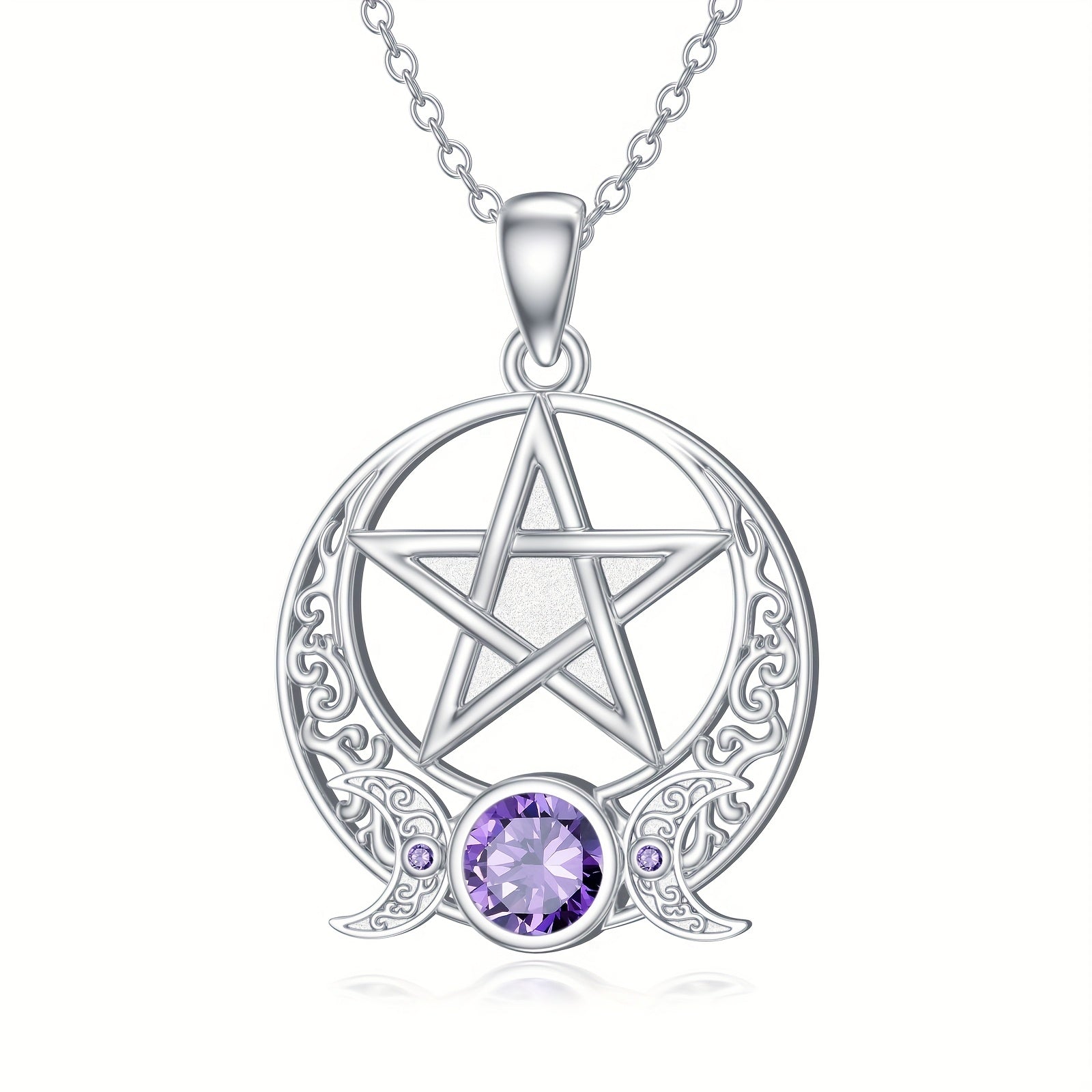 Embrace your inner goddess with this 925 sterling silver pendant necklace featuring a triple moon goddess pentacle design adorned with an amethyst gemstone. Perfect for women practicing Wicca, Paganism, or witchcraft.