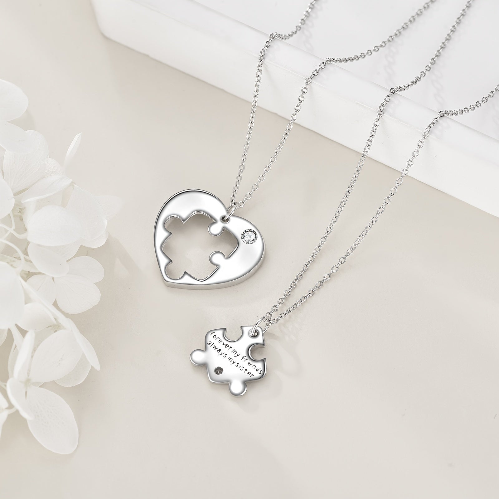 Show your love with this beautiful 925 sterling silver necklace set for 2 sisters. The heart design symbolizes the bond between sisters.
