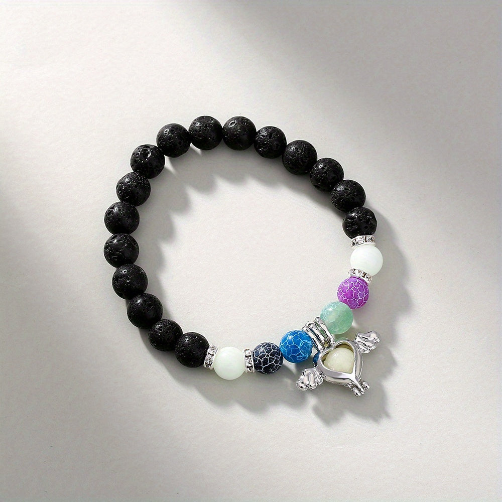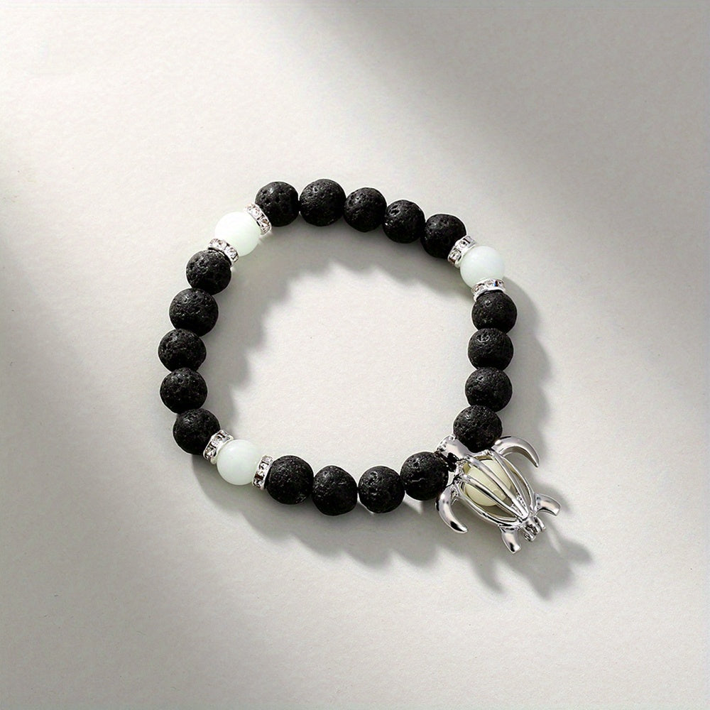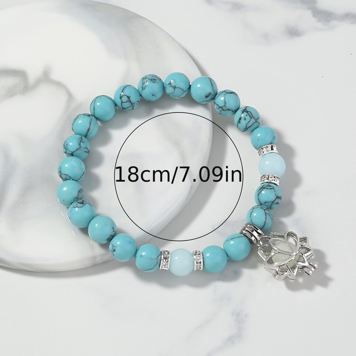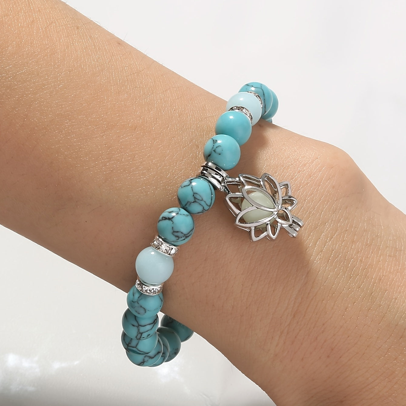 Elegant marbling stone bracelet featuring a hollow lotus shape pendant with luminous glowing beads that illuminate in the dark. Stretchable for a comfortable fit.