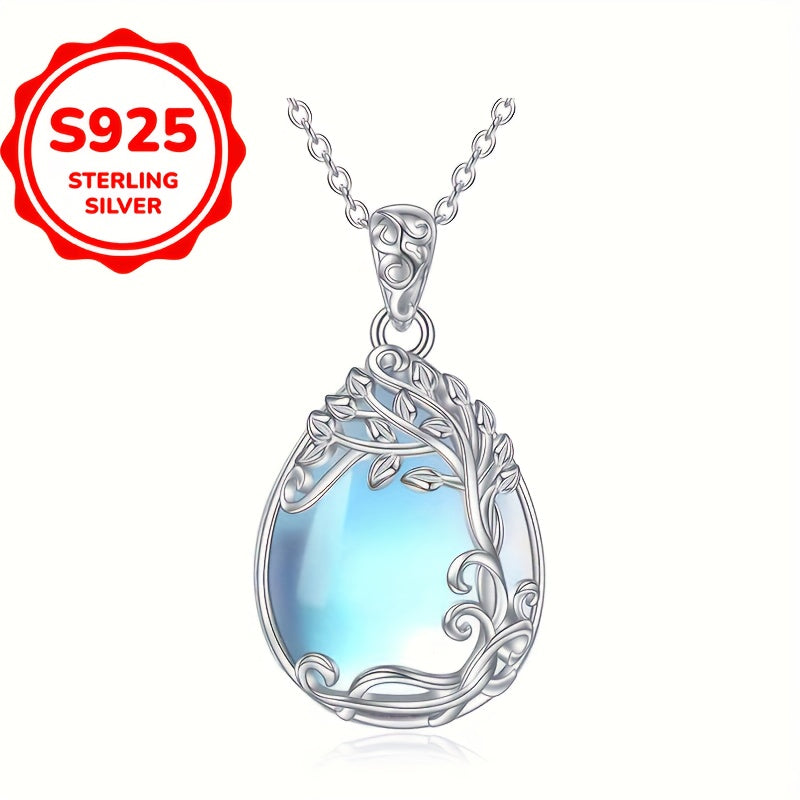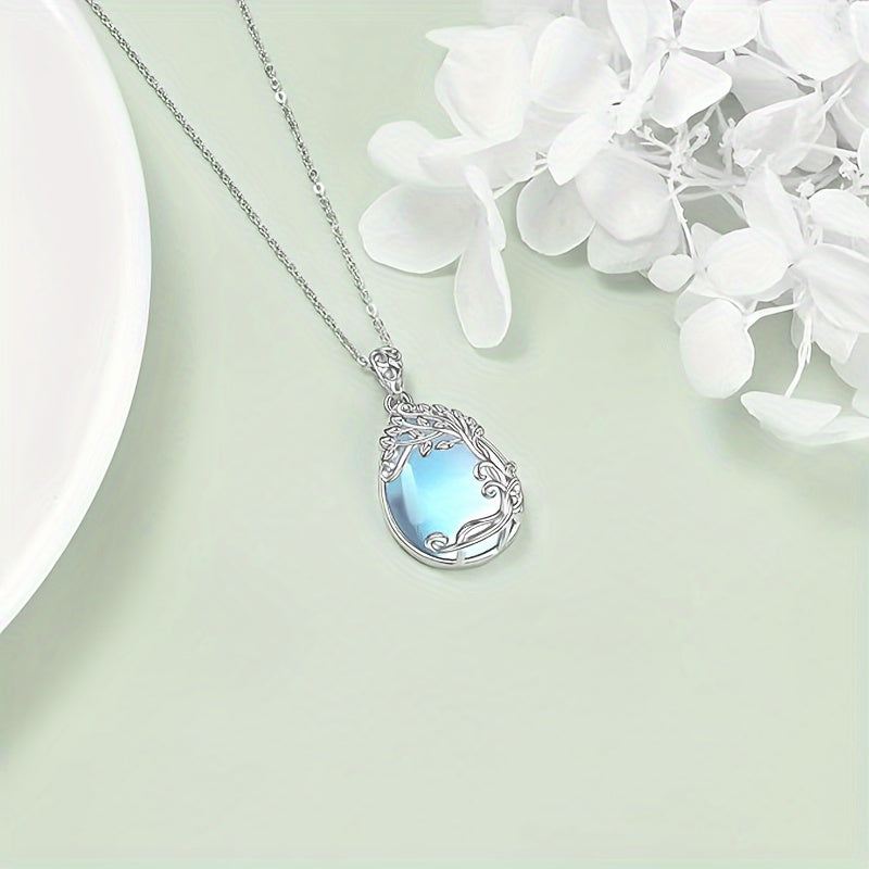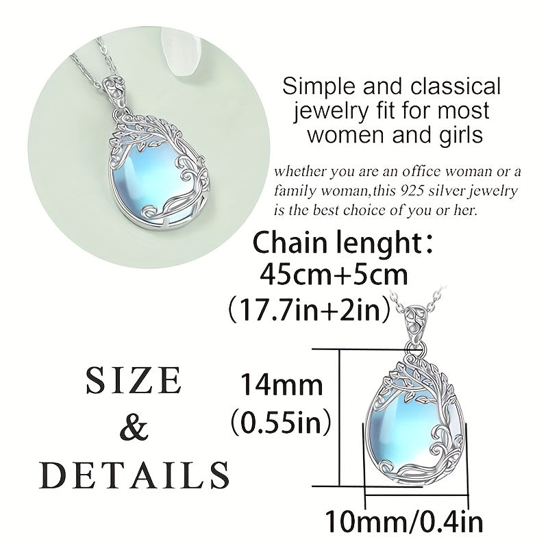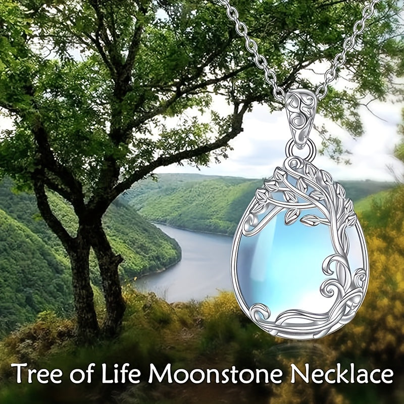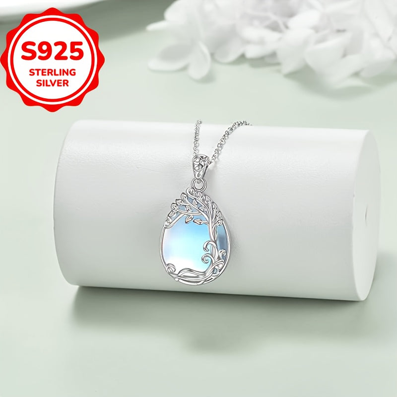 Elegant pendant necklace featuring a Tree of Life design with a teardrop shaped moonstone inlay, made of hypoallergenic S925 sterling silver. Perfect for daily wear and as a thoughtful gift.