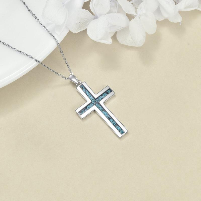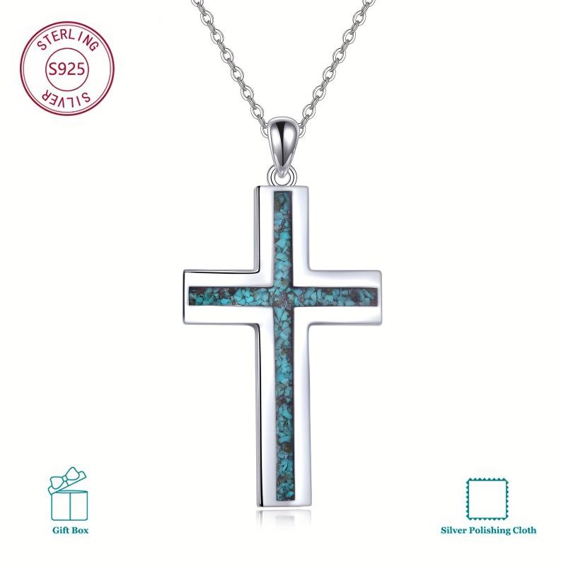 This stunning cross necklace features a turquoise cross pendant crafted in sterling silver, suitable for both men and women.