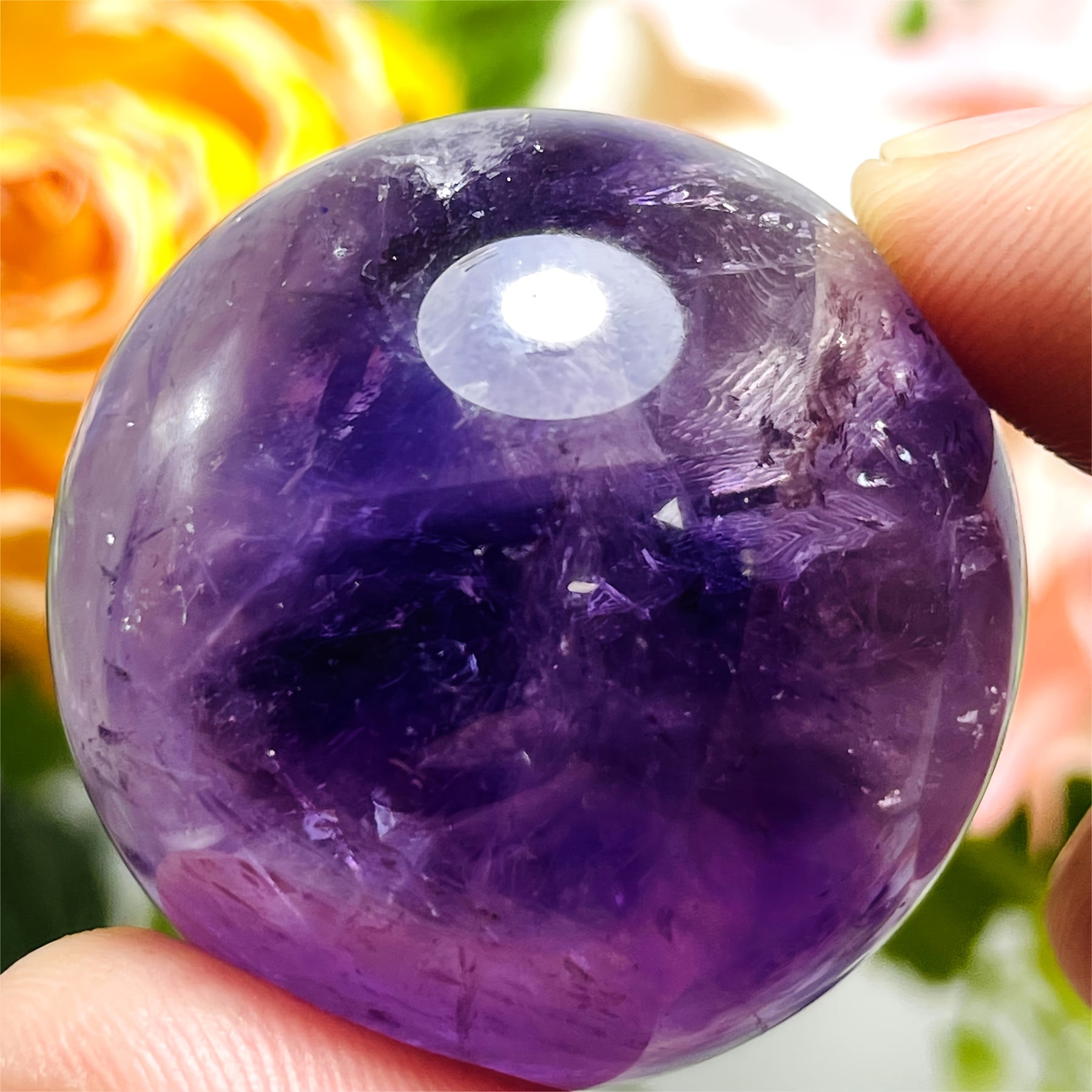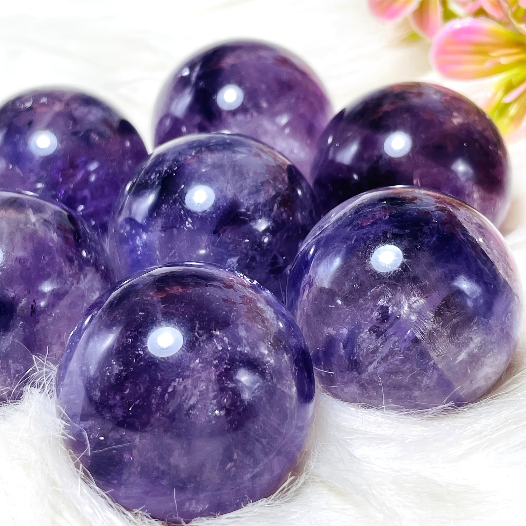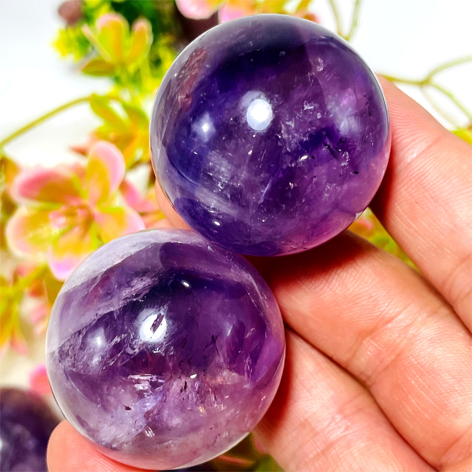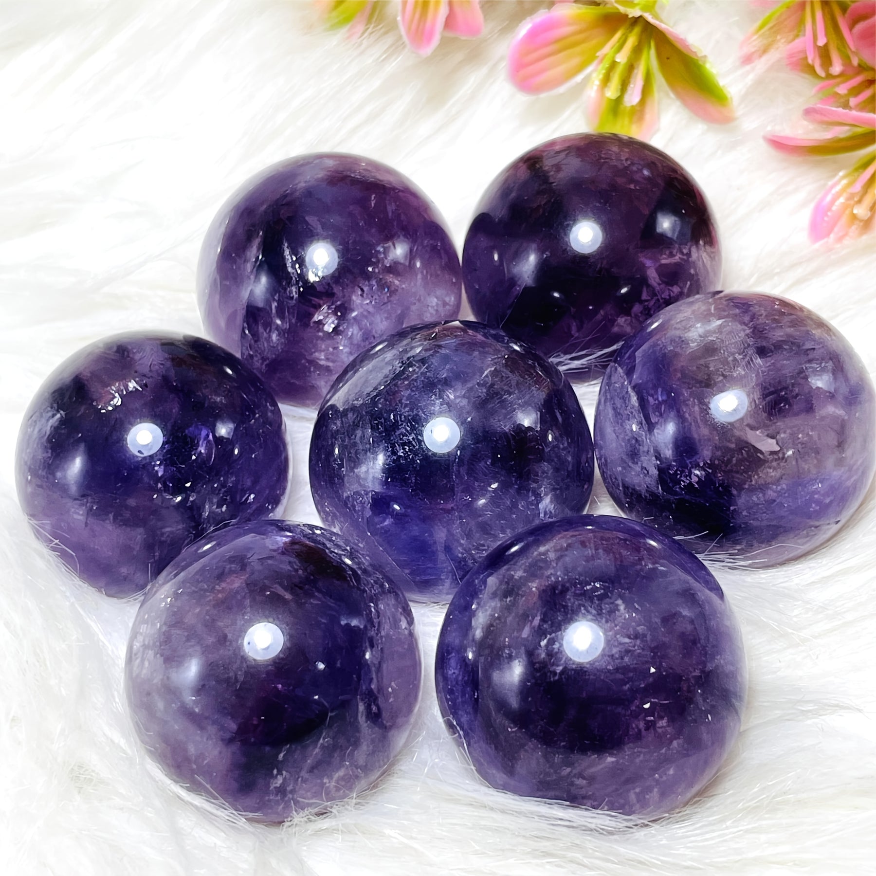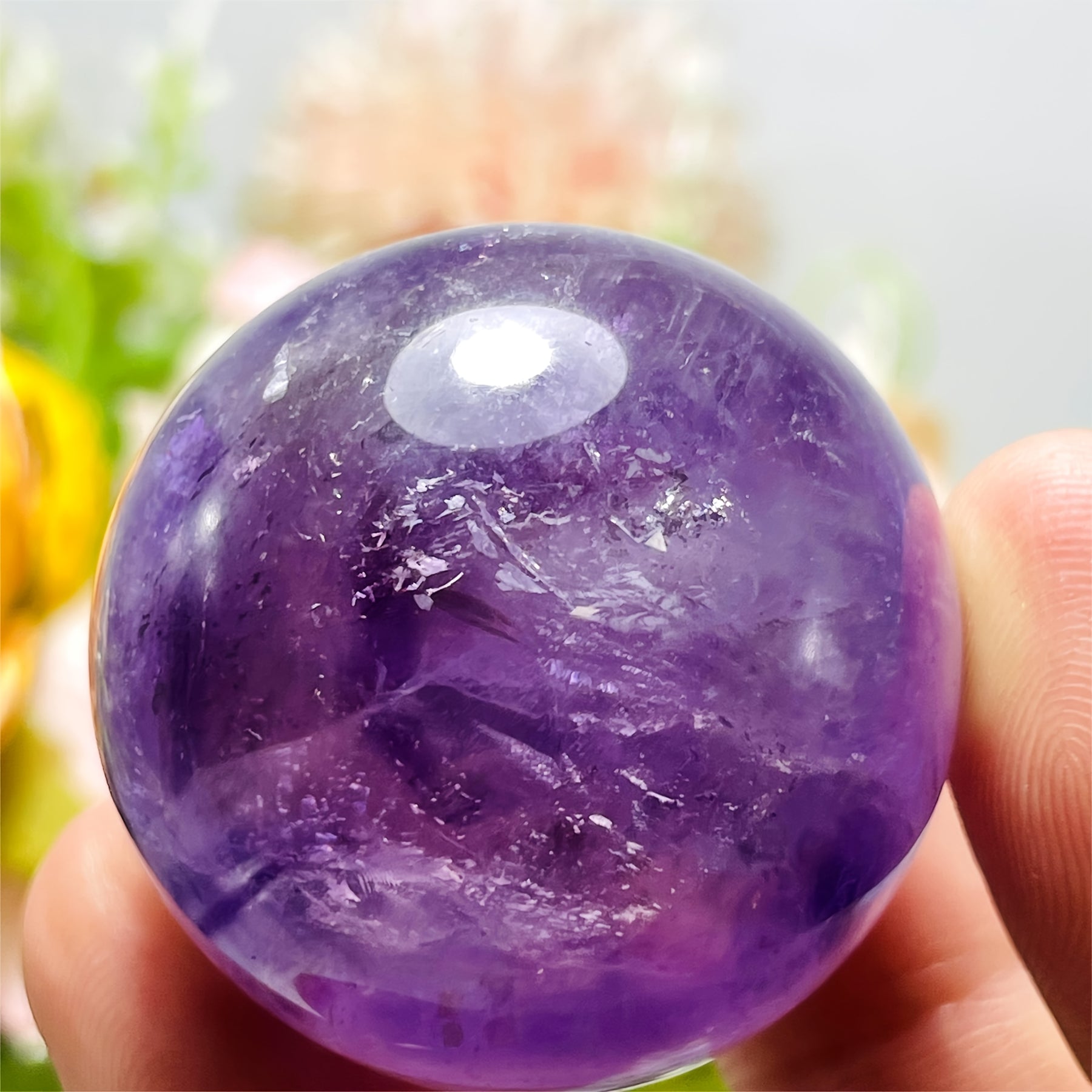 This beautiful amethyst ball is a stunning addition to your home decor. It features a polished crystal sphere with clustered purple faux gemstones, perfect for a bohemian style aesthetic. Makes an ideal gift for crystal lovers.