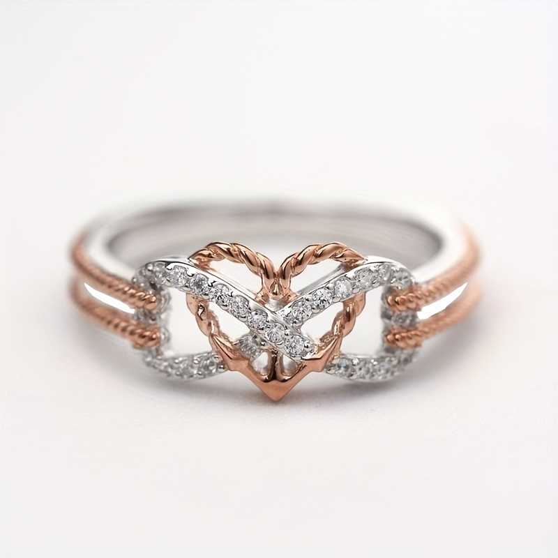 Bague pour femme en or rose avec cœur entrelacé et zircone cubique