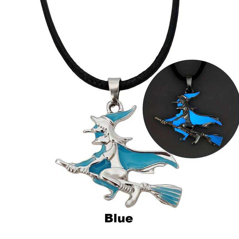 Pendentif sorcière volant sur un balai avec collier en cuir synthétique
