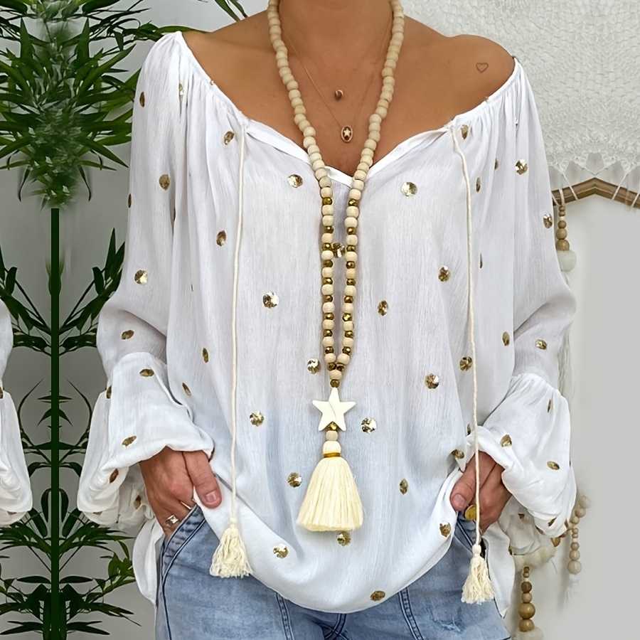 Capturez l'essence de l'élégance bohème avec notre collier pendentif en forme d'étoile en perles de bois turquoise blanche. Cette pièce exquise mélange harmonieusement des éléments naturels avec une touche de charme céleste, créant un accessoire unique et accrocheur. Le collier est doté d'un collier de perles de bois polies en douceur, ajoutant une touche terreuse et organique au design. Entre les perles de bois se trouvent des accents de turquoise blanche, invoquant un sentiment de sérénité et de tranquillité. L'utilisation de turquoise blanche contribue non seulement à l'attrait esthétique, mais apporte également une touche subtile de sophistication à l'apparence générale. Au centre de l'attention se trouve un pendentif en forme d'étoile rayonnante, fabriqué avec des détails méticuleux. L'étoile symbolise la beauté cosmique et ajoute une touche céleste au collier. La combinaison des perles de bois, de la turquoise blanche et du pendentif en étoile crée un mélange harmonieux d'éléments naturels et célestes, ce qui en fait un accessoire polyvalent adapté à diverses occasions. Le collier est complété par un pompon gracieusement suspendu, ajoutant du mouvement et un charme ludique à la pièce. Le pompon rehausse l'ambiance bohème, créant un look chic et libre d'esprit sans effort. Le choix des matériaux et l'attention portée aux détails dans l'artisanat font de ce collier un accessoire remarquable qui peut rehausser votre style sans effort. Qu'il soit porté avec une tenue décontractée pour ajouter une touche de chic bohème à votre look quotidien ou associé à un ensemble élégant pour une occasion spéciale, ce collier pendentif à pompon en forme d'étoile en perles de bois blanc turquoise est une pièce phare qui reflète votre sens unique du style et votre appréciation de la beauté de la nature et du cosmos.