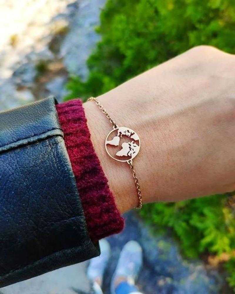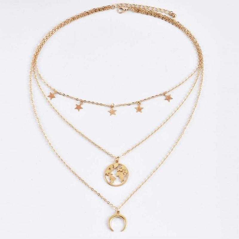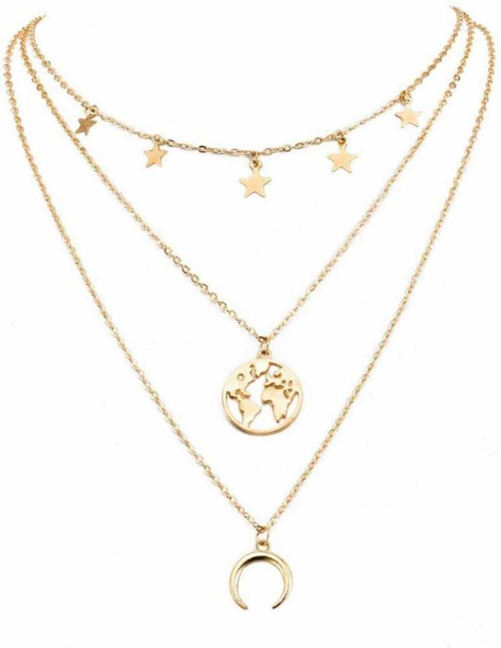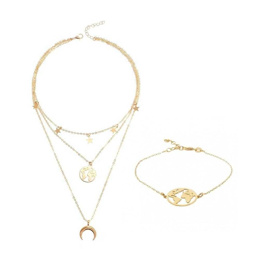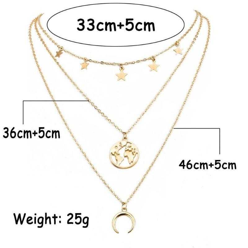 Cet ensemble comprend un collier multicouche orné d'un pendentif carte du monde et d'un bracelet à breloques assorti, créant un look cohérent et éclectique. Le collier multicouche intègre diverses chaînes, perles et breloques, chaque couche contribuant à l'esthétique bohème-chic globale. La pièce maîtresse est un pendentif carte du monde détaillé, symbolisant l'amour de l'exploration et de l'aventure mondiale. Le savoir-faire complexe du pendentif ajoute une touche de sophistication au design décontracté et insouciant. En complément du collier, le bracelet à breloques présente un assortiment de breloques fantaisistes et d'inspiration bohème. Ceux-ci peuvent inclure des symboles comme des plumes, des perles ou d'autres éléments éclectiques qui renforcent l'ambiance générale d'esprit libre. L'ensemble offre une option d'accessoire polyvalente et expressive, vous permettant de mettre en valeur votre individualité et votre amour pour le style non conventionnel. Portez le collier et le bracelet ensemble pour un look coordonné ou mélangez-les avec d'autres pièces pour créer un ensemble bohème personnalisé. Idéal pour les sorties décontractées, les festivals de musique ou toute occasion où vous souhaitez insuffler à votre style un sens de l'aventure, le collier multicouche Boho pour femme avec pendentif carte du monde et bracelet à breloques est un ajout ravissant à votre collection de bijoux. Adoptez l'esprit bohème et faites une déclaration de mode audacieuse avec cet ensemble au design unique. Le collier à trois couches présente des étoiles, un croissant de lune et une carte du monde sur chaque couche. Le bracelet a un motif de carte du monde. Parez-vous de cette pièce de déclaration et faites sensation toute la journée.Inscrivez-vous pour recevoir votre cadeau de bienvenue Bling Queen et soyez le premier informé des cadeaux, des offres VIP et plus encore