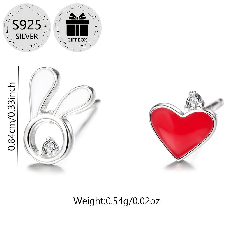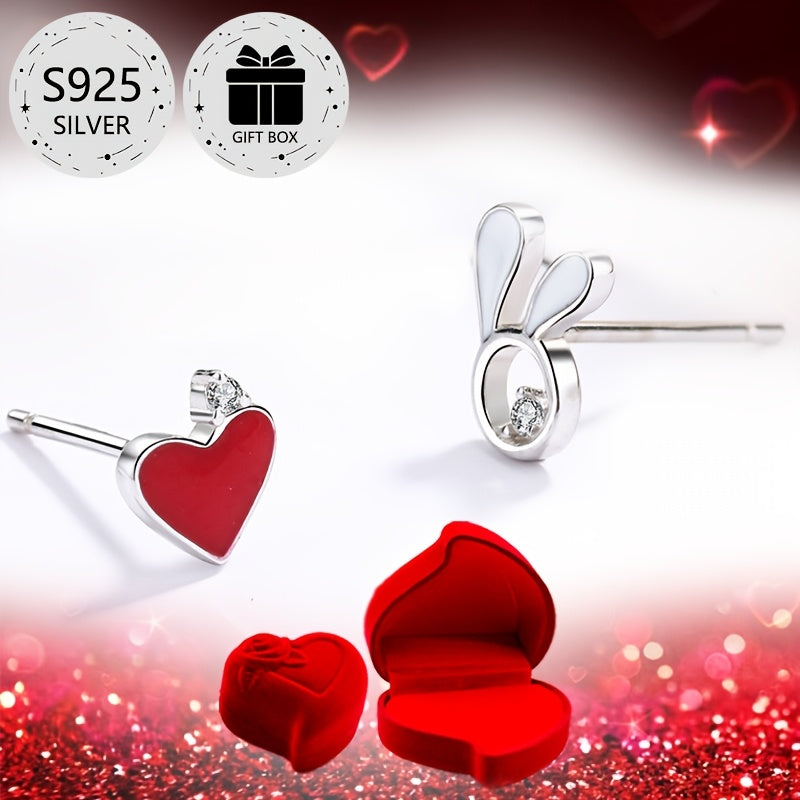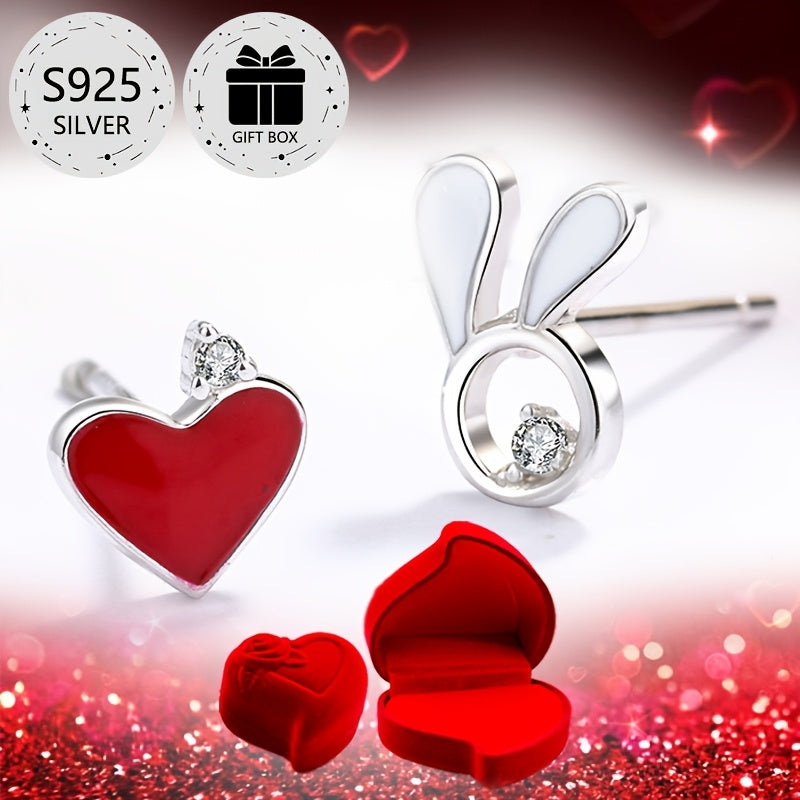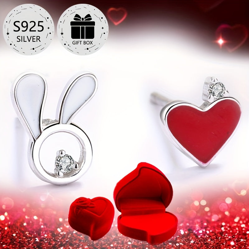 These sterling silver stud earrings feature cute rabbit and heart designs with resin inlay, perfect for daily wear or gifting on any occasion. Ideal for Valentine's Day and all seasons.