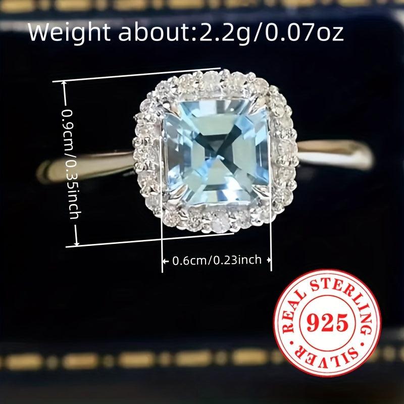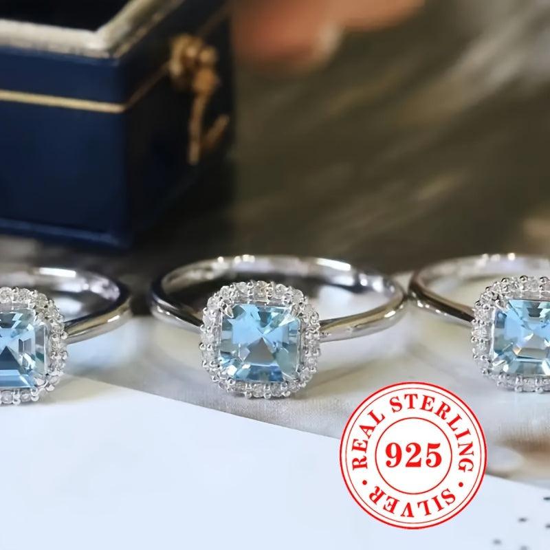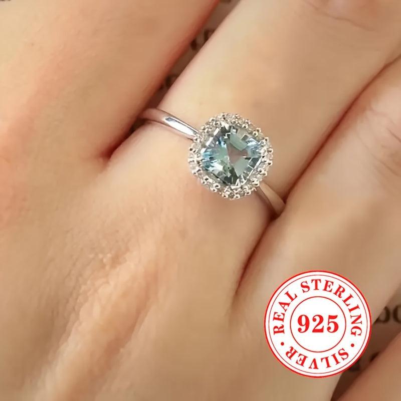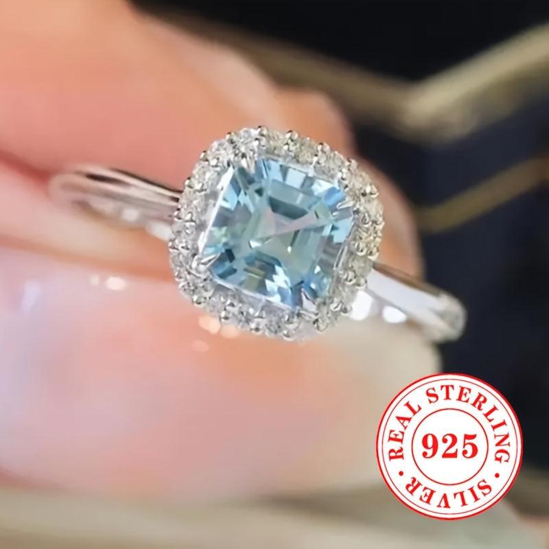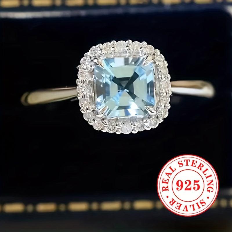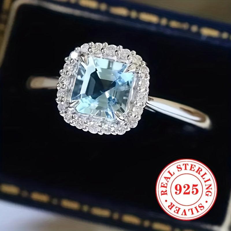 This stunning engagement ring features a princess-cut zirconia stone set in a four-prong setting. The ring is made of high-quality 925 silver and is the perfect choice for a March birthday or special occasion.