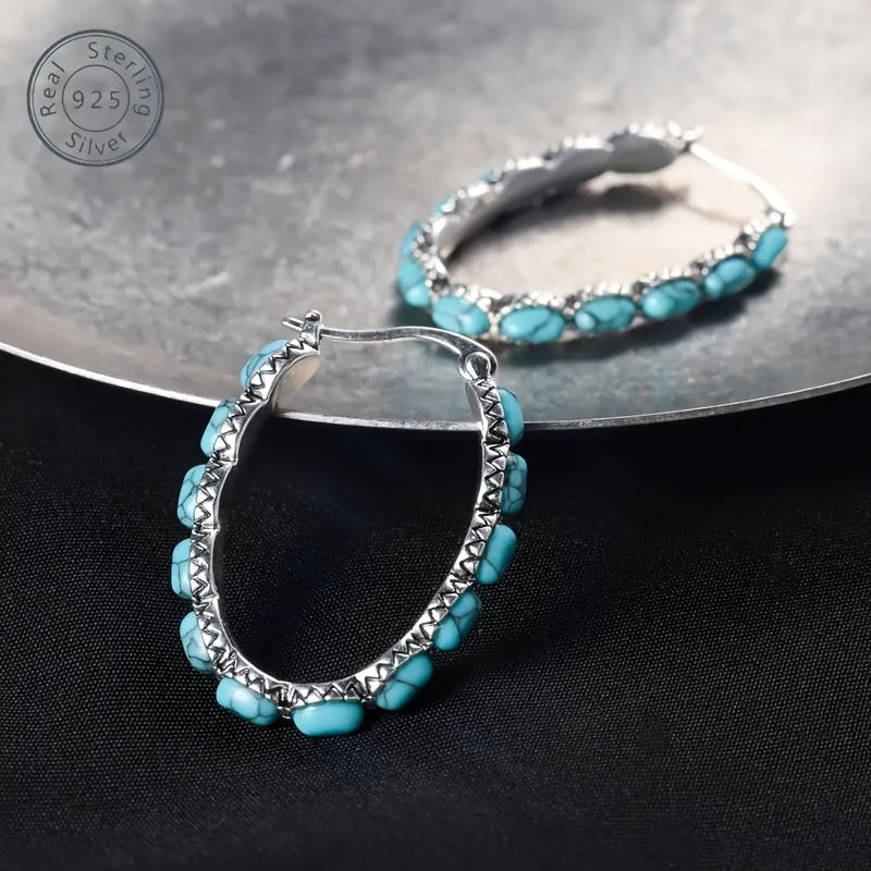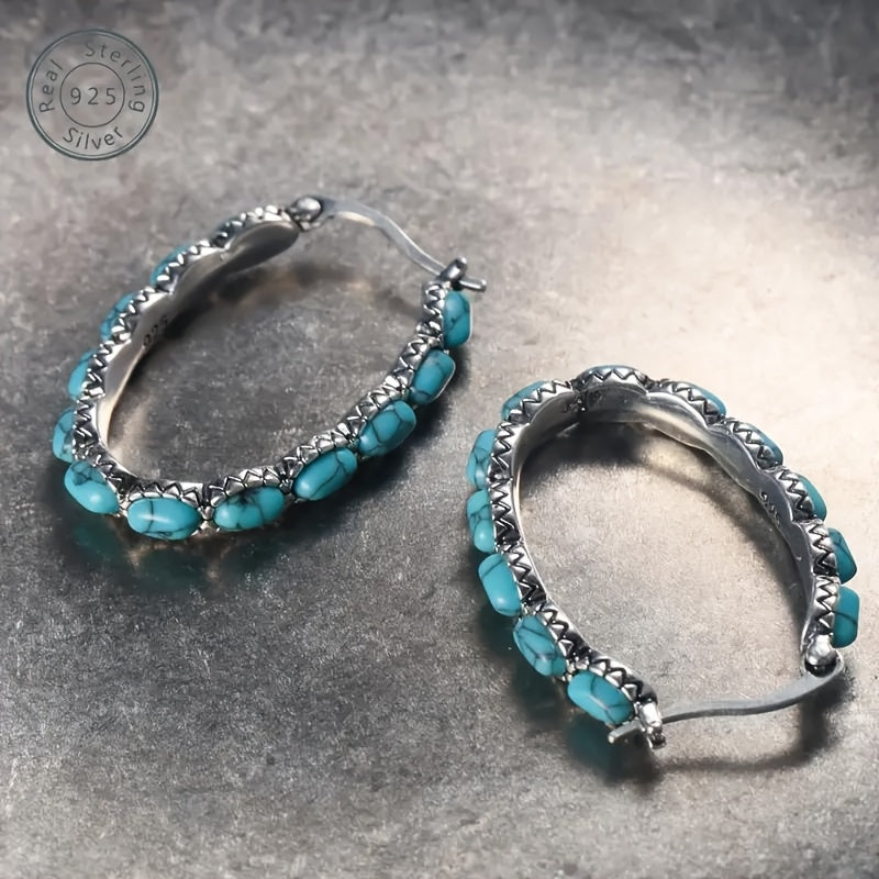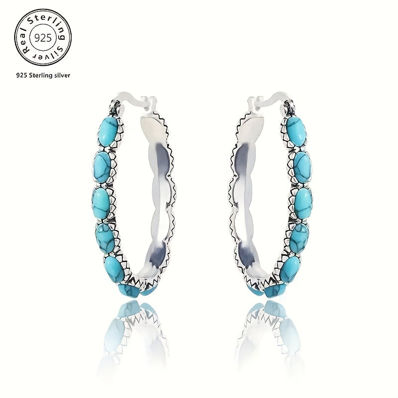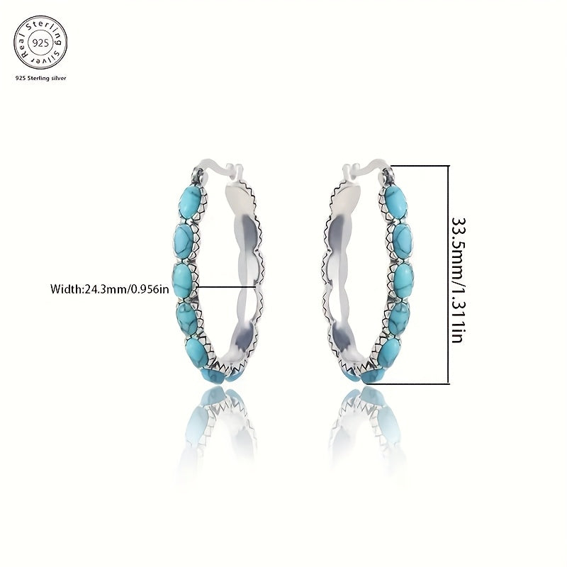Exquisite 925 silver hoop earrings with a touch of ethnic style and turquoise accents. Perfect for weddings, banquets, anniversaries, or as a gift for girlfriend, mother.