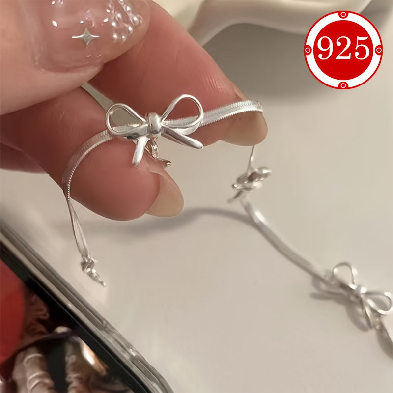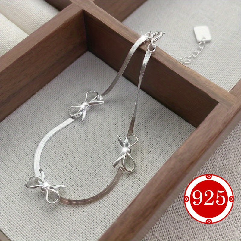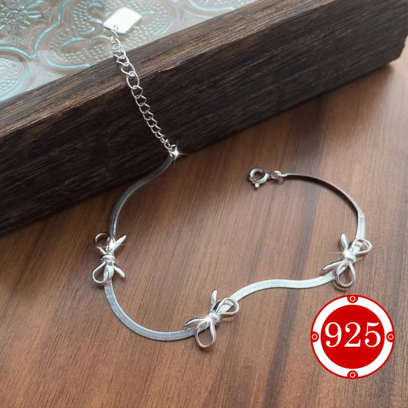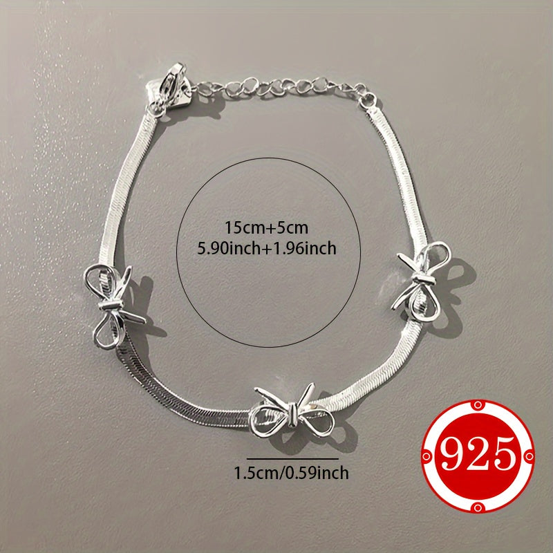 This 925 silver bracelet features a delicate snake bone chain with a bow ballet style design. It is a perfect hand ornament gift for couples, friends, daily wear, or weddings. The bracelet is hypoallergenic and suitable for those with low allergy sensitivity.